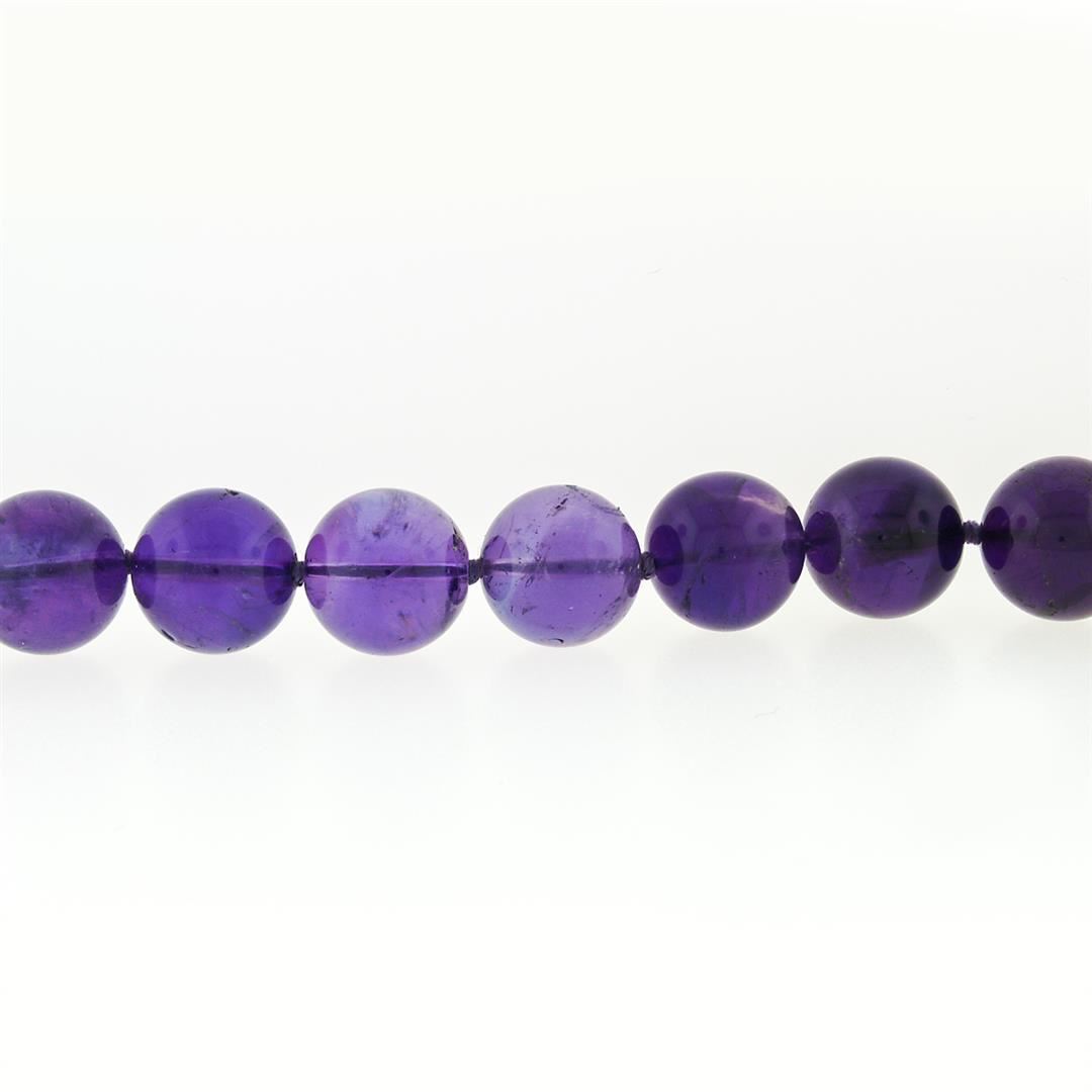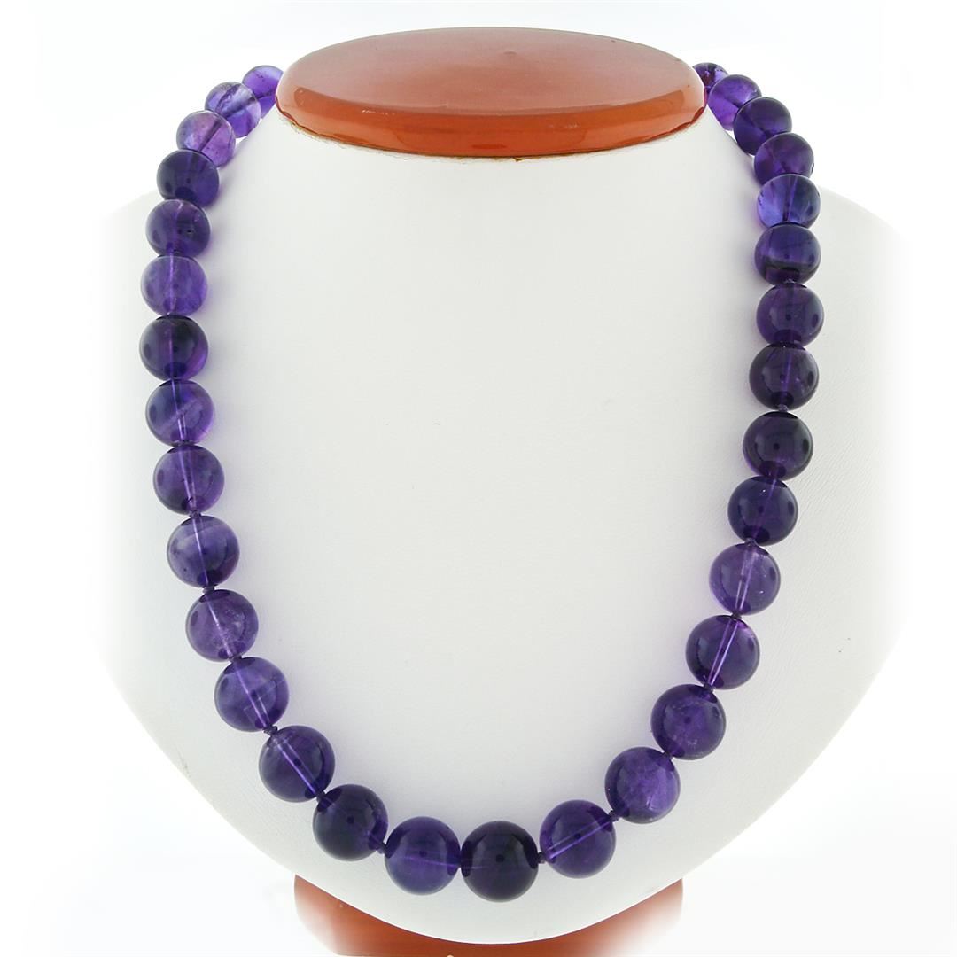 A bead necklace featuring a single strand of 48 round natural amethyst beads (10.88 to 12.43mm - 505ctw) with a solid 14k yellow gold clasp adorned with 6 round bead shaped cultured peals (2.85mm) and 1 old round cut natural ruby (0.15ct). It weighs a total of 106.0 grams, measures 12.4mm wide, and measures 24 inches in length.