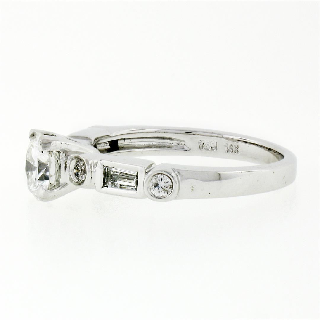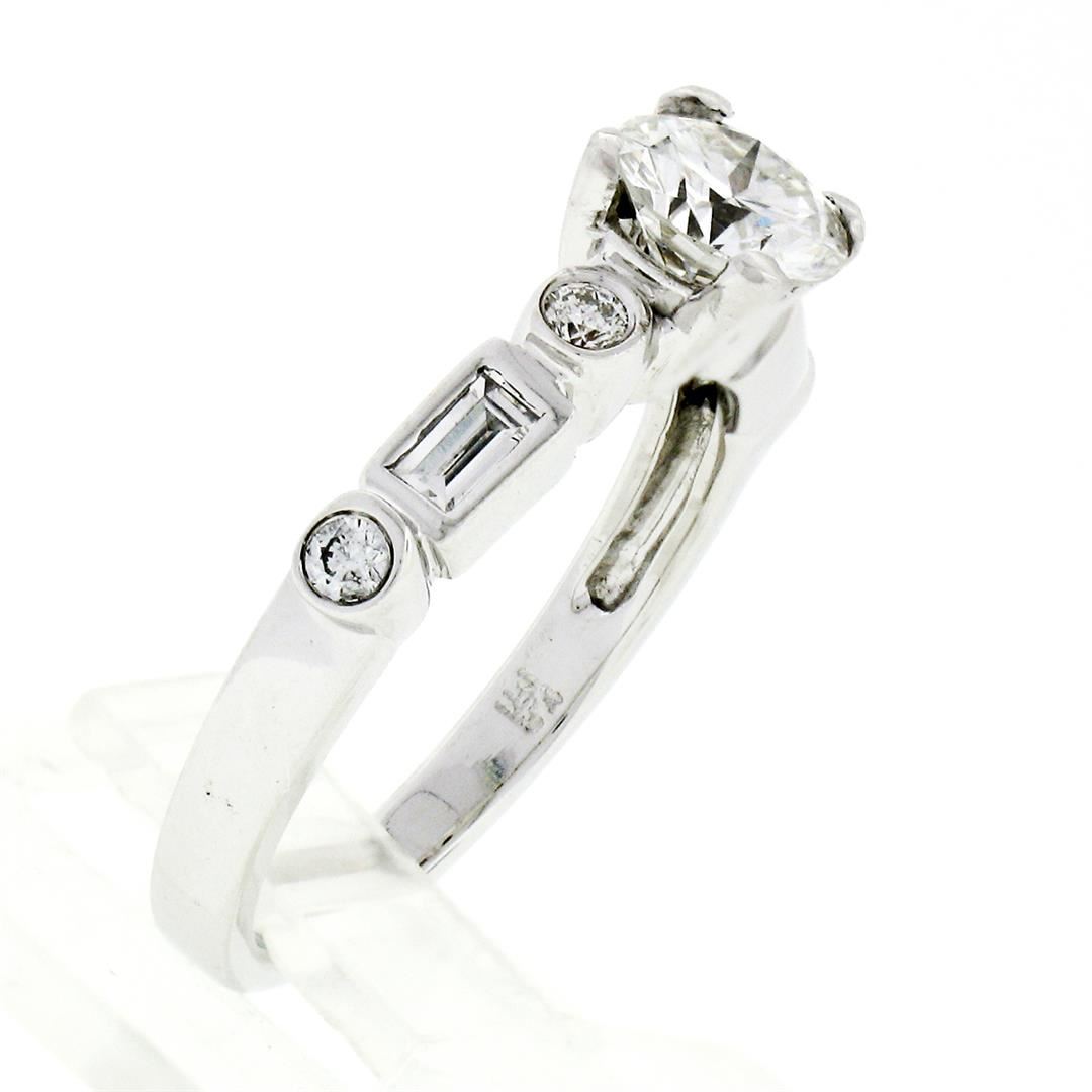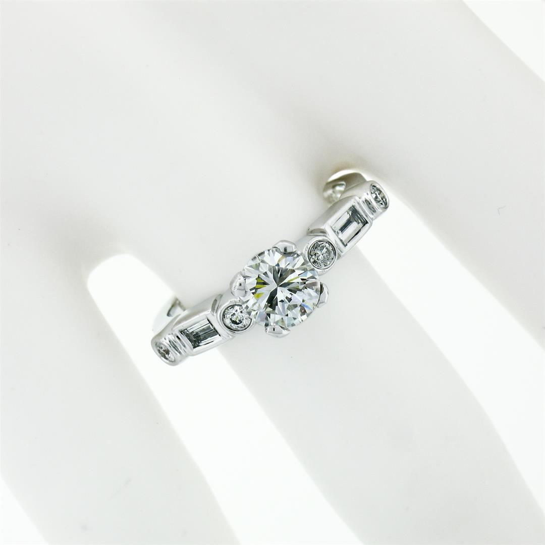 A vintage solid 18k white gold solitaire ring, with 1 round brilliant cut natural diamond (F - VS2 : 0.83ct ), accented with 4 round brilliant cut natural diamonds (F/G - VS2/SI1 ; 0.20ctw), and 2 baguette cut natural diamonds (F/G - VS2; 0.24ctw ). The ring is size 7.0, weighs a total of 4.25 grams, and measures 6.15mm wide.