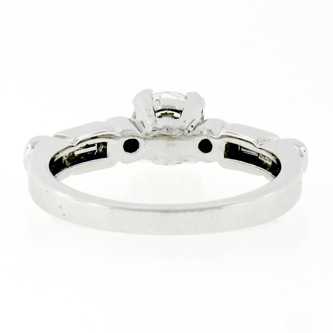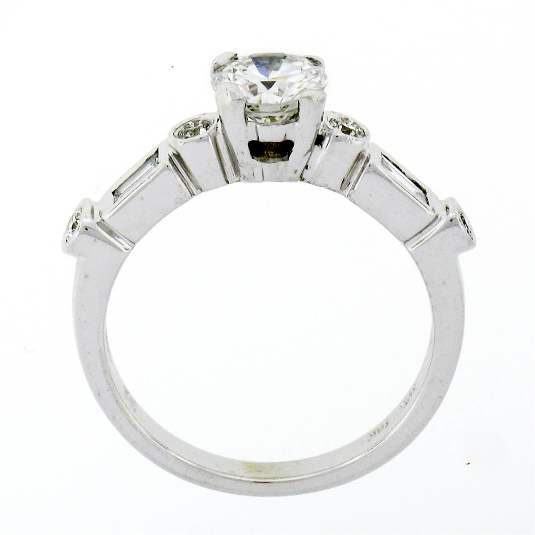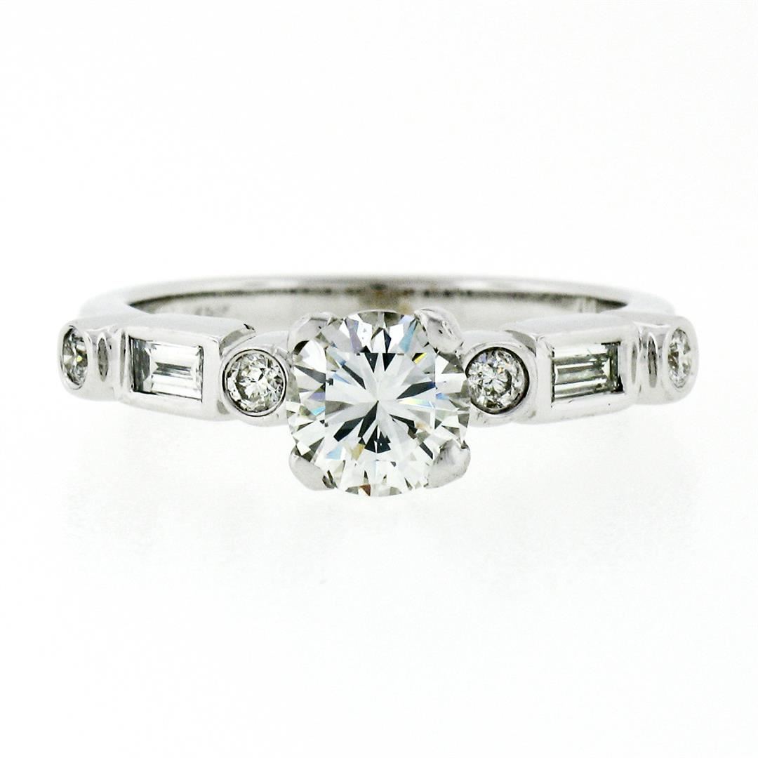 A vintage solid 18k white gold solitaire ring, with 1 round brilliant cut natural diamond (F - VS2 : 0.83ct ), accented with 4 round brilliant cut natural diamonds (F/G - VS2/SI1 ; 0.20ctw), and 2 baguette cut natural diamonds (F/G - VS2; 0.24ctw ). The ring is size 7.0, weighs a total of 4.25 grams, and measures 6.15mm wide.