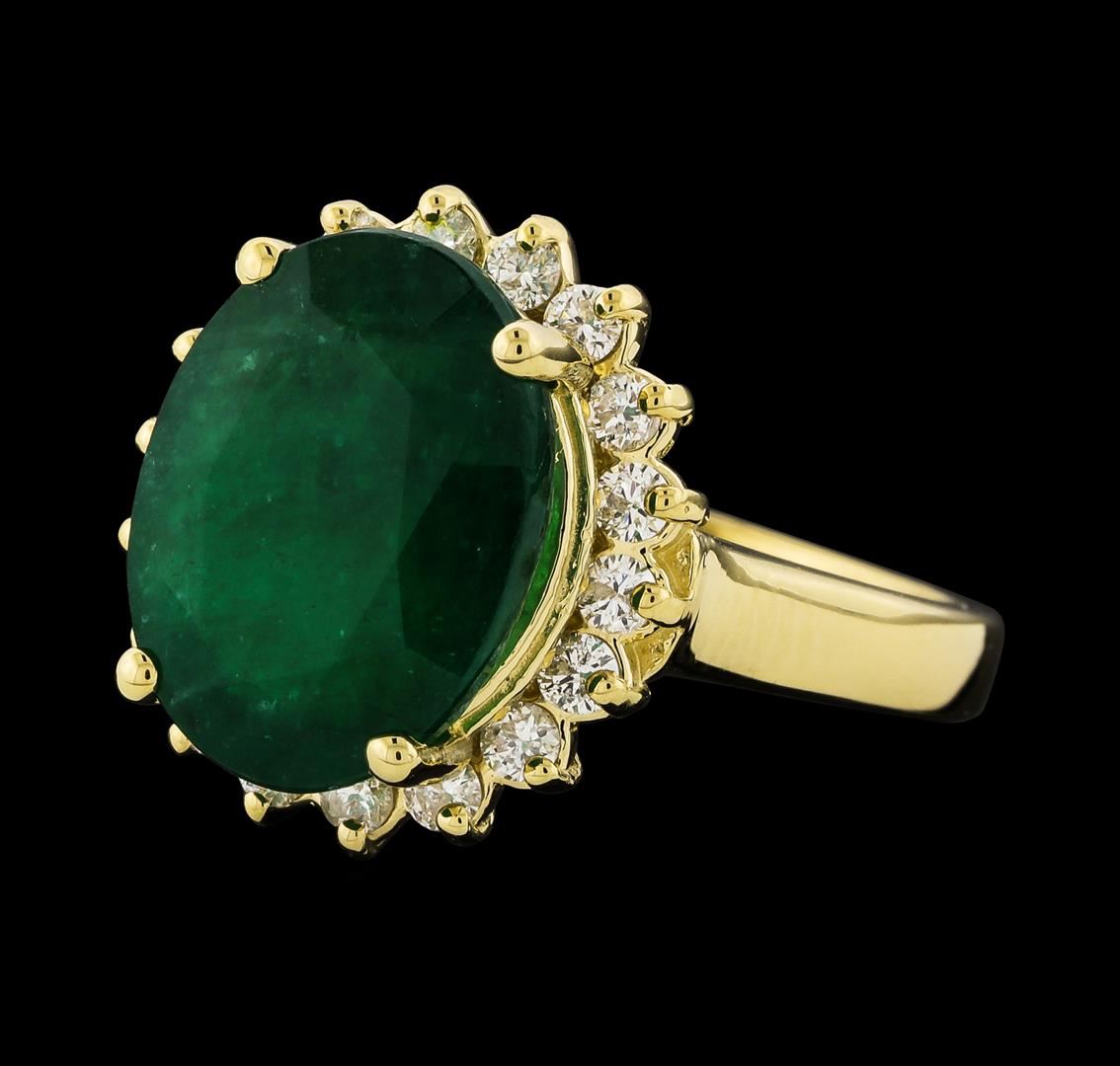 One electronically tested 14KT yellow gold lady's cast fashion ring with a basket halo with a bright polish finish. The featured lady's ring has a shank measuring 2.23 millimeters wide. Identified with markings of '14K'. Condition is new, good workmanship. Containing: One prong set oval modified mixed cut natural emerald, measuring 13.50 x 10.05 x 6.73mm, (depth est.) 15%. bulge factor, approximate weight of 6.00ct., clarity is heavily included, medium dark, moderately strong, green color, (GIA G 6/4), cut is good. Transmitting light somewhat diffusely, semi-transparent to translucent. Naturally occurring internal & external characteristics are present. Indications of oil residue. Colored gemstones are presumed to have been subjected to commonly used enhancement processes. Graded in the setting. Eighteen prong set round brilliant cut diamonds, measuring 2.00 - 1.90 x 1.19mm (depth est.) approximate total weight of 18 Stones = 0.50ct. Graded in the setting. Clarity SI-1 to SI-2. Color: G - I Cut Good. Total Weight of Colored Stones 6.00ct.. Total Weight of Diamonds 0.50ct.. Total Weight of Ring 6.50gm GAS Appraised at $7,185.00.