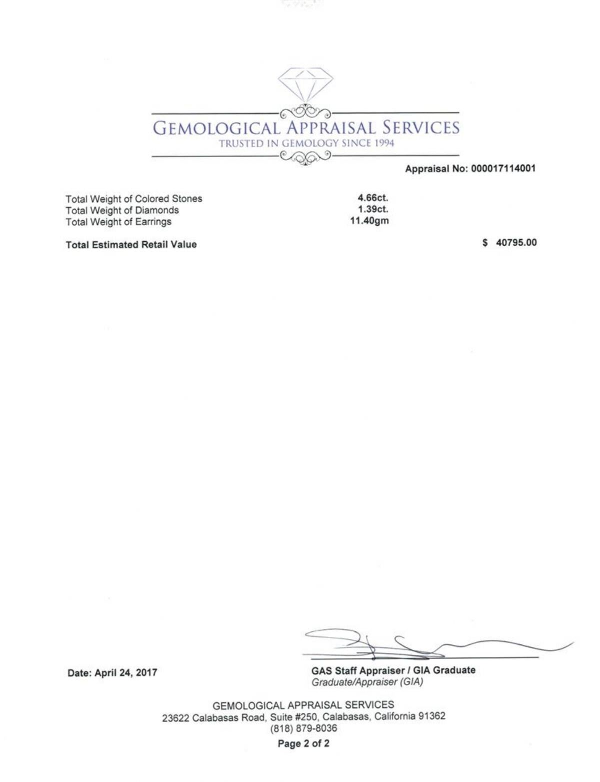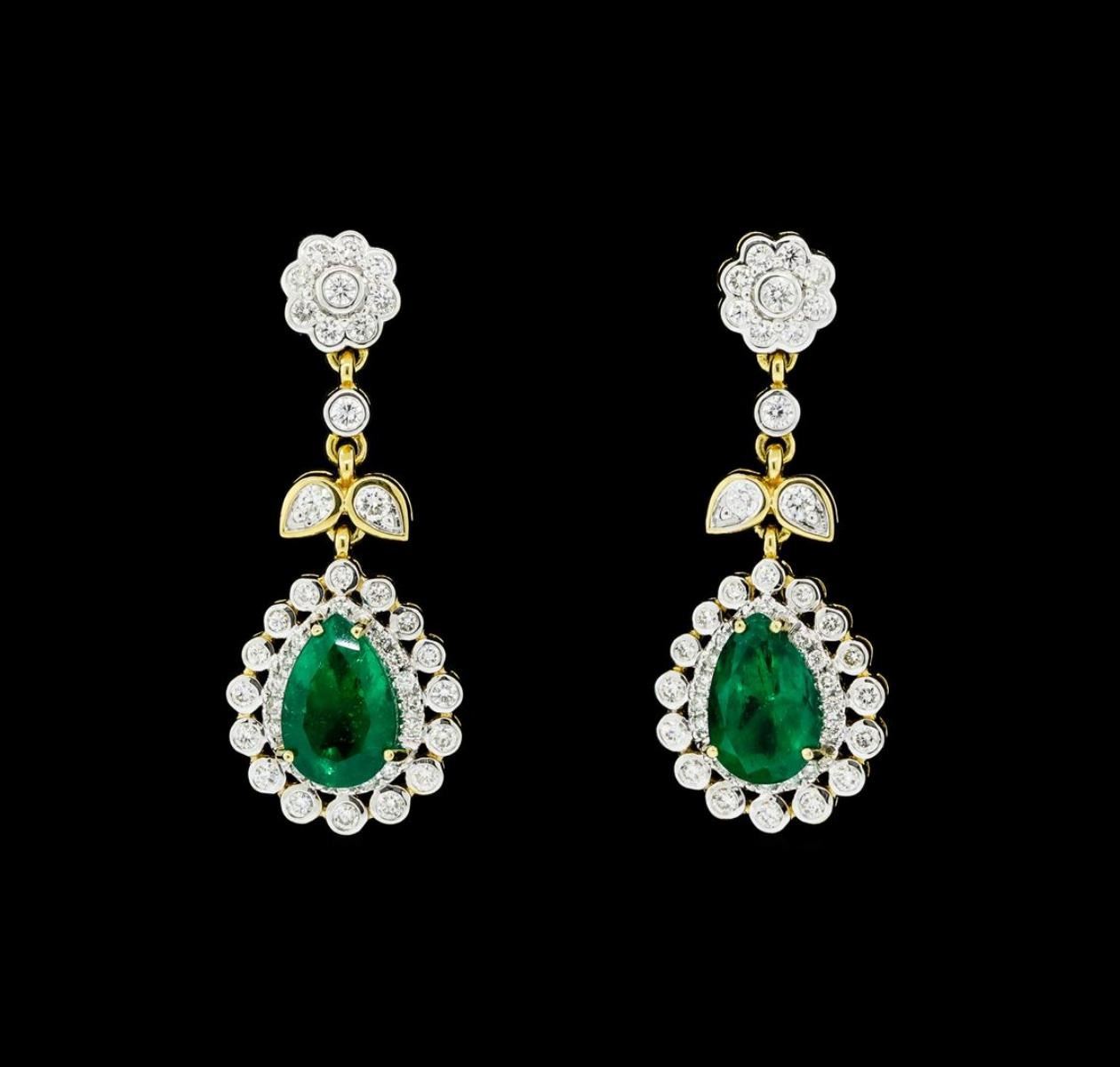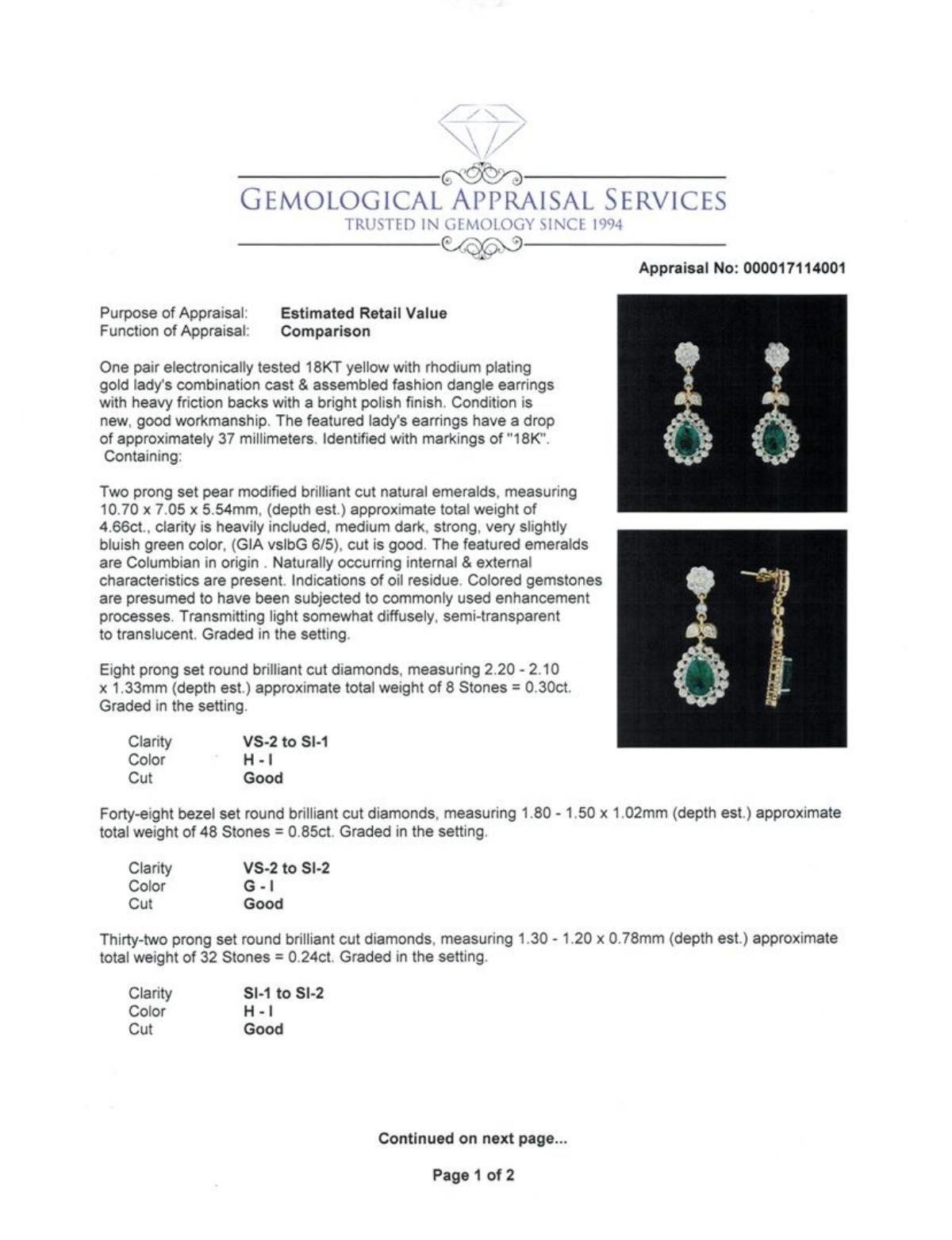 One pair electronically tested 18KT yellow with rhodium plating gold lady's combination cast & assembled fashion dangle earrings with heavy friction backs with a bright polish finish. The featured lady's earrings have a drop of approximately 37 millimeters. Identified with markings of '18K'. Condition is new, good workmanship. Containing: Two prong set pear modified brilliant cut natural emeralds, measuring 10.70 x 7.05 x 5.54mm, (depth est.) approximate total weight of 4.66ct., clarity is heavily included, medium dark, strong, very slightly bluish green color, (GIA vslbG 6/5), cut is good. The featured emeralds are Columbian in origin. Naturally occurring internal & external characteristics are present. Indications of oil residue. Colored gemstones are presumed to have been subjected to commonly used enhancement processes. Transmitting light somewhat diffusely, semi-transparent to translucent. Graded in the setting. Eight prong set round brilliant cut diamonds, measuring 2.20 - 2.10 x 1.33mm (depth est.) approximate total weight of 8 Stones = 0.30ct. Graded in the setting. Color H - I Clarity VS-2 to SI-1 Cut Good Forty-Eight bezel set round brilliant cut diamonds, measuring 1.80 - 1.50 x 1.02mm (depth est.) approximate total weight of 48 Stones = 0.85ct. Graded in the setting. Color G - I Clarity VS-2 to SI-2 Cut Good Thirty-Two prong set round brilliant cut diamonds, measuring 1.30 - 1.20 x 0.78mm (depth est.) approximate total weight of 32 Stones = 0.24ct. Graded in the setting. Color H - I Clarity SI-1 to SI-2 Cut Good. Total Weight of Colored Stones 4.66ct.. Total Weight of Diamonds 1.39ct.. Total Weight of Earrings 11.40gm GAS Appraised at $40795.00. GAS Appraised.