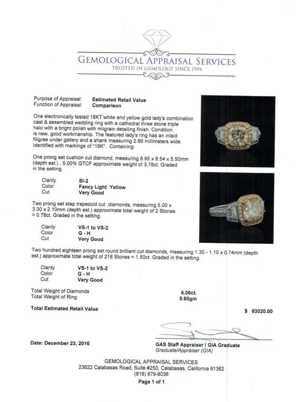 One electronically tested 18KT white and yellow gold lady's combination cast & assembled wedding ring with a cathedral three stone triple halo with a bright polish with milgrain detailing finish. The featured lady's ring has an inlaid filigree under gallery and a shank measuring 2.66 millimeters wide. Identified with markings of '18K'. Condition is new, good workmanship. Containing: One prong set cushion cut diamond, measuring 8.95 x 8.54 x 5.50mm (depth est.) , 5.00.%. GTCF approximate weight of 3.78ct. Graded in the setting. Clarity SI-2 Cut Very Good Two prong set step trapezoid cut diamonds, measuring 5.00 x 3.30 x 2.10mm (depth est.) approximate total weight of 2 Stones = 0.78ct. Graded in the setting. Clarity VS-1 to VS-2. Color: G - H Cut Very Good Two Hundred Eighteen prong set round brilliant cut diamonds, measuring 1.30 - 1.10 x 0.74mm (depth est.) approximate total weight of 218 Stones = 1.50ct. Graded in the setting. Clarity VS-1 to VS-2. Color: G - H Cut Very Good. Total Weight of Diamonds 6.06ct.. Total Weight of Ring 8.60gm. GAS Appraised.