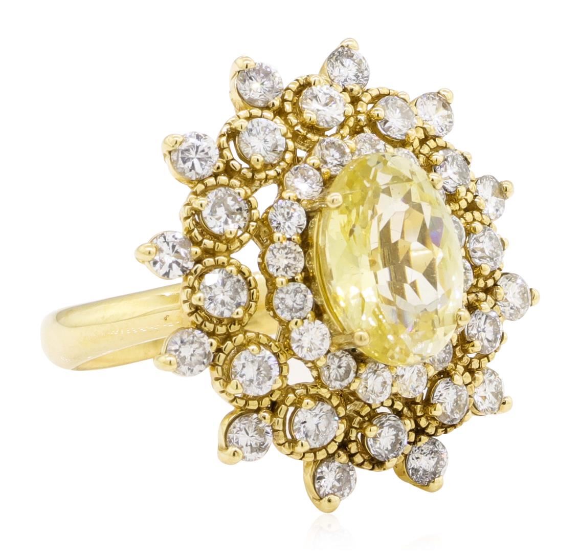 One electronically tested 14KT yellow gold lady's cast fashion ring with a starburst halo with a bright polish finish. The featured lady's ring has a shank measuring 3.60 millimeters wide. Identified with markings of '14K'. Condition is new, good workmanship. Containing: One prong set oval modified mixed cut natural yellow sapphire, measuring 11.06 x 8.09 x 5.19mm, (depth est.) 5%. bulge factor, approximate weight of 4.11ct., clarity is eye clean, medium, moderately strong, yellow color, (GIA Y 5/4), cut is very good. Transmitting light with a minimum of distortion, transparent. Colored gemstones are presumed to have been subjected to commonly used enhancement processes. No indications of heat treatment. Graded loose prior to setting in the GIA Laboratory, Report #2161028522. Twenty-Four prong set round brilliant cut diamonds, measuring 2.70 - 2.50 x 1.61mm (depth est.) approximate total weight of 24 Stones = 1.60ct. Graded in the setting. Color H - I Clarity SI-1 to SI-2 Cut Good Sixteen prong set round brilliant cut diamonds, measuring 1.90 - 1.85 x 1.13mm (depth est.) approximate total weight of 16 Stones = 0.38ct. Graded in the setting. Color H - I Clarity SI-1 to SI-2 Cut Good. Total Weight of Colored Stones 4.11ct.. Total Weight of Diamonds 1.98ct.. Total Weight of Ring 9.00gm GAS Appraised at $15460.00. GAS Appraised.