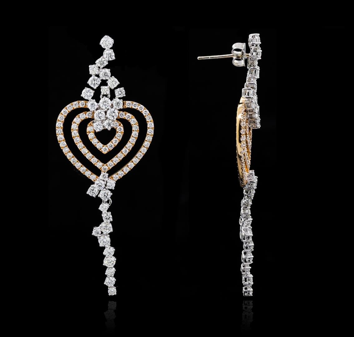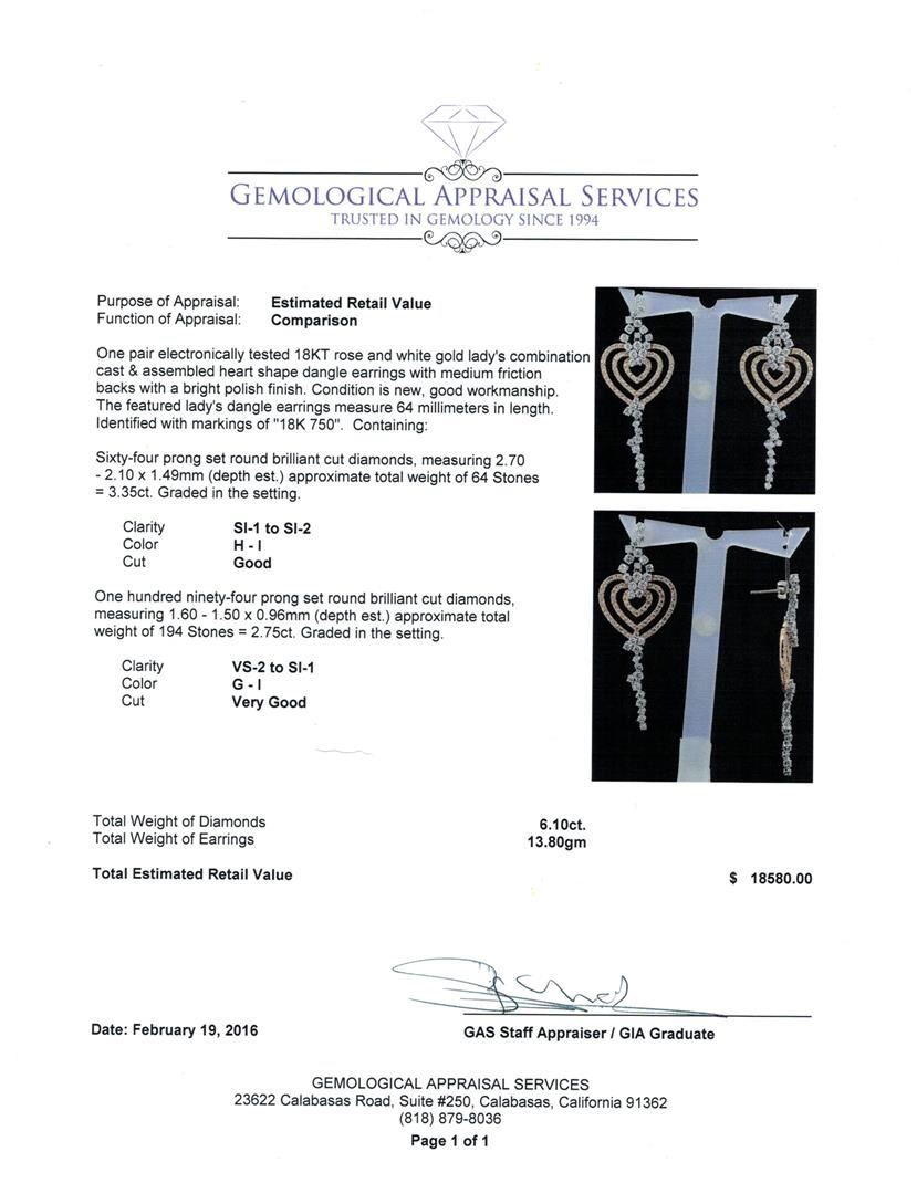 One pair electronically tested 18KT rose and white gold lady's combination cast & assembled heart shape dangle earrings with medium friction backs with a bright polish finish. The featured lady's dangle earrings measure 64 millimeters in length. Identified with markings of "18K 750". Condition is new, good workmanship. Containing: Sixty-Four prong set round brilliant cut diamonds, measuring 2.70 - 2.10 x 1.49mm (depth est.) approximate total weight of 64 Stones = 3.35ct. Graded in the setting. Clarity: SI-1 to SI-2. Color: H - I. Cut Good One Hundred Ninety-Four prong set round brilliant cut diamonds, measuring 1.60 - 1.50 x 0.96mm (depth est.) approximate total weight of 194 Stones = 2.75ct. Graded in the setting. Clarity: VS-2 to SI-1. Color: G - I. Cut Very Good. Total Weight of Diamonds 6.10 ct. Total Weight of Earrings 13.80gm. GAS Appraised.