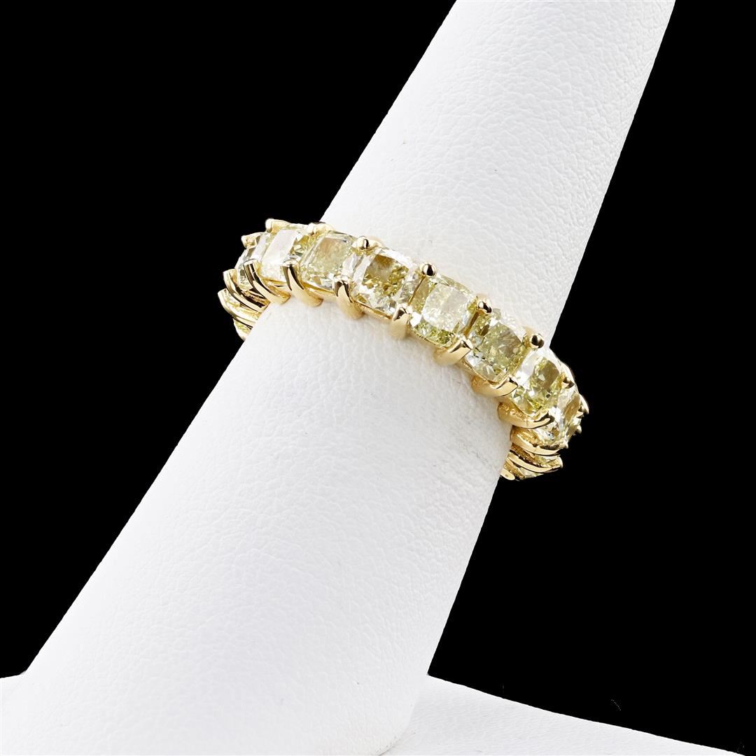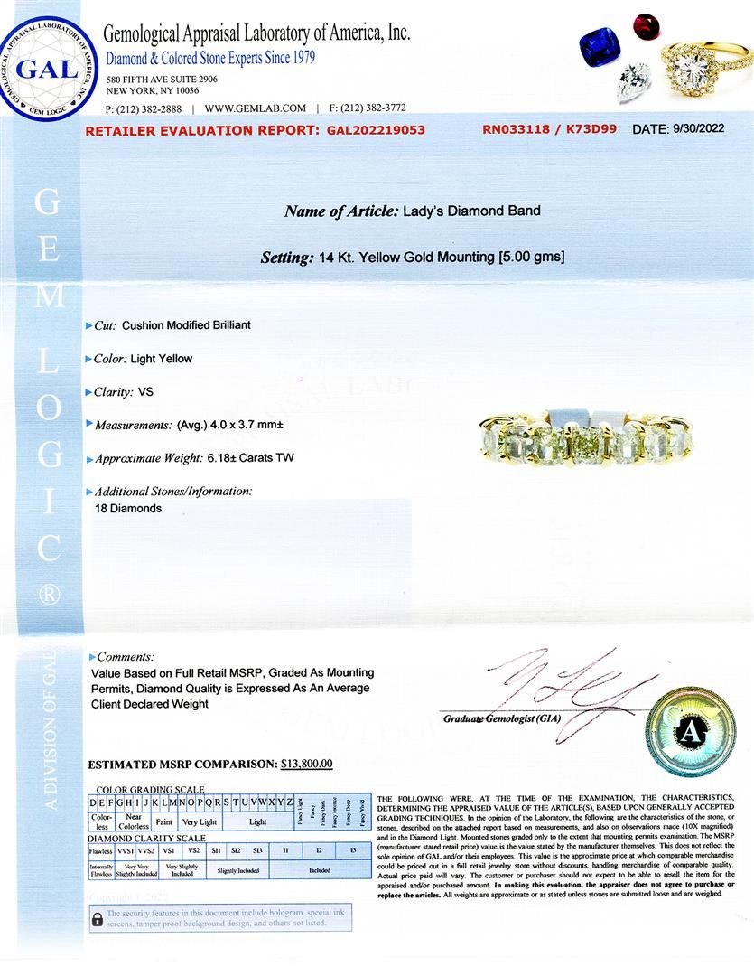 Lady's Diamond Band 14 Kt. Yellow Gold Mounting [5.00 gms] Cut: Cushion Modified Brilliant Color: Light Yellow Clarity: VS Measurements: (Avg.) 4.0 x 3.7mm+/- Approximate Weight: 6.18+/- Carats TW Additional Stones/Information: 18 Diamonds