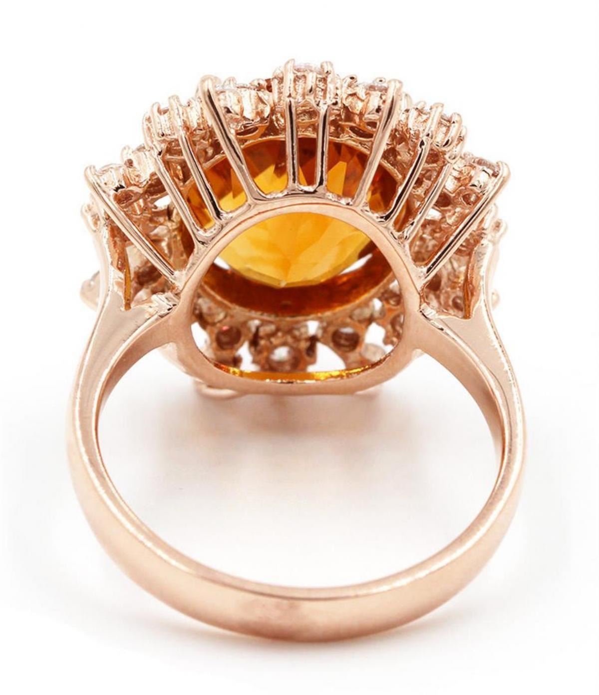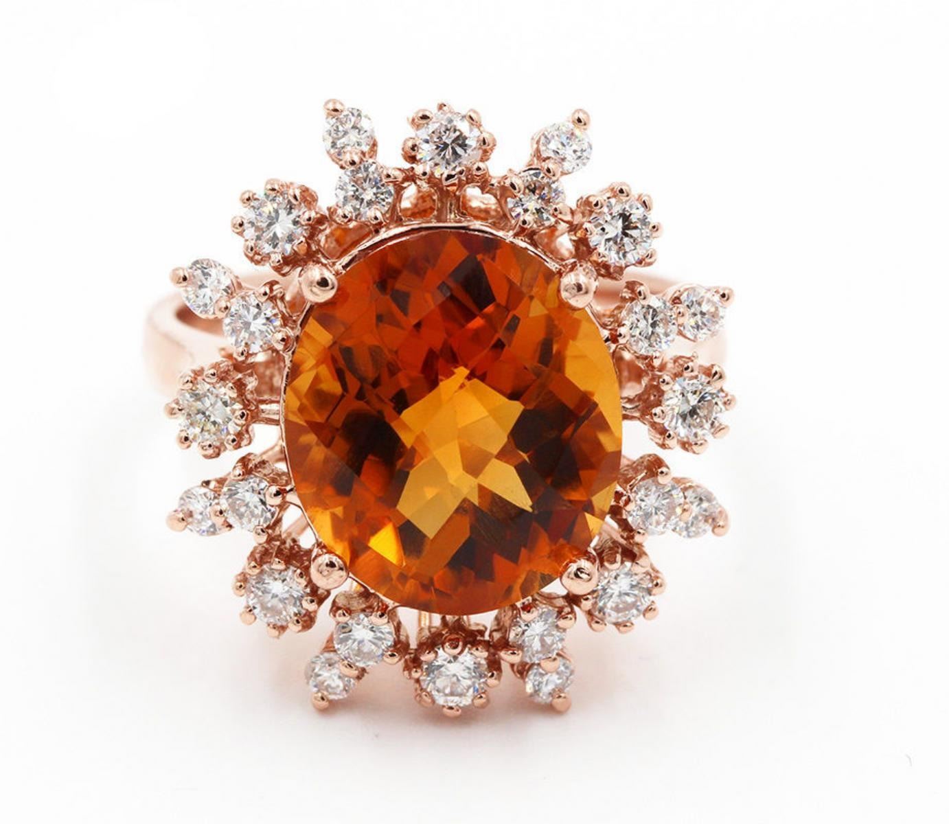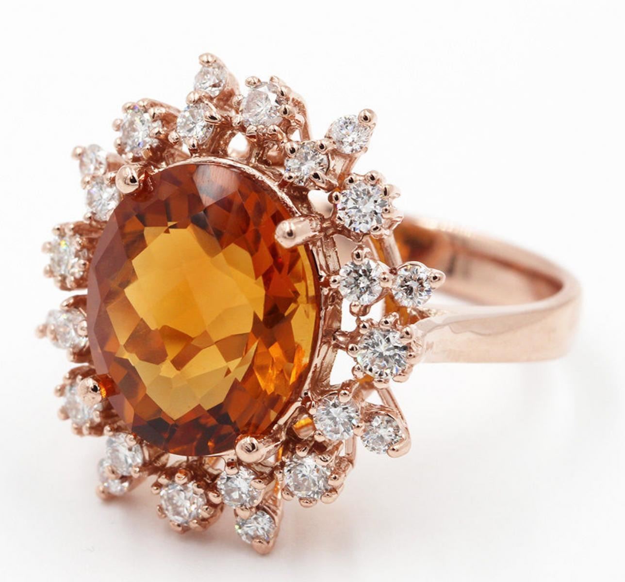 One Oval Cut Maderia Citrine Diamond Engagement Ring in 14k Rose Gold. Size 6.75 but resizable. Total carat weight is 6.21 Ct. Setting style is 4 prong with gorgeous design. Gross weight of the ring is 6.50 grams, with a total of 25 stones. Condition is brand new. Main stone is natural and non-enhanced. Main stone is 5.42 carats, oval checker shape, clarity is good, fine deep orange color, and has an excellent cut. Side stones are natural and non-enhanced, 0.79 carats, diamond shape is brilliant round cut with SI1 clarity and G-H color. Side diamond cut is excellent with 24 stones. Included with independent certification with a retail value of $10,000.