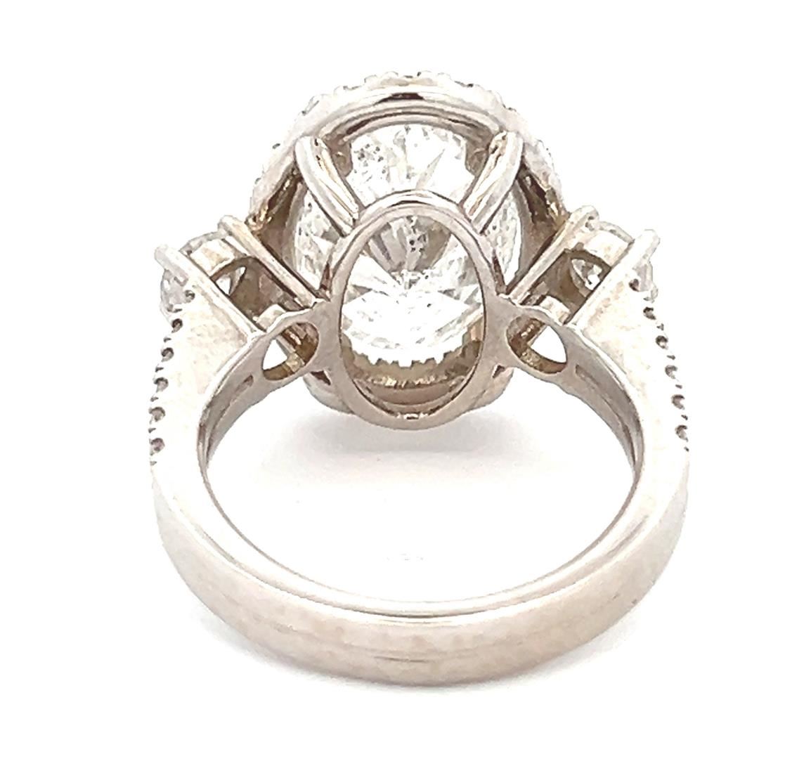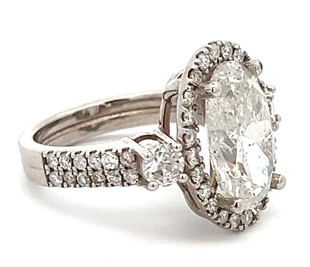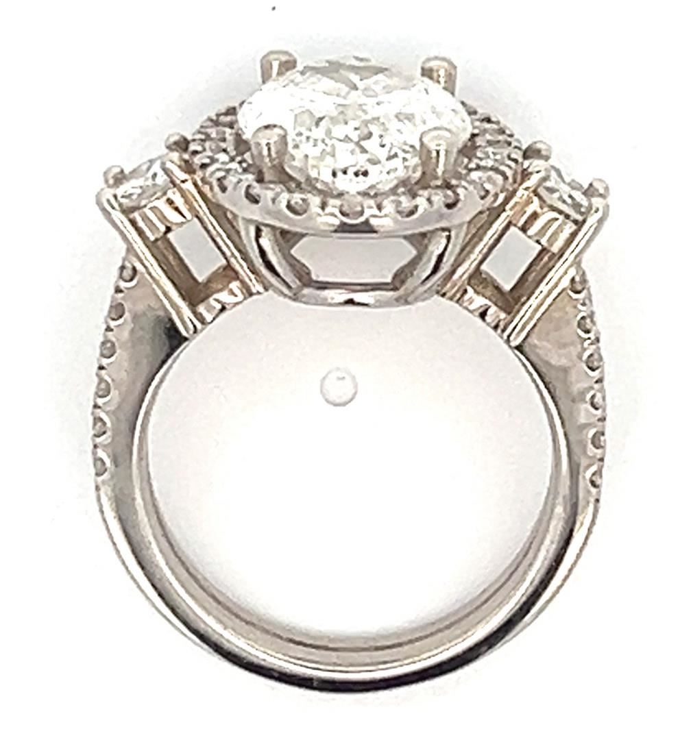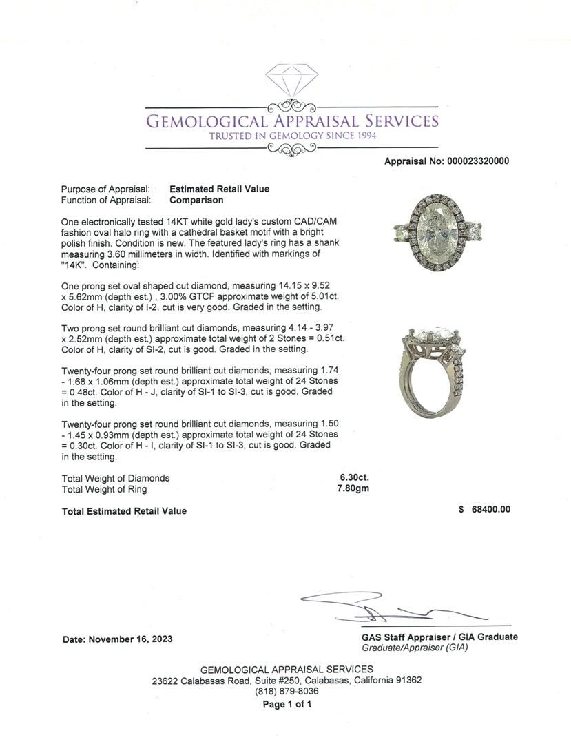 One electronically tested 14KT white gold lady's custom CAD/CAM fashion oval halo ring with a cathedral basket motif with a bright polish finish. The featured lady's ring has a shank measuring 3.60 millimeters in width. Identified with markings of "14K". Condition is new. Containing: One prong set oval shaped cut diamond, measuring 14.15 x 9.52 x 5.62mm (depth est.) , 3.00% GTCF approximate weight of 5.01ct. Graded in the setting. Color H Clarity I-2 Cut Very Good Two prong set round brilliant cut diamonds, measuring 4.14 - 3.97 x 2.52mm (depth est.) approximate total weight of 2 Stones = 0.51ct. Graded in the setting. Color H Clarity SI-2 Cut Good Twenty-Four prong set round brilliant cut diamonds, measuring 1.74 - 1.68 x 1.06mm (depth est.) approximate total weight of 24 Stones = 0.48ct. Graded in the setting. Color H - J Clarity SI-1 to SI-3 Cut Good Twenty-Four prong set round brilliant cut diamonds, measuring 1.50 - 1.45 x 0.93mm (depth est.) approximate total weight of 24 Stones = 0.30ct. Graded in the setting. Color H - I Clarity SI-1 to SI-3 Cut Good Total Weight of Diamonds 6.30ct. Total Weight of Ring 7.80gm Estimated Retail Value $ 68400.00