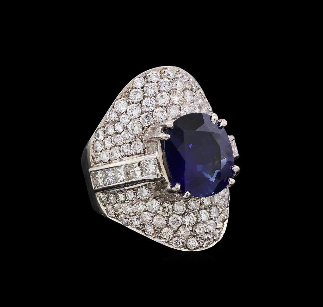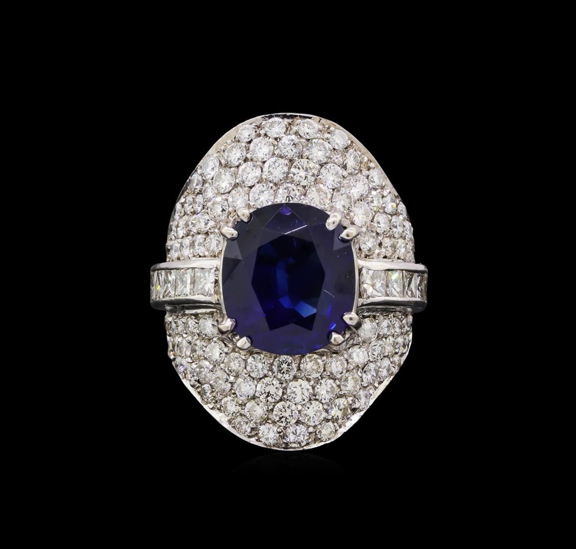 One electronically tested 18KT white gold ladies cast sapphire and diamond ring with a bright polish finish. The featured sapphire is set within a diamond set curvature with raised a diamond ribbon on either side supported by tapering shoulders, completed by a five and one-half millimeter wide band. Identified with markings of "18K". Condition is new, good workmanship. Containing: One prong set oval mixed cut natural blue sapphire, measuring 12.40 x 10.80 x 5.60mm, approximate weight of 6.30ct., clarity is slightly included, type II, dark, very slightly grayish, blue color, (GIA B 7/3), cut is good. Transmitting light with a minimum of distortion, transparent. Naturally occurring internal & external characteristics are present. Colored Stone Grading Report attached. Graded in the setting. Ten channel set princess cut diamonds, measuring 2.60 x 2.20 x 1.54mm (depth est.) approximate total weight of 10 Stones = 0.76ct. Graded in the setting. Clarity: SI-2 to I-1 . Color: G - I Ninety-Eight prong set round brilliant cut diamonds, measuring 2.10 - 1.60 x 1.11mm (depth est.) approximate total weight of 98 Stones = 2.26ct. Graded in the setting. Clarity: SI-1 to I-1 . Color: F - H. Total Weight of Colored Stones 6.30ct.. Total Weight of Diamonds 3.02ct.. Total Weight of Ring 14.13gm. AIG Appraised.