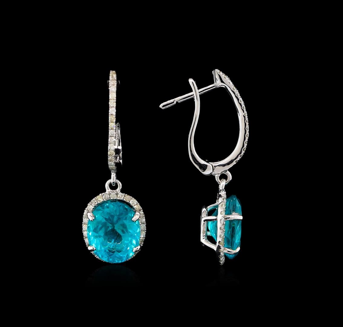 One pair electronically tested 14KT white gold lady's combination cast & assembled fashion earring with hinged, snap locking posts with a dangle halo with a bright polish finish. Trademark is Orianne. Identified with markings of "14K". Condition is new, good workmanship. Containing: Two prong set oval modified brilliant cut natural apatites, measuring 9.95 x 8.05 x 5.75mm, 3%. bulge factor, approximate total weight of 6.35ct., clarity is moderately included, medium dark, strong, very strongly bluish green color, (GIA vstbG 6/5), cut is good. Transmitting light somewhat diffusely, transparent to translucent. Colored gemstones are presumed to have been subjected to commonly used enhancement processes. Graded in the setting. Ninety prong set round brilliant cut diamonds, measuring 1.20 - 1.10 x 0.69mm (depth est.) approximate total weight of 90 Stones = 0.47ct. Graded in the setting. Clarity: I-1 to I-2. Color: H - I. Cut Good. Total Weight of Colored Stones 6.35ct. Total Weight of Diamonds 0.47ct. Total Weight of Earring 3.80gm. GAS Appraised at $5,270.00.