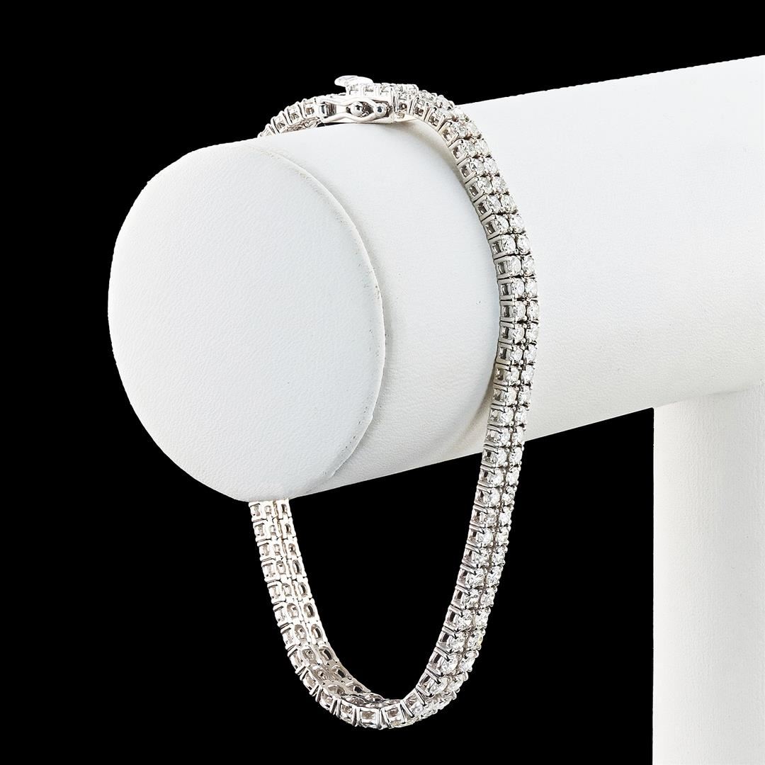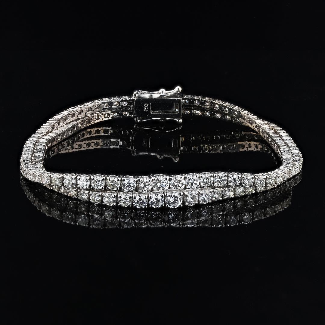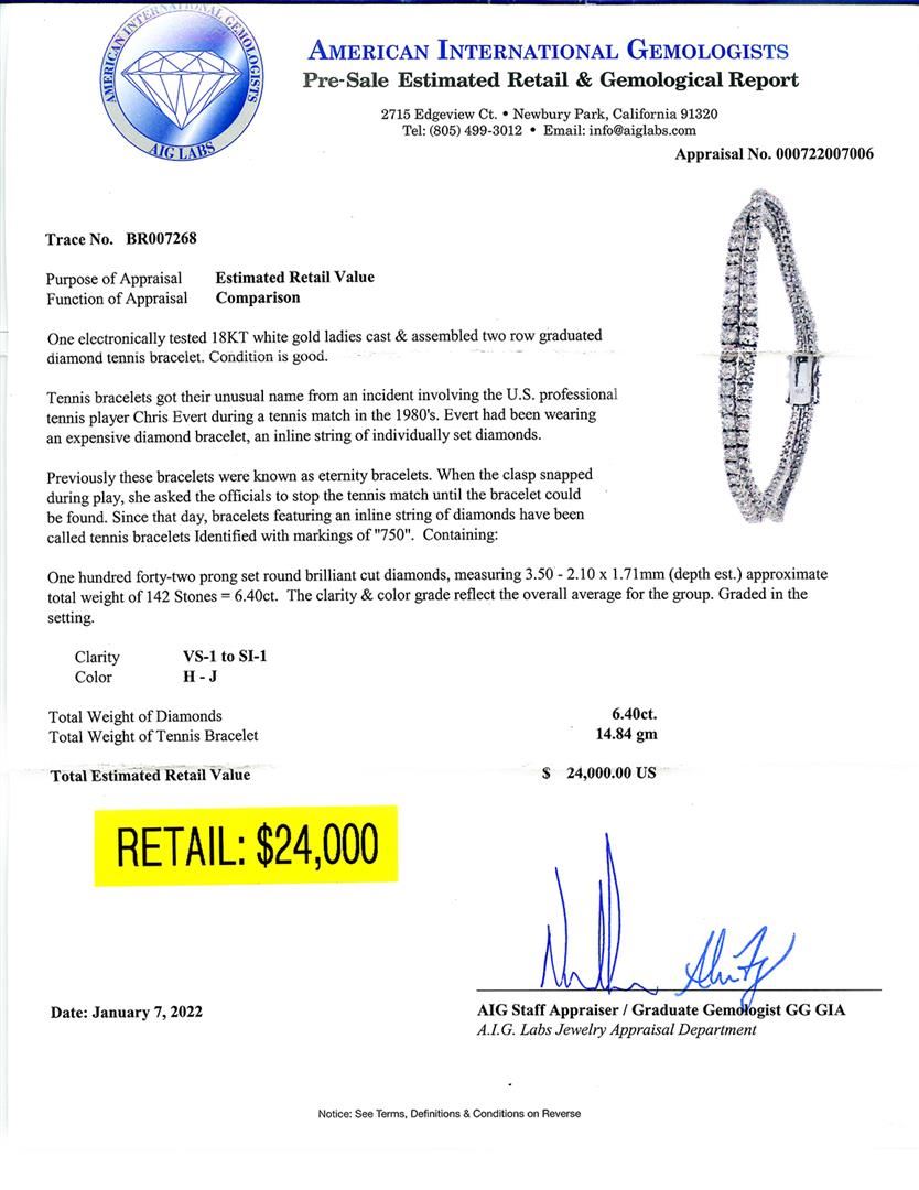 One electronically tested 18KT white gold ladies cast & assembled two row graduated diamond tennis bracelet. Condition is good. Tennis bracelets got their unusual name from an incident involving the U.S. professional tennis player Chris Evert during a tennis match in the 1980's. Evert had been wearing an expensive diamond bracelet, an inline string of individually set diamonds. Previously these bracelets were known as eternity bracelets. When the clasp snapped during play, she asked the officials to stop the tennis match until the bracelet could be found. Since that day, bracelets featuring an inline string of diamonds have been called tennis bracelets Identified with markings of "750". One hundred forty-two prong set round brilliant cut diamonds, measuring 3.50 - 2.10 x 1.71mm (depth est.) approximate total weight of 142 Stones = 6.40ct. The clarity and color grade reflect the overall average for the group. Graded in the setting Clarity VS-1 to SI-1 Color H - J Total Weight of Diamonds: 6.40ct Total Weight of Tennis Bracelet: 14.84 gm