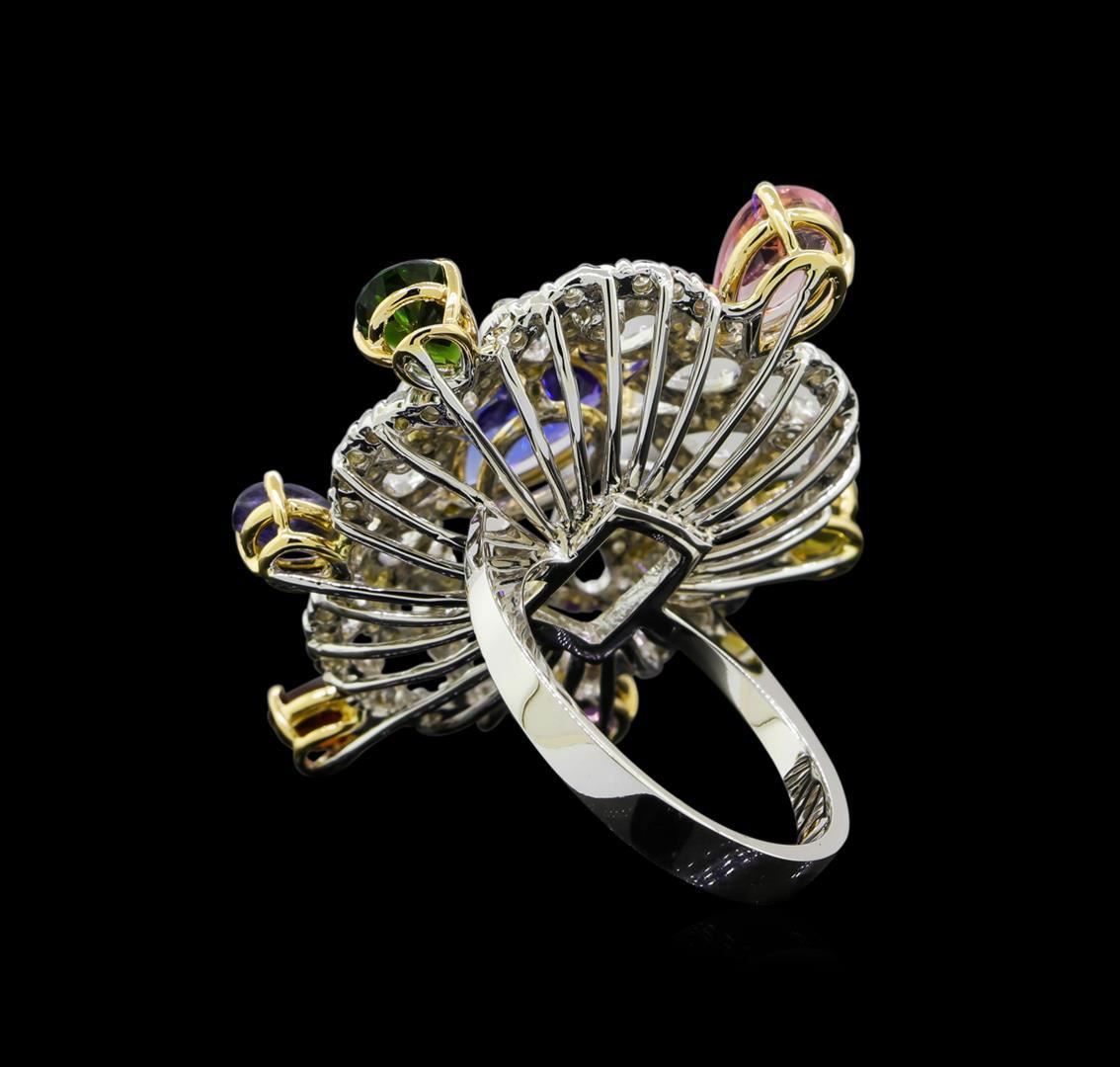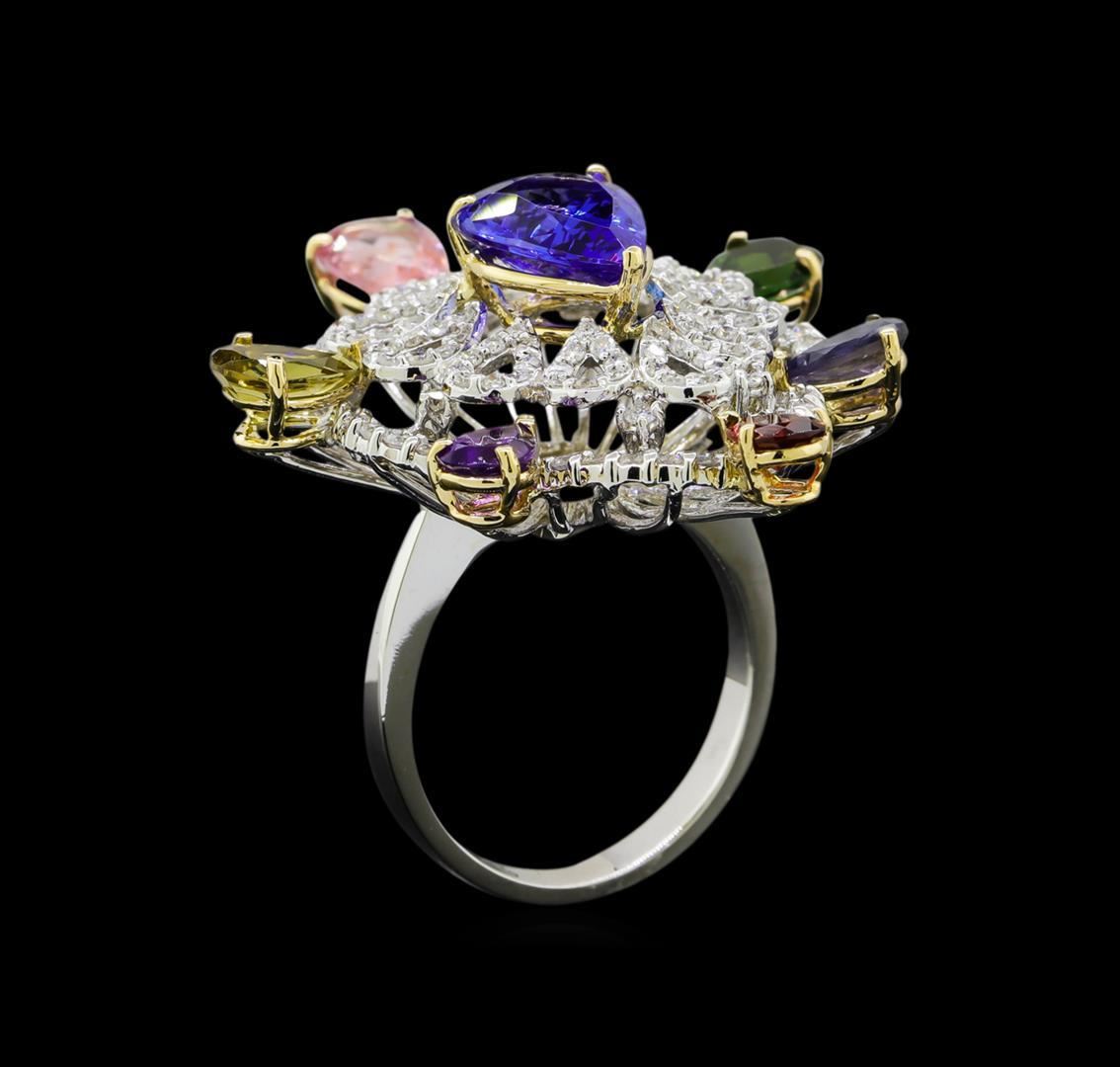 One electronically tested 14KT white and yellow gold lady's cast fashion ring with a bright polish finish. The featured lady's ring has a shank measuring 3.15 millimeters wide. Identified with markings of '14K'. Condition is new, good workmanship. Containing: One prong set pear modified brilliant cut natural tanzanite, measuring 11.15 x 8.25 x 5.18mm, (depth est.) approximate weight of 2.80 ct., clarity is eye clean, medium dark, moderately strong, violetish blue color, (GIA vB 6/4), cut is very good. Transmitting light with no distortion, transparent. Colored gemstones are presumed to have been subjected to commonly used enhancement processes. Graded in the setting. Two prong set round brilliant cut diamonds, measuring 1.90 - 1.80 x 1.15mm (depth est.) approximate total weight of 2 Stones = 0.05ct. Graded in the setting. Clarity SI-1 to SI-2. Color: H - I Cut Good Forty prong set round brilliant cut diamonds, measuring 1.55 - 1.45 x 0.93mm (depth est.) approximate total weight of 40 Stones = 0.51ct. Graded in the setting. Clarity SI-1 to SI-2. Color: H - I Cut Good One Hundred Fifteen prong set round brilliant cut diamonds, measuring 1.25 - 1.15 x 0.74mm (depth est.) approximate total weight of 115 Stones = 0.75ct. Graded in the setting. Clarity SI-1 to SI-2. Color: H - I Cut Good One prong set pear modified brilliant cut natural pink tourmaline, measuring 7.90 x 5.90 x 3.20mm, (depth est.) approximate weight of 0.91ct., clarity is moderately included, medium light, moderately strong, slightly purplish red color, (GIA slpR 4/4), cut is good. Transmitting light somewhat diffusely, transparent to translucent. Colored gemstones are presumed to have been subjected to commonly used enhancement processes. Graded in the setting. Two prong set pear modified brilliant cut natural green tourmalines, measuring 7.10 x 5.05 x 3.20mm, (depth est.) approximate total weight of 1.40 ct., clarity is eye clean, medium, moderately strong, green color, (GIA G 5/4), cut is good. One the featured green tourmalines has a strong yellow overtone. Transmitting light with no distortion, transparent. Colored gemstones are presumed to have been subjected to commonly used enhancement processes. Graded in the setting. One prong set pear modified brilliant cut natural blue sapphire, measuring 6.00 x 3.95 x 2.90mm, (depth est.) approximate weight of 0.55ct., clarity is moderately included, medium light, very slightly grayish, violetish blue color, (GIA vB 4/3), cut is good. Transmitting light somewhat diffusely, transparent to translucent. Colored gemstones are presumed to have been subjected to commonly used enhancement processes. Graded in the setting. One prong set pear modified brilliant cut natural pyrope garnet, measuring 6.10 x 3.90 x 2.20mm, (depth est.) approximate weight of 0.39ct., clarity is eye clean, medium dark, very slightly brownish, red color, (GIA R 6/3), cut is good. Transmitting light with no distortion, transparent. Colored gemstones are presumed to have been subjected to commonly used enhancement processes. Graded in the setting. One prong set pear modified brilliant cut natural amethyst, measuring 5.40 x 4.30 x 2.80mm, (depth est.) approximate weight of 0.35ct., clarity is slightly included, medium dark, very slightly grayish, purple color, (GIA P 6/3), cut is good. Transmitting light with a minimum of distortion, transparent. Colored gemstones are presumed to have been subjected to commonly used enhancement processes. Graded in the setting. Total Weight of Colored Stones 6.40 ct.. Total Weight of Diamonds 1.31ct.. Total Weight of Ring 11.60gm. GAS Appraised.