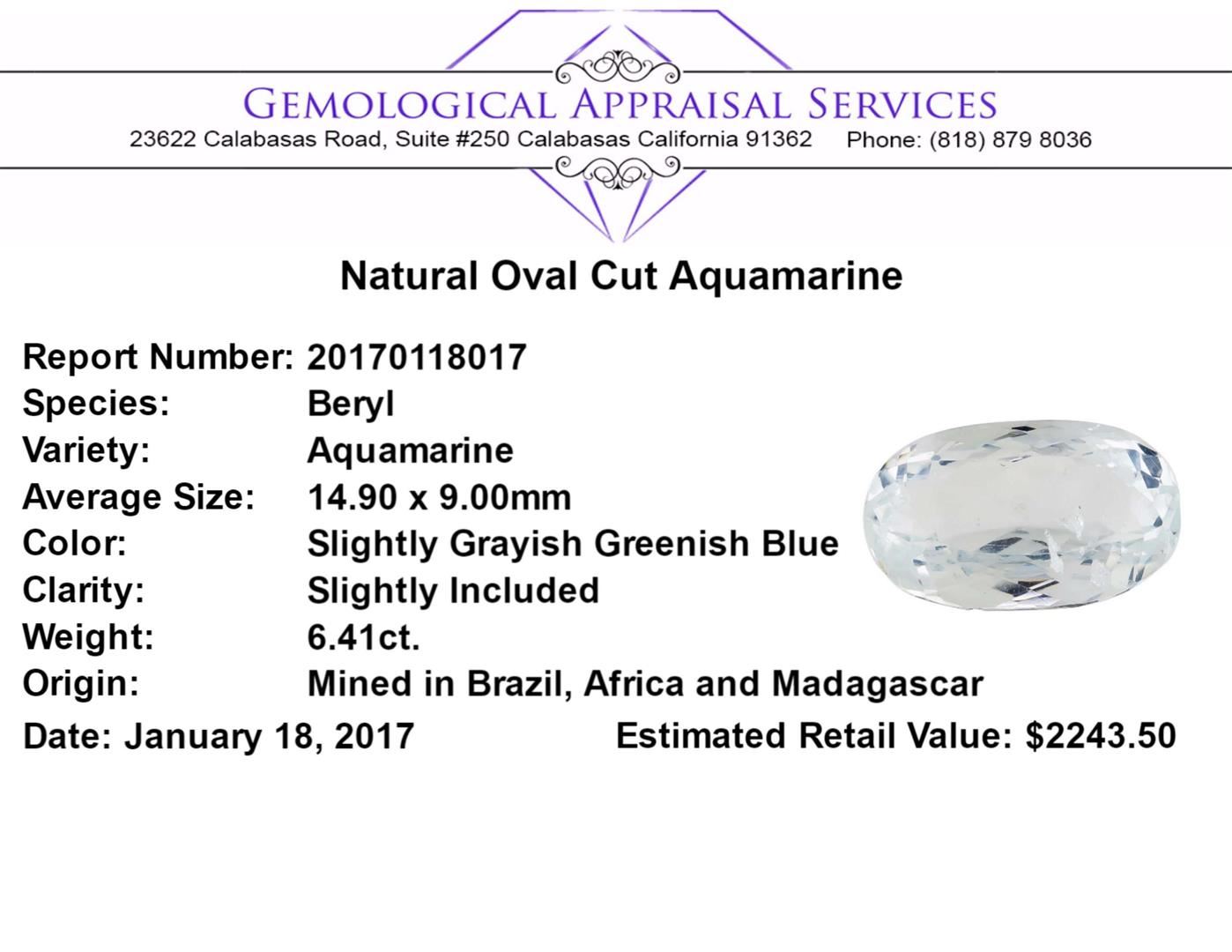 One natural oval cut aquamarine with an exact weight of 6.41ct., clarity is slightly included, slightly grayish greenish blue. Gemological Appraisals Services estimates the retail value at $2243.5 GAS Appraised.