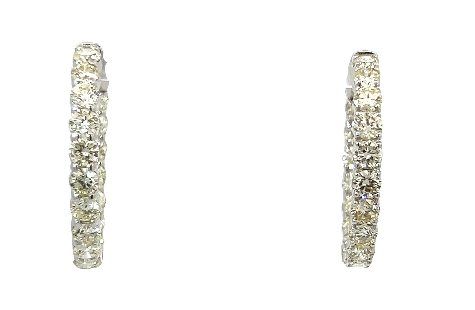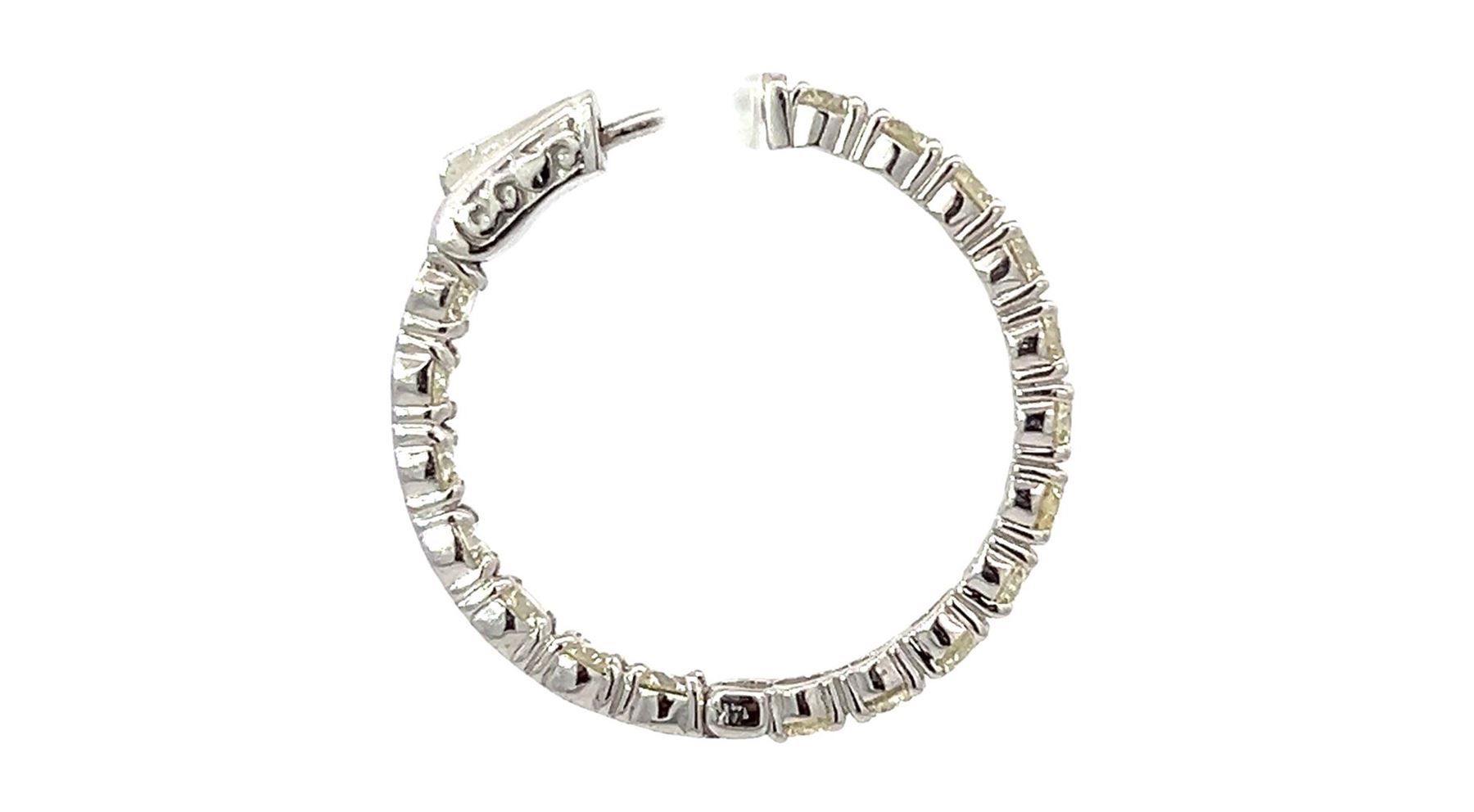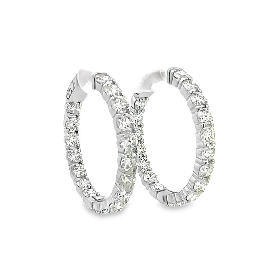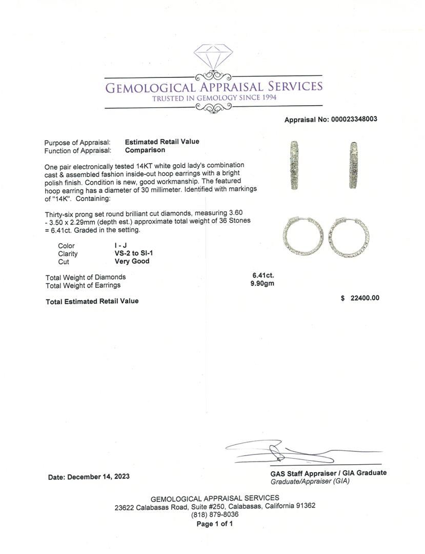 One pair electronically tested 14KT white gold lady's combination cast & assembled fashion inside-out hoop earrings with a bright polish finish. The featured hoop earring has a diameter of 30 millimeter. Identified with markings of "14K". Condition is new, good workmanship. Containing: Thirty-Six prong set round brilliant cut diamonds, measuring 3.60 - 3.50 x 2.29mm (depth est.) approximate total weight of 36 Stones = 6.41ct. Graded in the setting. Color I - J Clarity VS-2 to SI-1 Cut Very Good Total Weight of Diamonds 6.41ct. Total Weight of Earrings 9.90gm Estimated Retail Value $ 22400.00