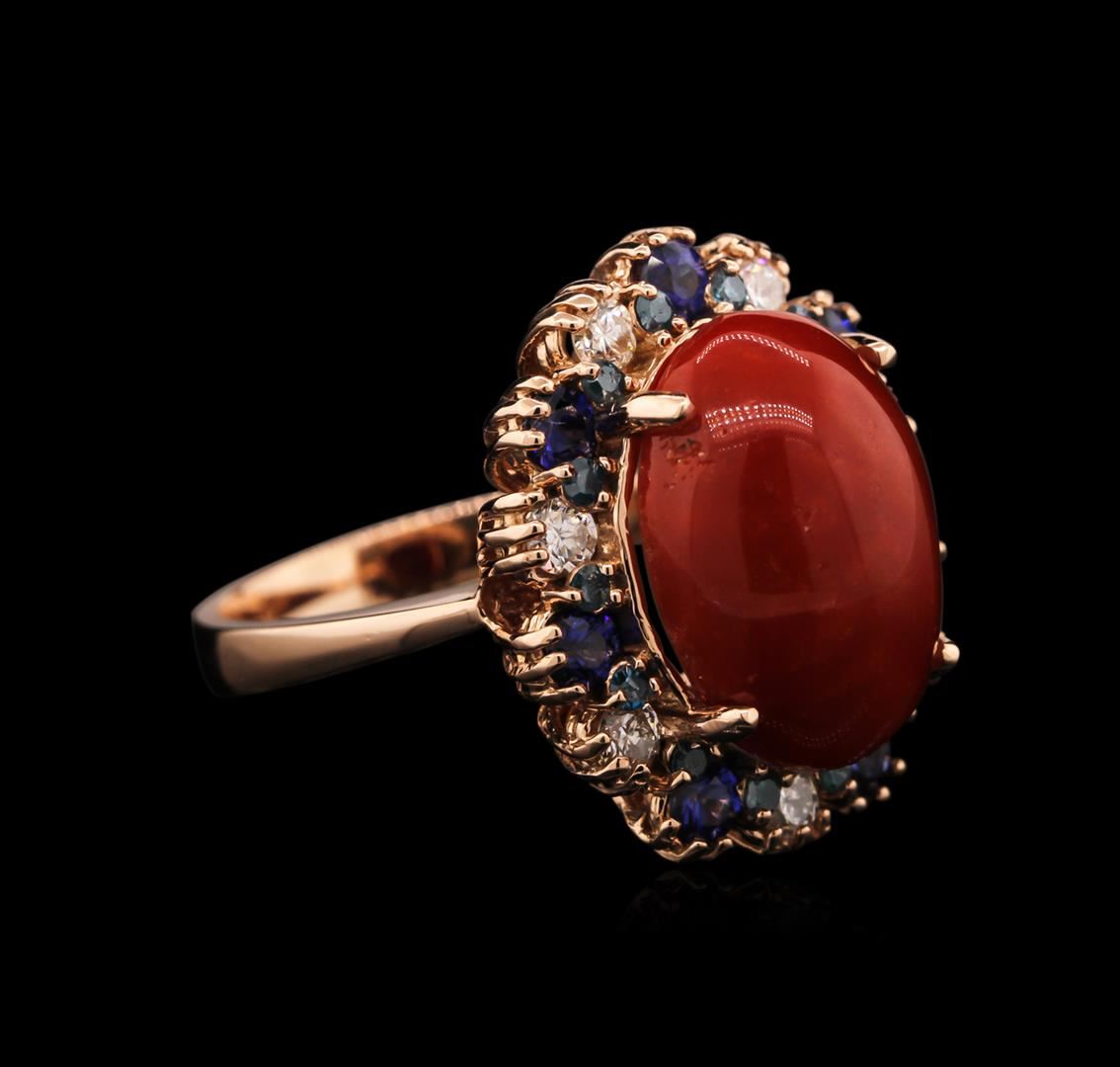 One ring featuring: 14KT rose gold weighing 6.07 grams containing one coral center stone with a total weight of 6.43ct, seven blue sapphires with a total weight of 0.70ct, and 21 white and bluish/green diamonds with a total weight of 0.65ct.