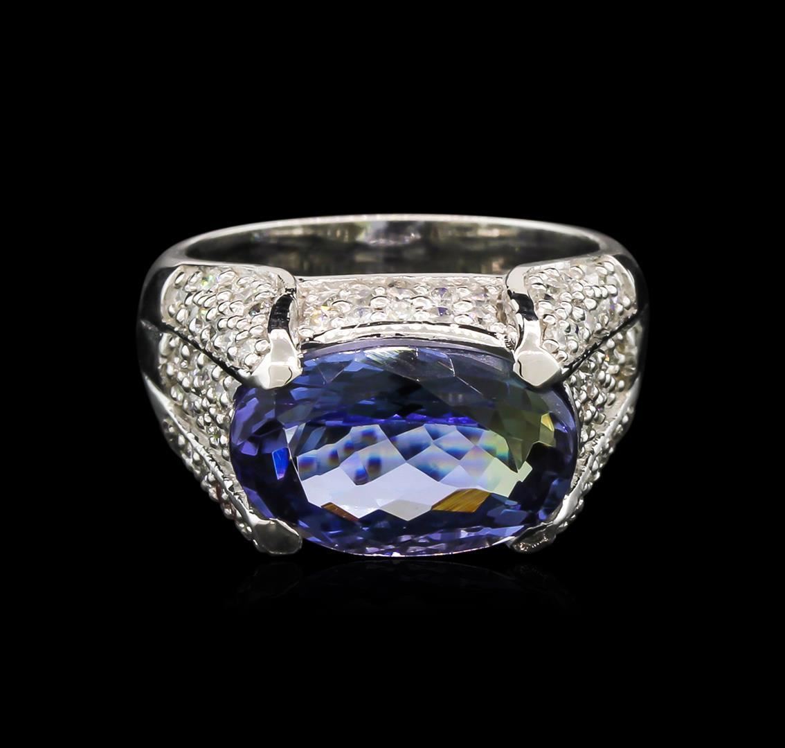 One electronically tested 14KT white gold lady's cast fashion ring with a tapered shank with a bright polish finish. The featured lady's ring has a 4.27 millimeter wide shank. Identified with markings of "K14". Condition is new, good workmanship. Containing: One prong set oval modified brilliant cut natural tanzanite, measuring 13.95 x 9.01 x 6.30mm, 15% bulge factor, approximate weight of 6.48ct., clarity is eye clean, type I, medium light, slightly grayish, bluish violet color, (GIA bV 4/2), cut is good. Transmitting light with no distortion, transparent. Colored gemstones are presumed to have been subjected to commonly used enhancement processes. Graded in the setting. Eighty-Two prong set round brilliant cut diamonds, measuring 1.50 - 1.40 x 0.94mm (depth est.) approximate total weight of 82 Stones = 1.00ct. Graded in the setting. Clarity: SI-2 to I-1. Color: H - I. Cut Good. Total Weight of Colored Stones 6.48ct. Total Weight of Diamonds 1.00ct. Total Weight of Ring 8.40gm. GAS Appraised.