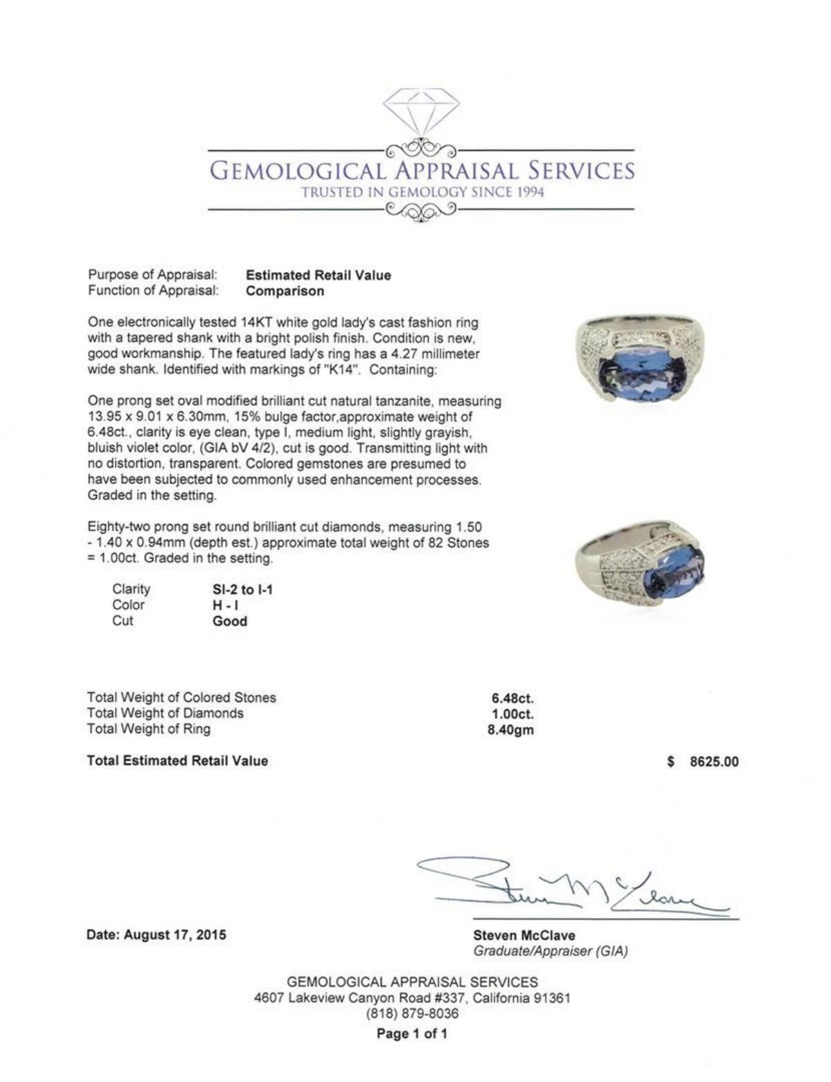 One electronically tested 14KT white gold lady's cast fashion ring with a tapered shank with a bright polish finish. The featured lady's ring has a 4.27 millimeter wide shank. Identified with markings of "K14". Condition is new, good workmanship. Containing: One prong set oval modified brilliant cut natural tanzanite, measuring 13.95 x 9.01 x 6.30mm, 15% bulge factor, approximate weight of 6.48ct., clarity is eye clean, type I, medium light, slightly grayish, bluish violet color, (GIA bV 4/2), cut is good. Transmitting light with no distortion, transparent. Colored gemstones are presumed to have been subjected to commonly used enhancement processes. Graded in the setting. Eighty-Two prong set round brilliant cut diamonds, measuring 1.50 - 1.40 x 0.94mm (depth est.) approximate total weight of 82 Stones = 1.00ct. Graded in the setting. Clarity: SI-2 to I-1. Color: H - I. Cut Good. Total Weight of Colored Stones 6.48ct. Total Weight of Diamonds 1.00ct. Total Weight of Ring 8.40gm. GAS Appraised.