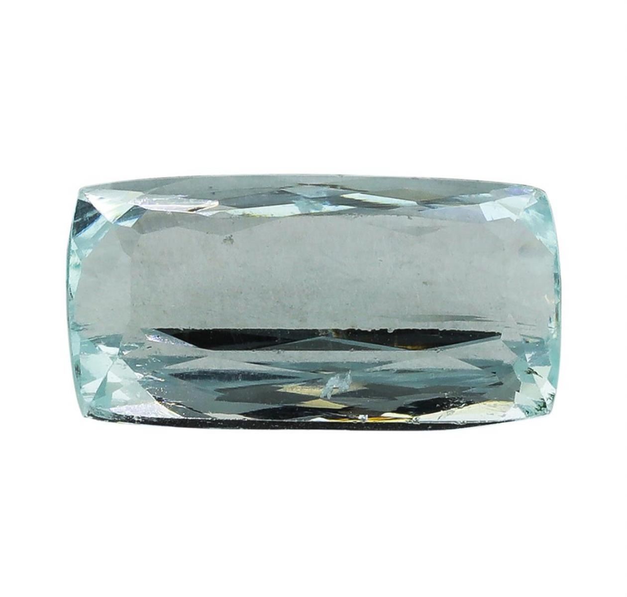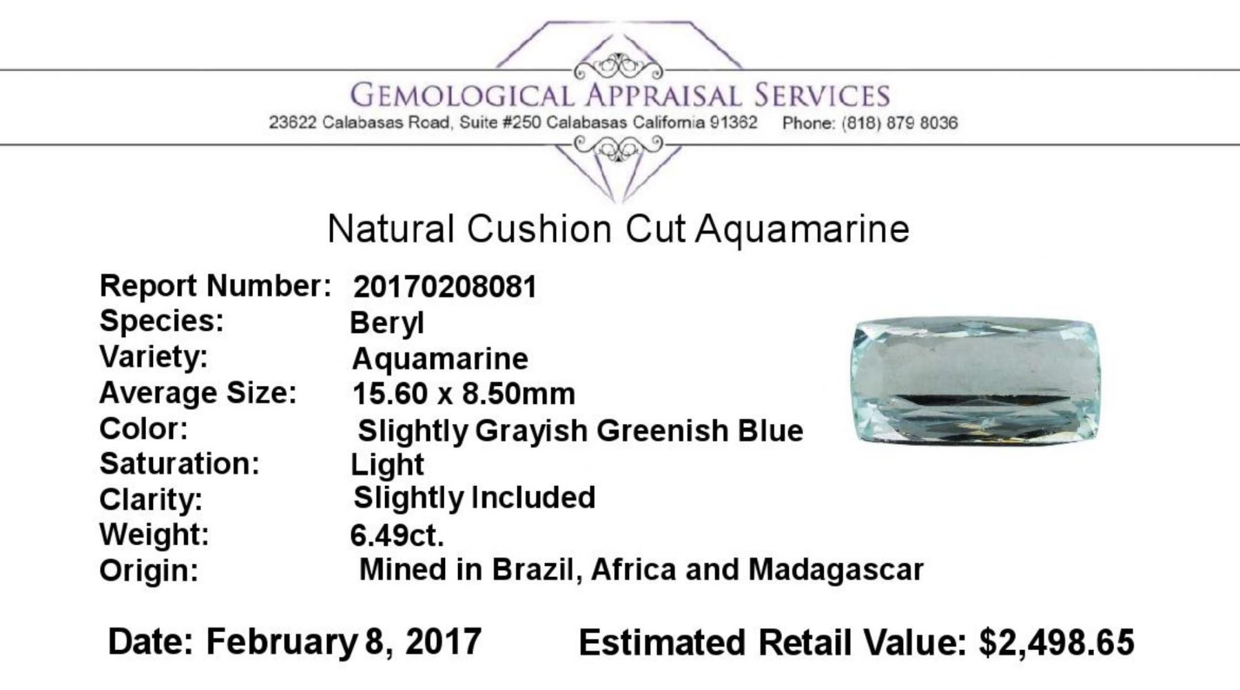 One natural cushion cut aquamarine with an exact weight of 6.49ct., clarity is slightly included, slightly grayish greenish blue, light. Gemological Appraisals Services estimates the retail value at $2498.65 GAS Appraised.