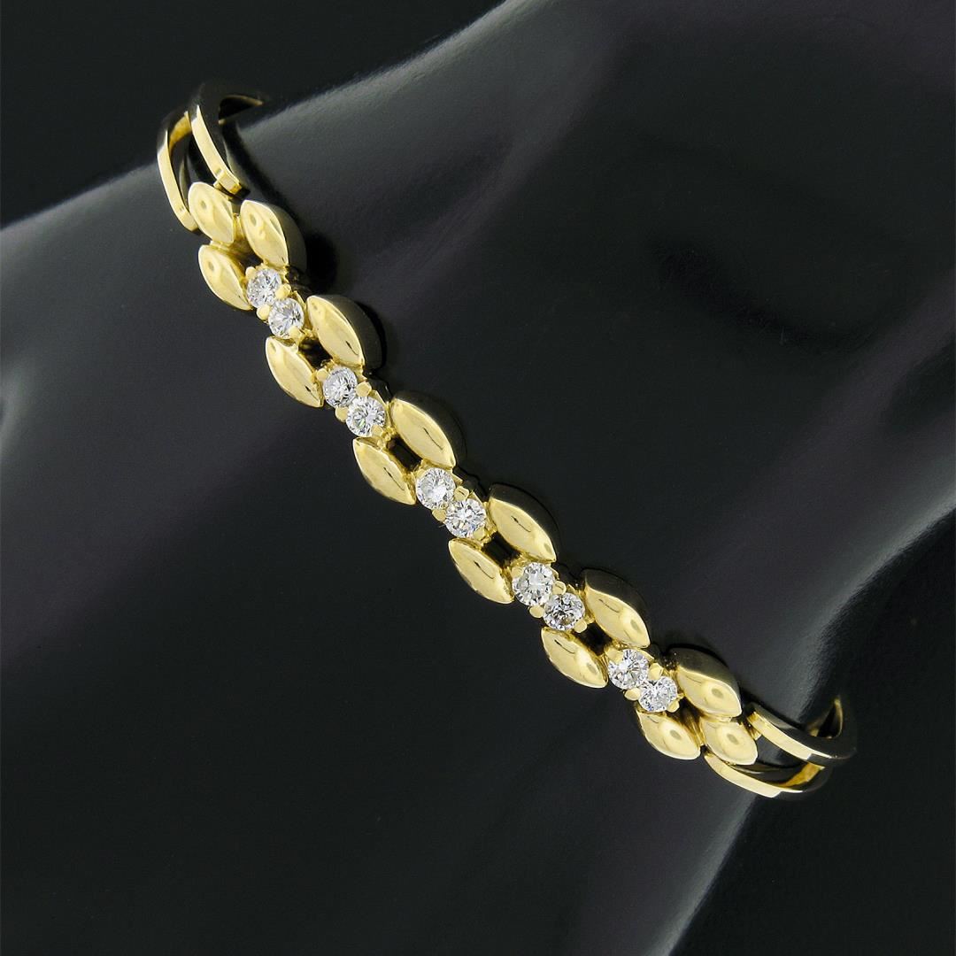 A solid 14k yellow gold open bangle bracelet, with 10 round brilliant cut natural diamonds (G/H - VS2/SI1 ; 0.60ctw). It weighs a total of 12.96 grams, measures 6.9mm wide, and measures 6.5 inches in length.