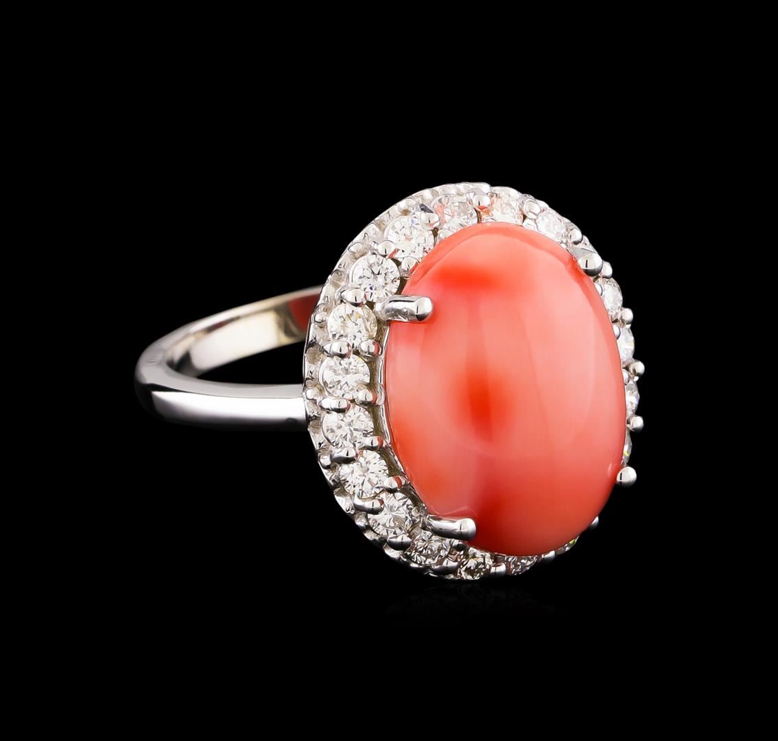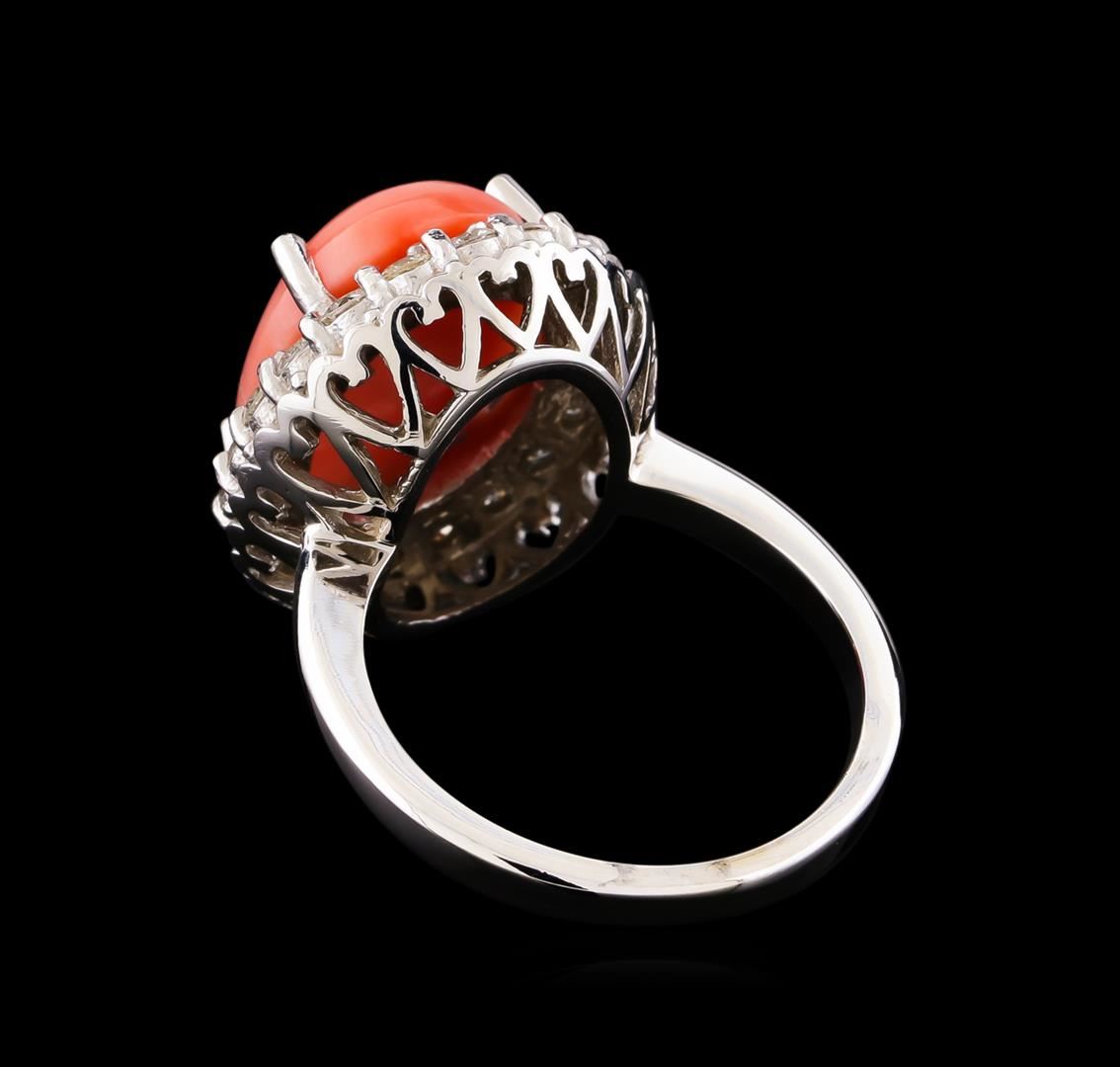 One electronically tested 14KT white gold lady's cast fashion ring with a basket halo with a bright polish finish. The featured lady's ring has a shank measuring 2.52 millimeters wide. Identified with markings of "14K". Condition is new, good workmanship. Containing: One prong set oval cabochon cut natural pink coral, measuring 16.05 x 12.03 x 4.55mm, approximate weight of 6.50ct., cut is good. The featured coral has a marbled coral pattern, ranging in color from pink to light red. Graded in the setting. Twenty prong set round brilliant cut diamonds, measuring 2.30 - 2.25 x 1.41mm (depth est.) approximate total weight of 20 Stones = 0.90ct. Graded in the setting. Clarity: VS-2 to SI-1. Color: H - I. Cut Very Good. Total Weight of Colored Stones 6.50ct. Total Weight of Diamonds 0.90ct. Total Weight of Ring 8.10gm. GAS Appraised.