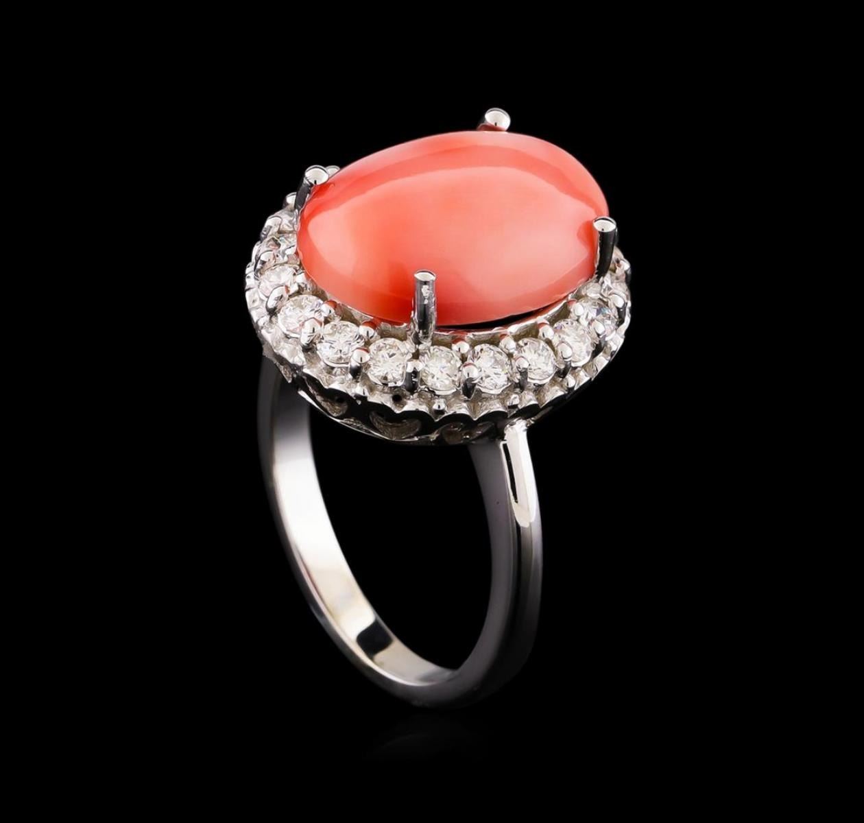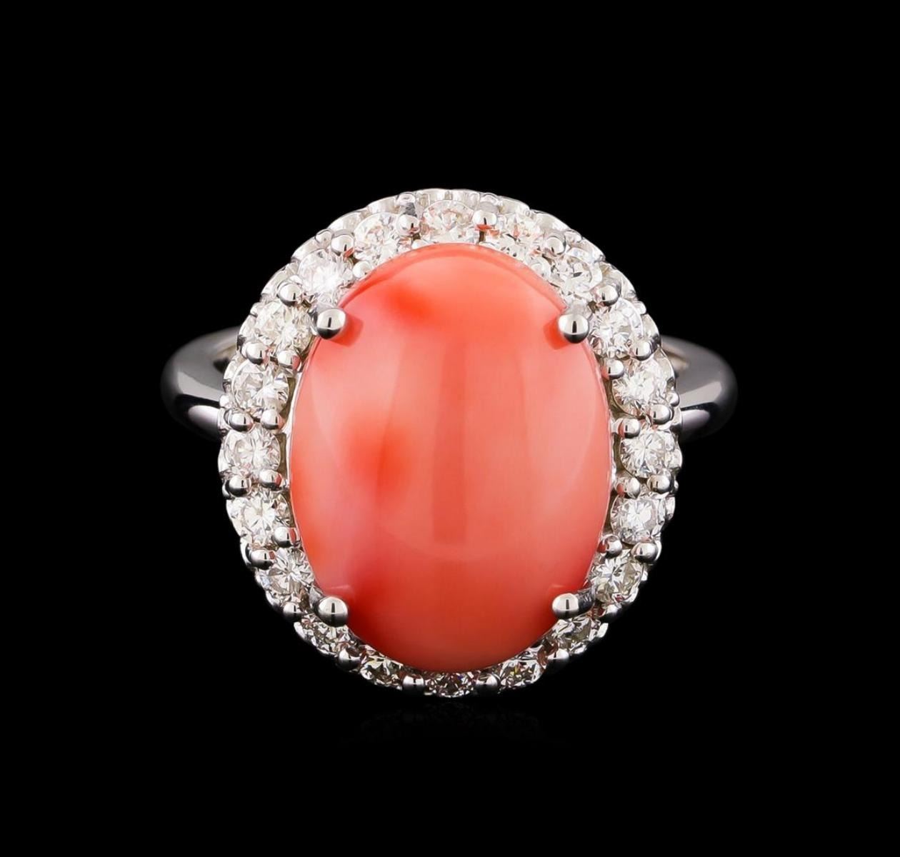 One electronically tested 14KT white gold lady's cast fashion ring with a basket halo with a bright polish finish. The featured lady's ring has a shank measuring 2.52 millimeters wide. Identified with markings of "14K". Condition is new, good workmanship. Containing: One prong set oval cabochon cut natural pink coral, measuring 16.05 x 12.03 x 4.55mm, approximate weight of 6.50 ct., cut is good. The featured coral has a marbled coral pattern, ranging in color from pink to light red. Graded in the setting. Twenty prong set round brilliant cut diamonds, measuring 2.30 - 2.25 x 1.41mm (depth est.) approximate total weight of 20 Stones = 0.90 ct. Graded in the setting. Clarity: VS-2 to SI-1. Color: H - I. Cut Very Good. Total Weight of Colored Stones 6.50 ct. Total Weight of Diamonds 0.90 ct. Total Weight of Ring 8.10gm. GAS Appraised.