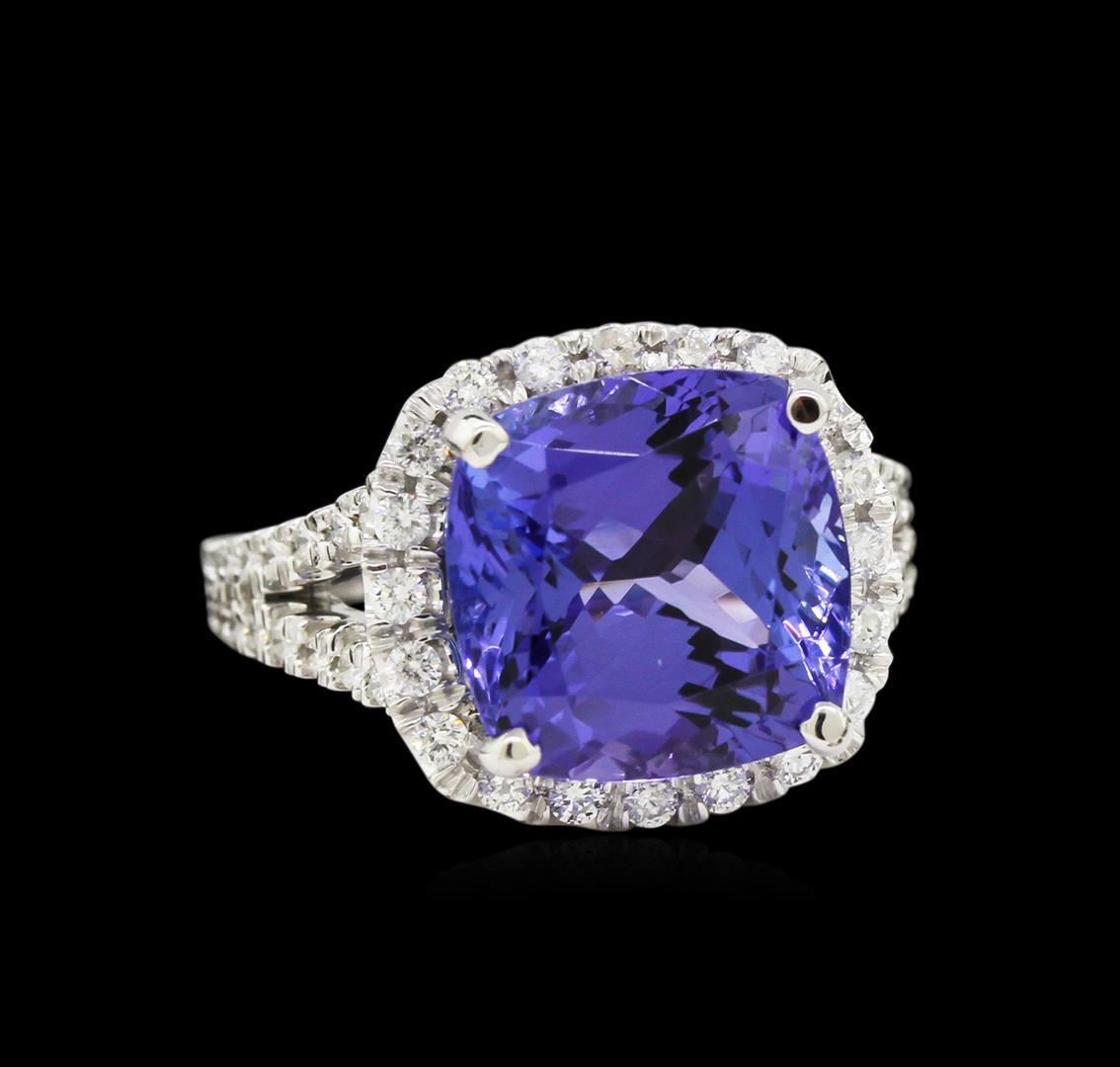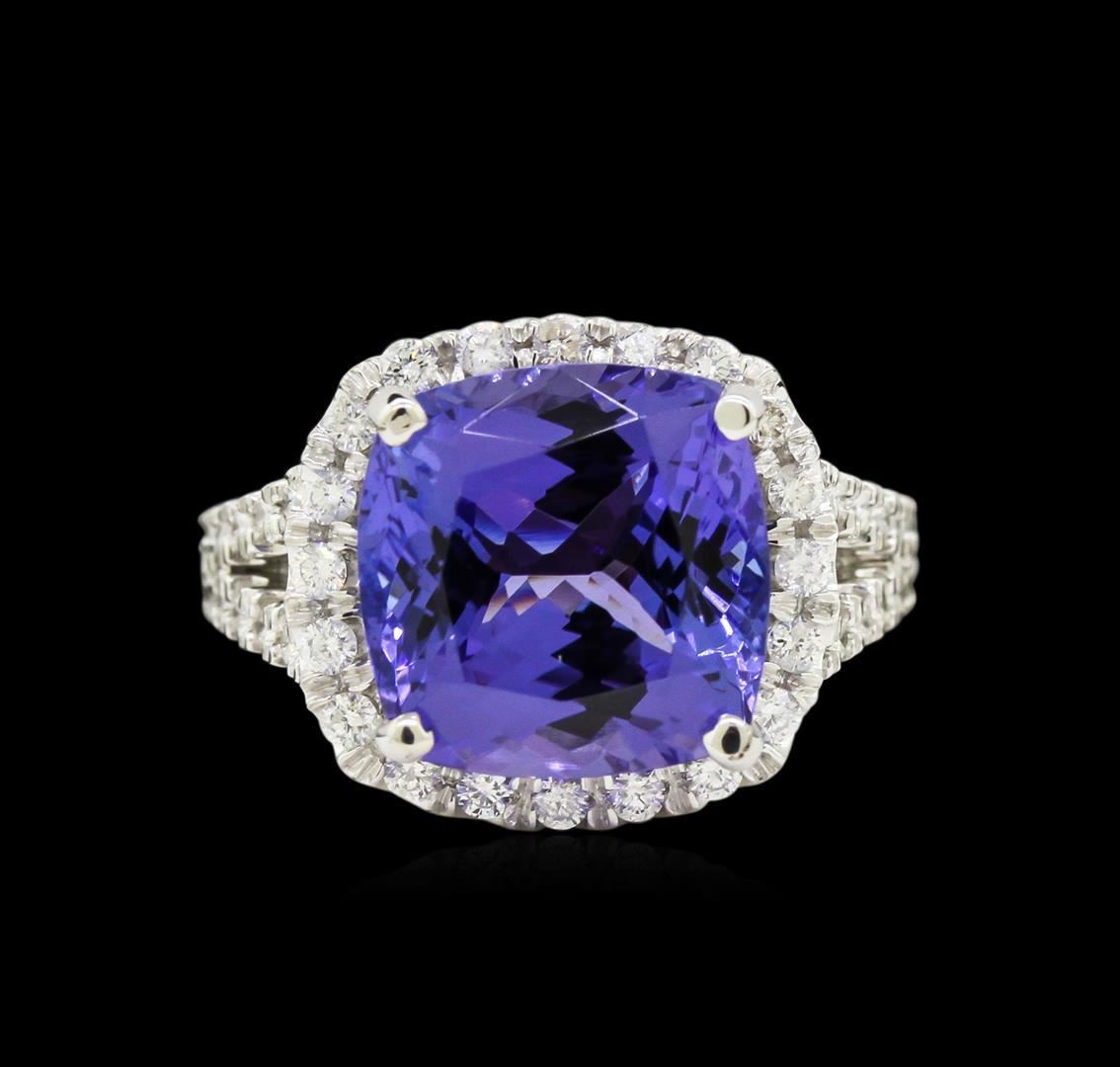 One electronically tested 14KT white gold lady's cast fashion halo ring with a split European shank with a bright polish finish. The featured lady's ring has a shank measuring 2.48 millimeters wide. Identified with markings of "14K". Condition is new, good workmanship. Containing: One prong set square cushion modified brilliant cut natural tanzanite, measuring 10.79 x 10.74 x 6.96mm, 3%. bulge factor, approximate weight of 6.52ct., clarity is eye clean, type I, medium dark, moderately strong, violetish blue color, (GIA vB 6/4), cut is very good. Transmitting light with no distortion, transparent. Colored gemstones are presumed to have been subjected to commonly used enhancement processes. Graded in the setting. Thirty-Six prong set round brilliant cut diamonds, measuring 1.30 - 1.25 x 0.81mm (depth est.) approximate total weight of 36 Stones = 0.30ct. Graded in the setting. Clarity: SI-1 to I-1. Color: H - I. Cut Good Twenty prong set round brilliant cut diamonds, measuring 1.60 - 1.50 x 0.98mm (depth est.) approximate total weight of 20 Stones = 0.30ct. Graded in the setting. Clarity: SI-1 to I-1. Color: H - I. Cut Good. Total Weight of Colored Stones 6.52ct. Total Weight of Diamonds 0.60ct. Total Weight of Ring 7.10gm. GAS Appraised.