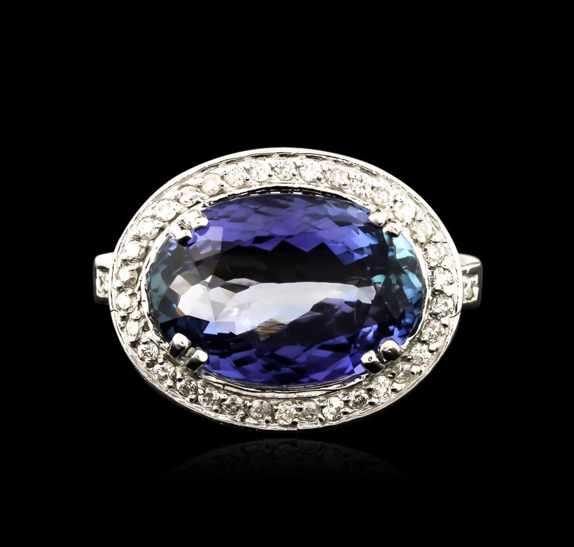 One electronically tested 14KT white gold lady's cast fashion ring with a basket halo with a bright polish finish. The featured lady's ring has a horizontal oval halo and a shank measuring 3.23 millimeters wide. Identified with markings of 'K14'. Condition is new, good workmanship. Containing: One prong set oval modified brilliant cut natural tanzanite, measuring 14.57 x 10.21 x 6.23mm, (depth est.) approximate weight of 6.52ct., clarity is moderately included, medium light, very slightly grayish, violet color, (GIA V 4/3), cut is good. Transmitting light with no distortion, transparent. Colored gemstones are presumed to have been subjected to commonly used enhancement processes. Graded in the setting. Forty-Six prong set round brilliant cut diamonds, measuring 1.35 - 1.30 x 0.80mm (depth est.) approximate total weight of 46 Stones = 0.39ct. Graded in the setting. Clarity SI-2 to I-1. Color: I - J Cut Good. Total Weight of Colored Stones 6.52ct.. Total Weight of Diamonds 0.39ct.. Total Weight of Ring 6.40gm. GAS Appraised.
