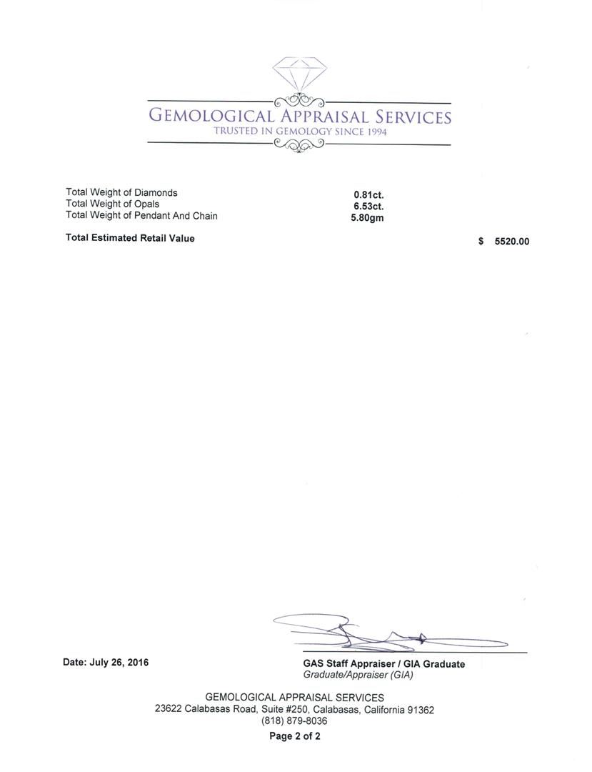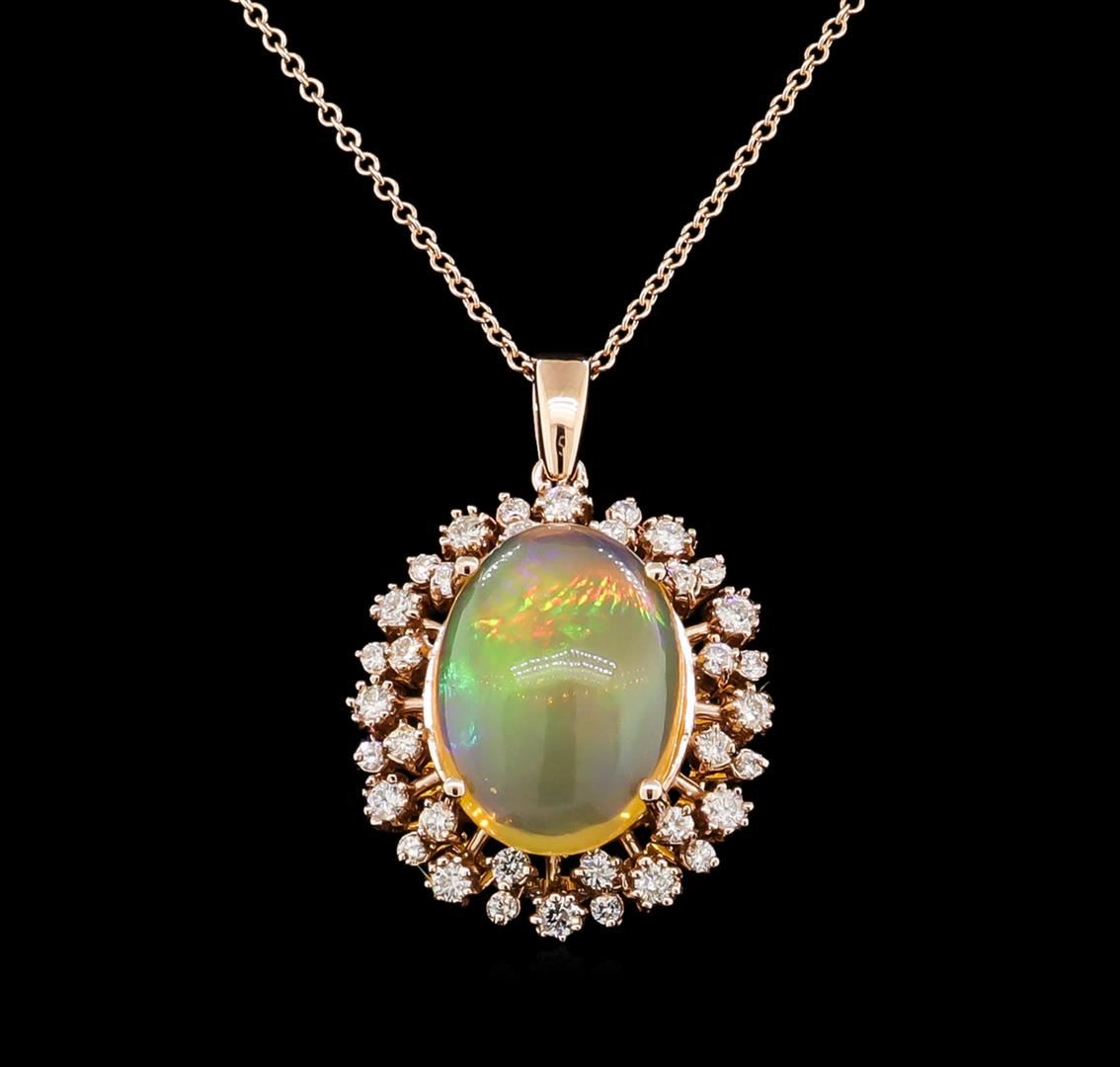 One electronically tested 14KT rose gold lady's combination cast & assembled fashion pendant and chain 18.0' long, 1.3mm round cable link with a lobster claw clasp with a bright polish finish. The featured lady's pendant and chain has a drop measuring 32 millimeters in length. Identified with markings of '14K'. Condition is new, good workmanship. Containing: Twelve prong set round brilliant cut diamonds, measuring 2.10 - 2.00 x 1.25mm (depth est.) approximate total weight of 12 Stones = 0.38ct. Graded in the setting. Clarity SI-1 to I-1. Color: H - I Cut Good Twelve prong set round brilliant cut diamonds, measuring 1.90 - 1.80 x 1.14mm (depth est.) approximate total weight of 12 Stones = 0.28ct. Graded in the setting. Clarity SI-1 to SI-2. Color: H - I Cut Good One orange crystal that is cut in a oval shaped cabochon and is prong set, measuring 17.32 mm long x 12.46 mm wide, and 6.70 mm thick and the approximate weight is 6.53 carats. The opal has a somewhat bright, multicolor play of color (fire) in a rolling flashfire pattern; a medium dome; a good cut; no inclusions; consistent in its brightness and pattern; and is slightly directional. Graded in the setting. Twelve prong set round brilliant cut diamonds, measuring 1.55 - 1.45 x 0.93mm (depth est.) approximate total weight of 12 Stones = 0.15ct. Graded in the setting. Clarity SI-1 to SI-2. Color: H - I Cut Good. Total Weight of Diamonds 0.81ct.. Total Weight of Opals 6.53ct.. Total Weight of Pendant And Chain 5.80gm. GAS Appraised.