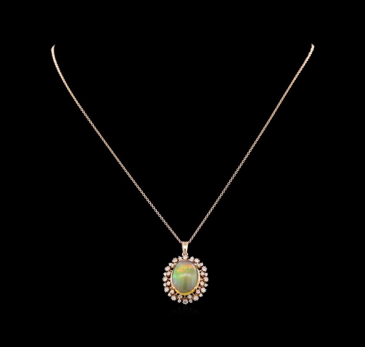 One electronically tested 14KT rose gold lady's combination cast & assembled fashion pendant and chain 18.0' long, 1.3mm round cable link with a lobster claw clasp with a bright polish finish. The featured lady's pendant and chain has a drop measuring 32 millimeters in length. Identified with markings of '14K'. Condition is new, good workmanship. Containing: Twelve prong set round brilliant cut diamonds, measuring 2.10 - 2.00 x 1.25mm (depth est.) approximate total weight of 12 Stones = 0.38ct. Graded in the setting. Clarity SI-1 to I-1. Color: H - I Cut Good Twelve prong set round brilliant cut diamonds, measuring 1.90 - 1.80 x 1.14mm (depth est.) approximate total weight of 12 Stones = 0.28ct. Graded in the setting. Clarity SI-1 to SI-2. Color: H - I Cut Good One orange crystal that is cut in a oval shaped cabochon and is prong set, measuring 17.32 mm long x 12.46 mm wide, and 6.70 mm thick and the approximate weight is 6.53 carats. The opal has a somewhat bright, multicolor play of color (fire) in a rolling flashfire pattern; a medium dome; a good cut; no inclusions; consistent in its brightness and pattern; and is slightly directional. Graded in the setting. Twelve prong set round brilliant cut diamonds, measuring 1.55 - 1.45 x 0.93mm (depth est.) approximate total weight of 12 Stones = 0.15ct. Graded in the setting. Clarity SI-1 to SI-2. Color: H - I Cut Good. Total Weight of Diamonds 0.81ct.. Total Weight of Opals 6.53ct.. Total Weight of Pendant And Chain 5.80gm. GAS Appraised.