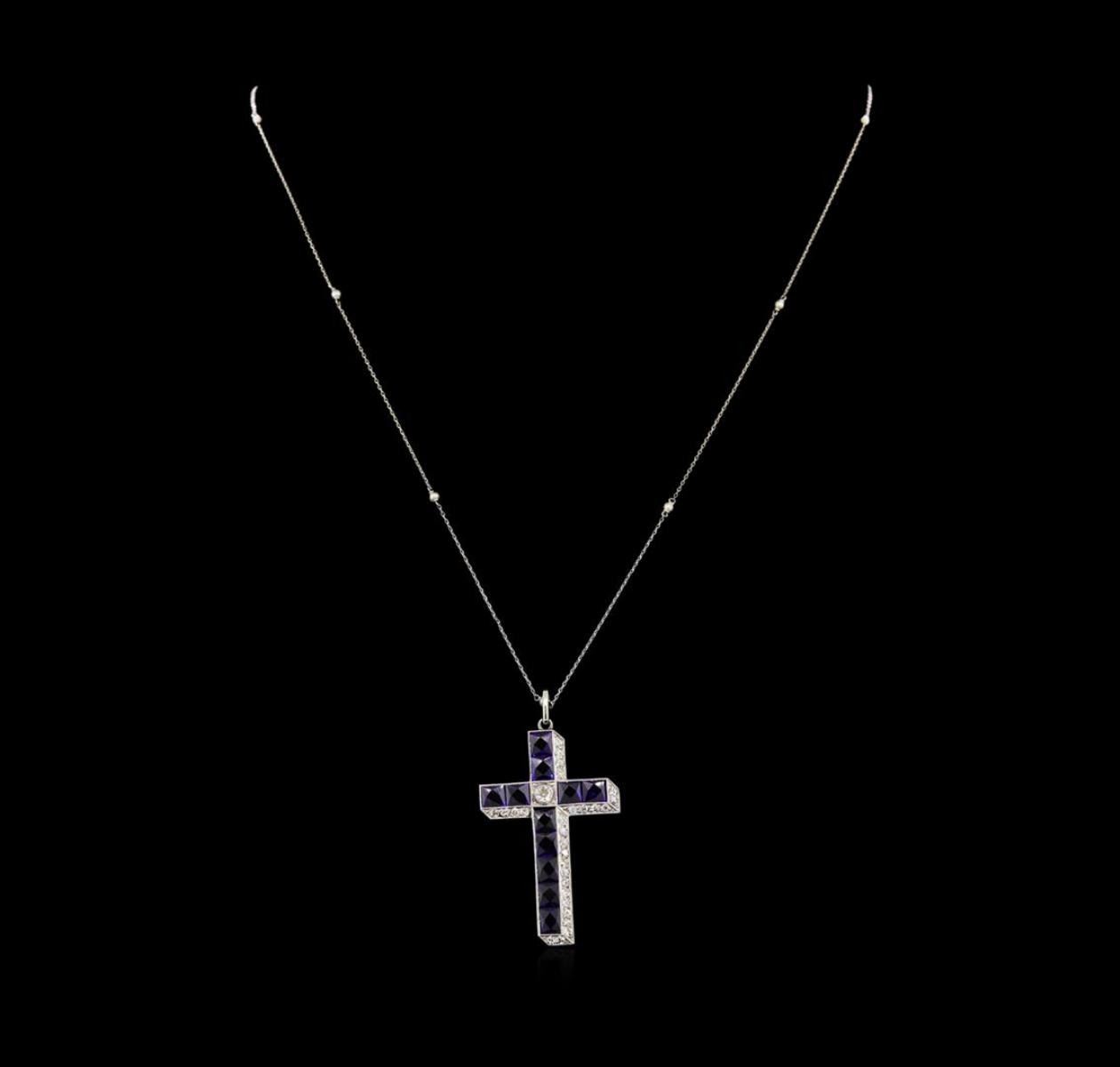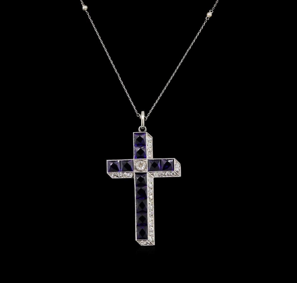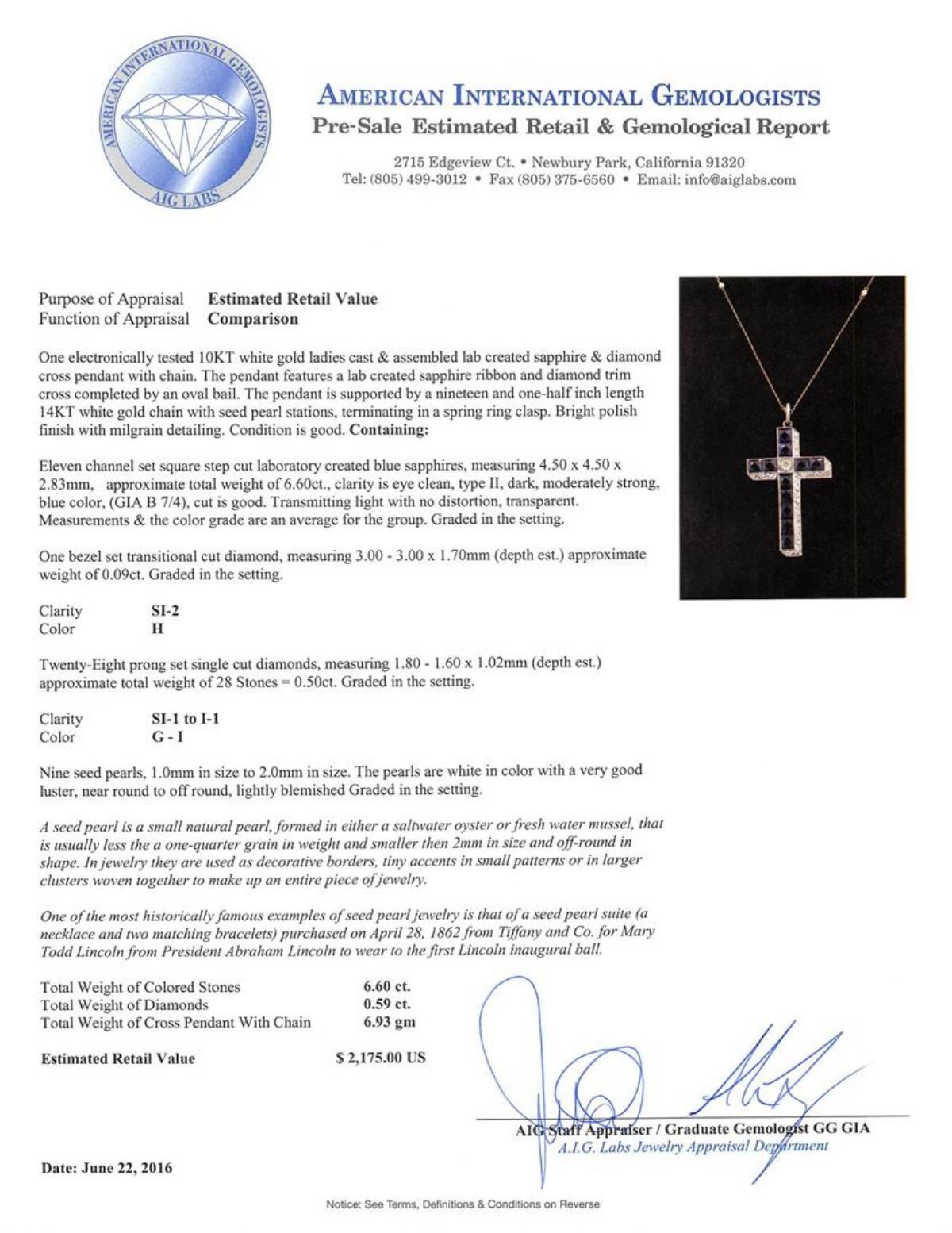 One electronically tested 10KT white gold ladies cast & assembled lab created sapphire & diamond cross pendant with chain. The pendant features a lab created sapphire ribbon and diamond trim cross completed by an oval bail. The pendant is supported by a nineteen and one-half inch length 14KT white gold chain with seed pearl stations, terminating in a spring ring clasp. Bright polish finish with milgrain detailing. Condition is good. Containing: Eleven channel set square step cut laboratory created blue sapphires, measuring 4.50 x 4.50 x 2.83mm, approximate total weight of 6.60ct., clarity is eye clean, type II, dark, moderately strong, blue color, (GIA B 7/4), cut is good. Transmitting light with no distortion, transparent. Measurements & the color grade are an average for the group. Graded in the setting. One bezel set transitional cut diamond, measuring 3.00. - 3.00. x 1.70mm (depth est.) approximate weight of 0.09ct. Graded in the setting. Clarity: SI-2 . Color: H Twenty-Eight prong set single cut diamonds, measuring 1.80 - 1.60 x 1.02mm (depth est.) approximate total weight of 28 Stones = 0.50ct. Graded in the setting. Clarity: SI-1 to I-1 . Color: G - I Nine seed pearls, 1.0mm in size to 2.0mm in size. The pearls are white in color with a very good luster, near round to off round, lightly blemished Graded in the setting. A seed pearl is a small natural pearl, formed in either a saltwater oyster or fresh water mussel, that is usually less the a one-quarter grain in weight and smaller then 2mm in size and off-round in shape. In jewelry they are used as decorative borders, tiny accents in small patterns or in larger clusters woven together to make up an entire piece of jewelry. One of the most historically famous examples of seed pearl jewelry is that of a seed pearl suite (a necklace and two matching bracelets) purchased on April 28, 1862 from Tiffany and Co. for Mary Todd Lincoln from President Abraham Lincoln to wear to the first Lincoln inaugural ball.. Total Weight of Colored Stones 6.60ct.. Total Weight of Diamonds 0.59ct.. Total Weight of Cross Pendant With Chain 6.93gm. AIG Appraised.