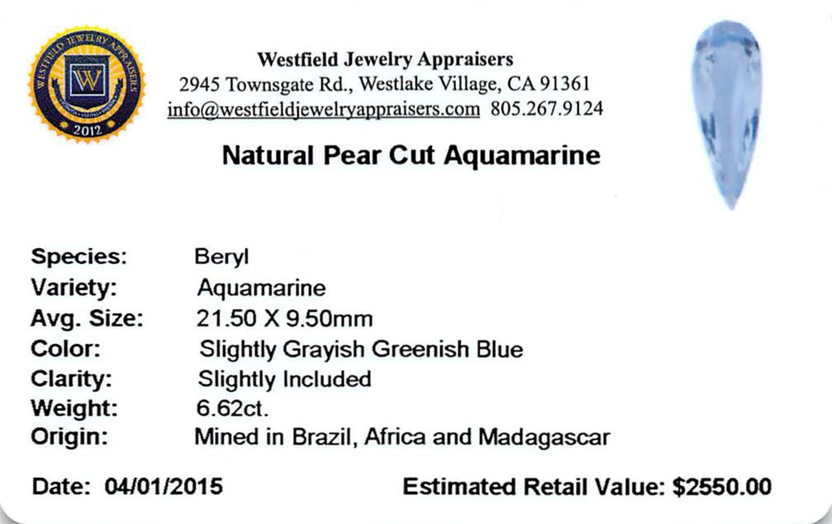 One pear cut natural aquamarine exact weight 6.62ct., clarity is slightly included, type I, medium, very slightly grayish, very slightly greenish blue color, (GIA vslgB 5/3), cut is good. Westfield Appraised.