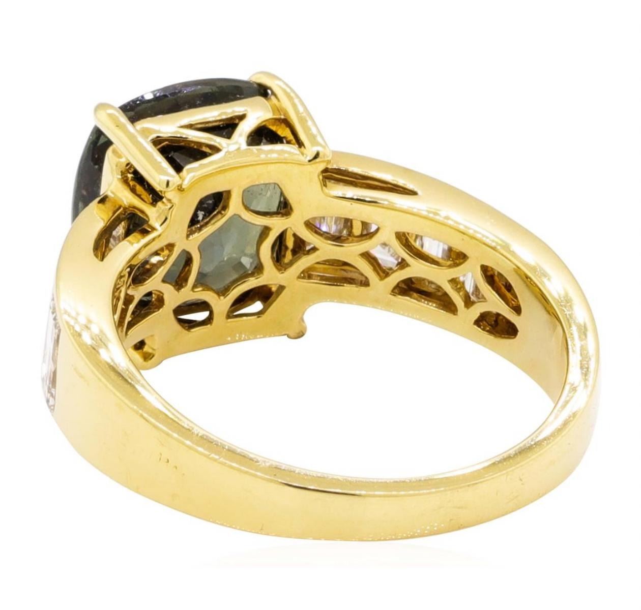One electronically tested 18KT yellow gold lady's cast fashion ring with a straight line with a bright polish finish. The featured lady's ring has a shank measuring 2.40 millimeters wide. Identified with markings of '18K'. Condition is new, good workmanship. Containing: One prong set square cushion modified mixed cut natural color change sapphire, measuring 9.54 x 9.15 x 5.94mm, (depth est.) 10%. bulge factor, approximate weight of 5.41ct., clarity is slightly included, medium, very slightly grayish, cut is good. The featured color change sapphire changes color from bluish green to gray-purple. There are no indications of heat treatment. Graded in the setting in the GIA Laboratory, Report #6173832319. Eight channel set emerald cut diamonds, measuring 4.30 x 2.40 x 1.61mm (depth est.) approximate total weight of 8 Stones = 1.21ct. Graded in the setting. Color F - G Clarity VS-1 to VS-2 Cut Excellent. Total Weight of Colored Stones 5.41ct.. Total Weight of Diamonds 1.21ct.. Total Weight of Ring 6.00gm GAS Appraised at $17290.00. GAS Appraised.
