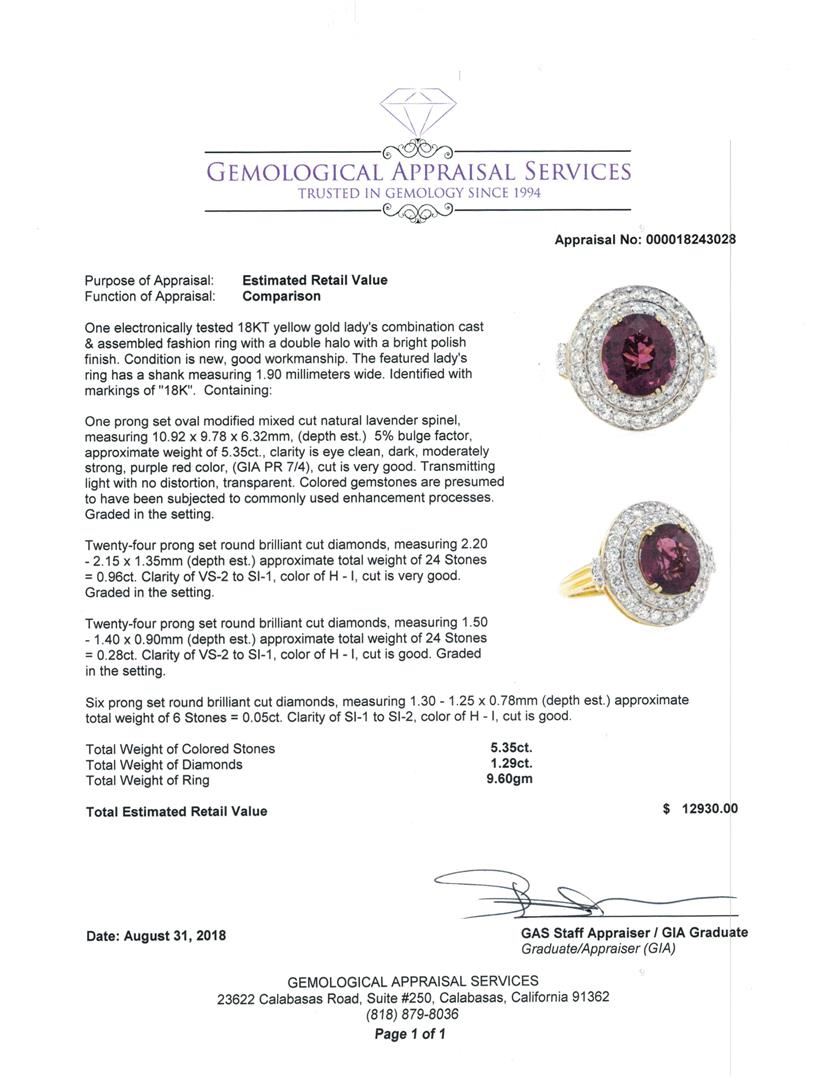 One electronically tested 18KT yellow gold lady's combination cast & assembled fashion ring with a double halo with a bright polish finish. The featured lady's ring has a shank measuring 1.90 millimeters wide. Identified with markings of '18K'. Condition is new, good workmanship. Containing: One prong set oval modified mixed cut natural lavender spinel, measuring 10.92 x 9.78 x 6.32mm, (depth est.) 5%. bulge factor, approximate weight of 5.35ct., clarity is eye clean, dark, moderately strong, purple red color, (GIA PR 7/4), cut is very good. Transmitting light with no distortion, transparent. Colored gemstones are presumed to have been subjected to commonly used enhancement processes. Graded in the setting. Twenty-Four prong set round brilliant cut diamonds, measuring 2.20 - 2.15 x 1.35mm (depth est.) approximate total weight of 24 Stones = 0.96ct. Graded in the setting. Color H - I Clarity VS-2 to SI-1 Cut Very Good Twenty-Four prong set round brilliant cut diamonds, measuring 1.50 - 1.40 x 0.90mm (depth est.) approximate total weight of 24 Stones = 0.28ct. Graded in the setting. Color H - I Clarity VS-2 to SI-1 Cut Good Six prong set round brilliant cut diamonds, measuring 1.30 - 1.25 x 0.78mm (depth est.) approximate total weight of 6 Stones = 0.05ct. Color H - I Clarity SI-1 to SI-2 Cut Good. Total Weight of Colored Stones 5.35ct.. Total Weight of Diamonds 1.29ct.. Total Weight of Ring 9.60gm GAS Appraised at $12930.00. GAS Appraised.