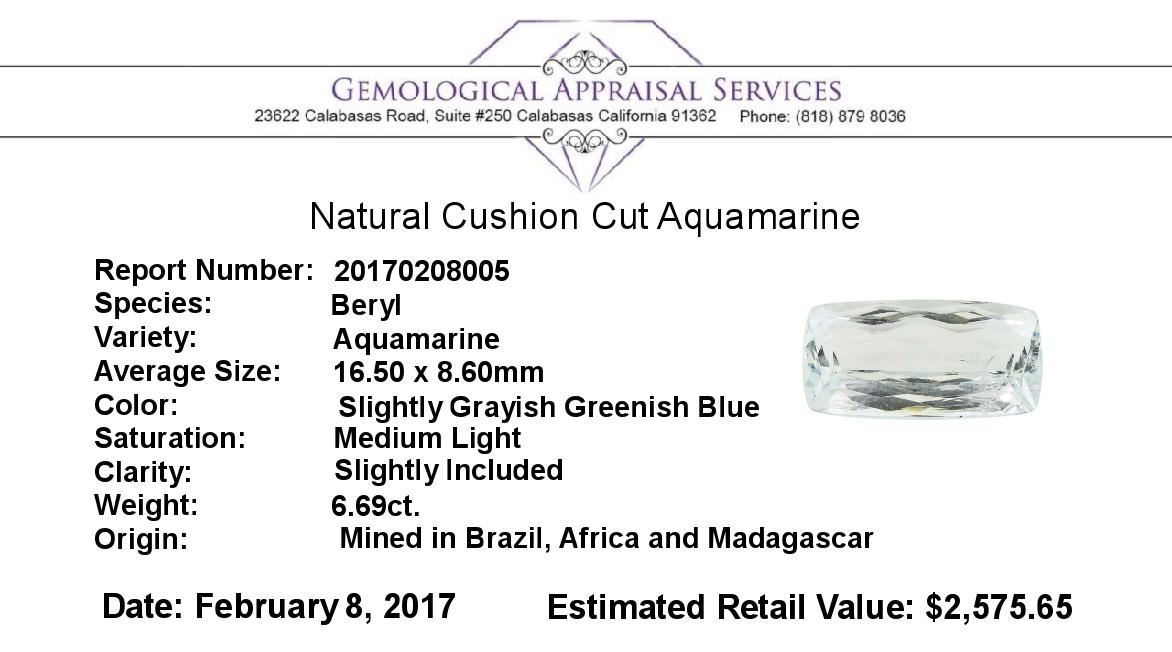 One natural cushion cut aquamarine with an exact weight of 6.69ct., clarity is slightly included, slightly grayish greenish blue, medium light. Gemological Appraisals Services estimates the retail value at $2575.65 GAS Appraised.