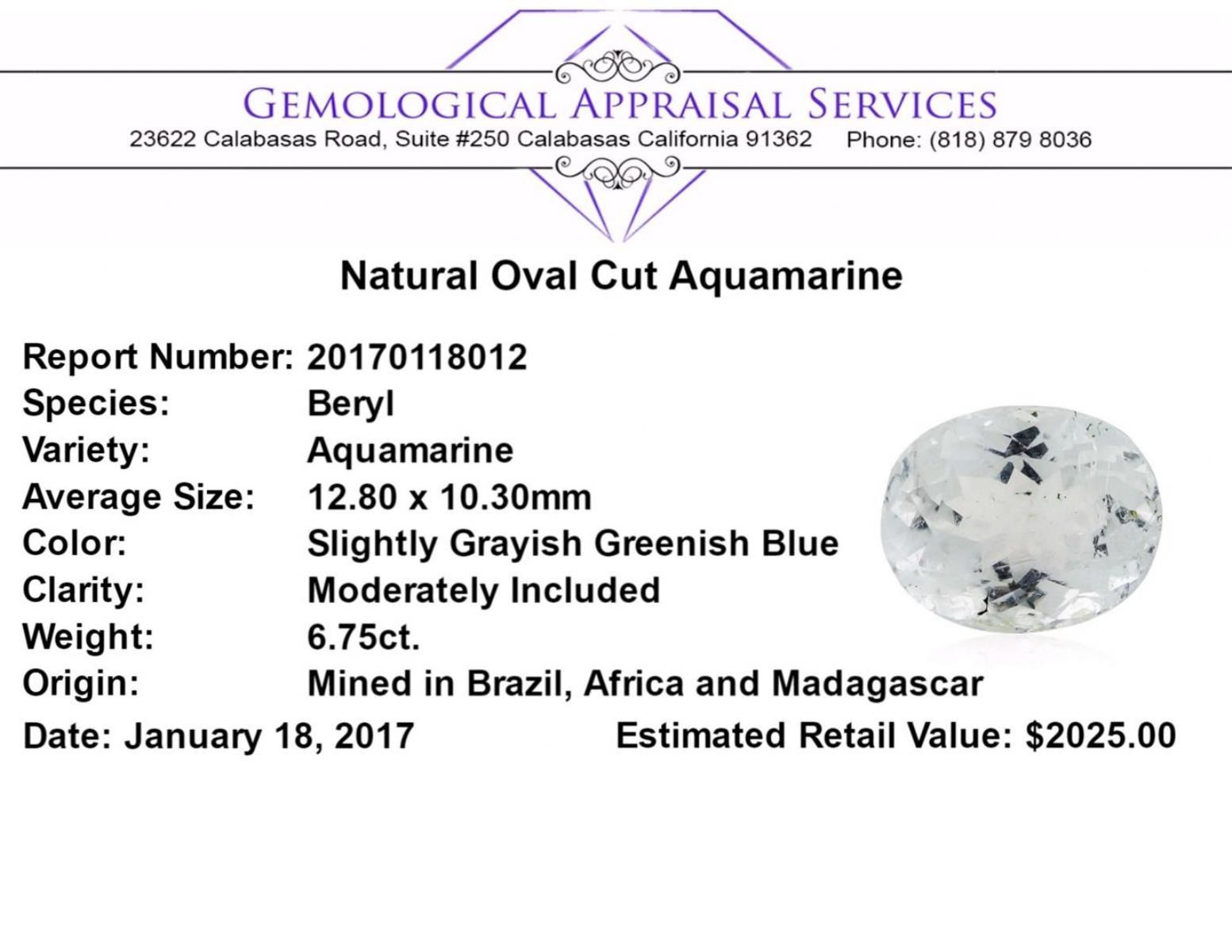 One natural oval cut aquamarine with an exact weight of 6.75ct., clarity is moderately included, slightly grayish greenish blue. Gemological Appraisals Services estimates the retail value at $2025 GAS Appraised.
