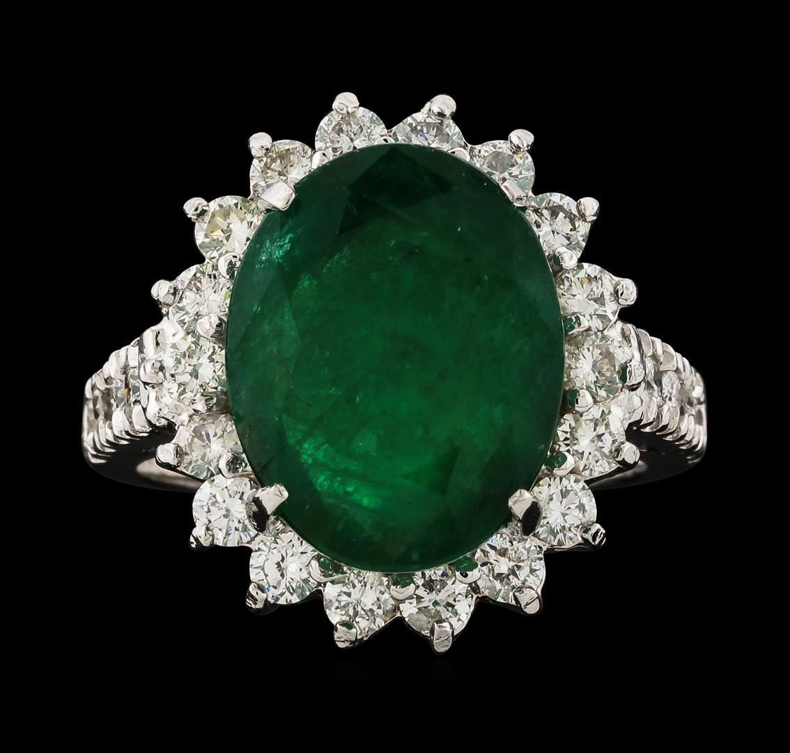 One electronically tested 14KT white gold lady's cast fashion ring with a cathedral shank with a basket halo with a bright polish finish. The featured lady's ring has a shank measuring 2.15 millimeters wide. Identified with markings of 'K14'. Condition is new, good workmanship. Containing: One prong set oval modified mixed cut natural emerald, measuring 14.05 x 10.90 x 6.45mm, (depth est.) 15%. bulge factor, approximate weight of 6.78ct., clarity is heavily included, medium dark, moderately strong, green color, (GIA G 6/4), cut is good. Transmitting light somewhat diffusely, semi-transparent to translucent. Naturally occurring internal & external characteristics are present. Indications of oil residue. Colored gemstones are presumed to have been subjected to commonly used enhancement processes. Graded in the setting. Eighteen prong set round brilliant cut diamonds, measuring 2.40 - 2.30 x 1.46mm (depth est.) approximate total weight of 18 Stones = 0.90ct. Graded in the setting. Clarity SI-1 to SI-2. Color: G - I Cut Good Eight prong set round brilliant cut diamonds, measuring 2.05 - 1.95 x 1.24mm (depth est.) approximate total weight of 8 Stones = 0.25ct. Graded in the setting. Clarity SI-1 to SI-2. Color: G - H Cut Good. Total Weight of Colored Stones 6.78ct.. Total Weight of Diamonds 1.15ct.. Total Weight of Ring 7.30gm. GAS Appraised.