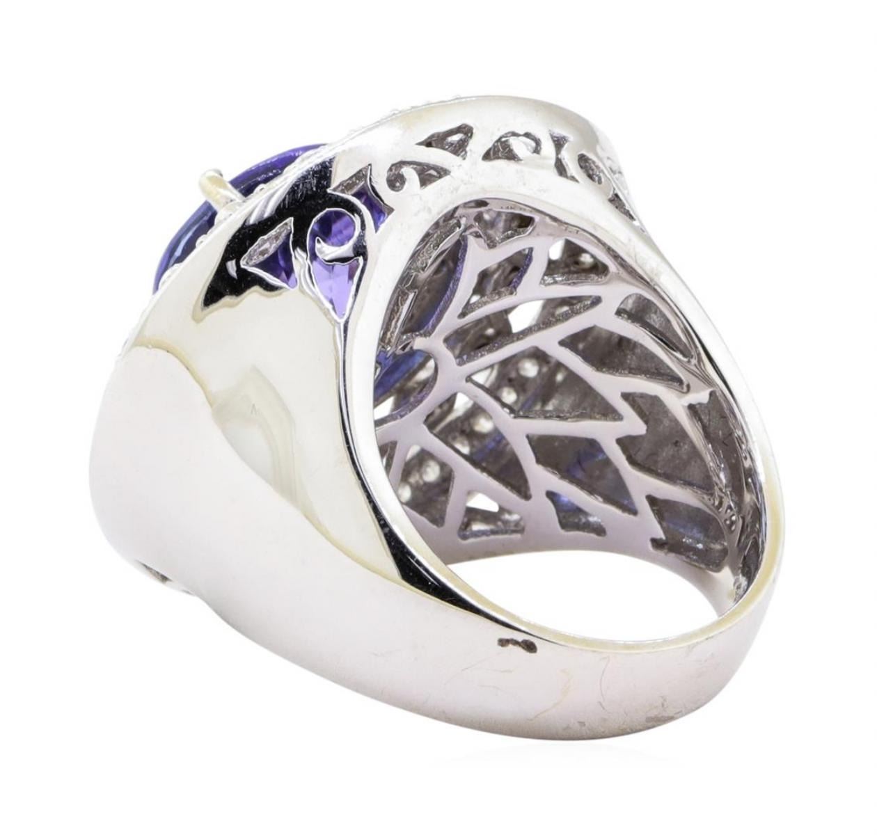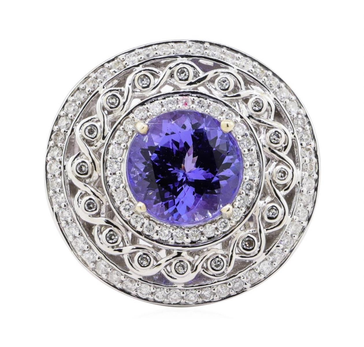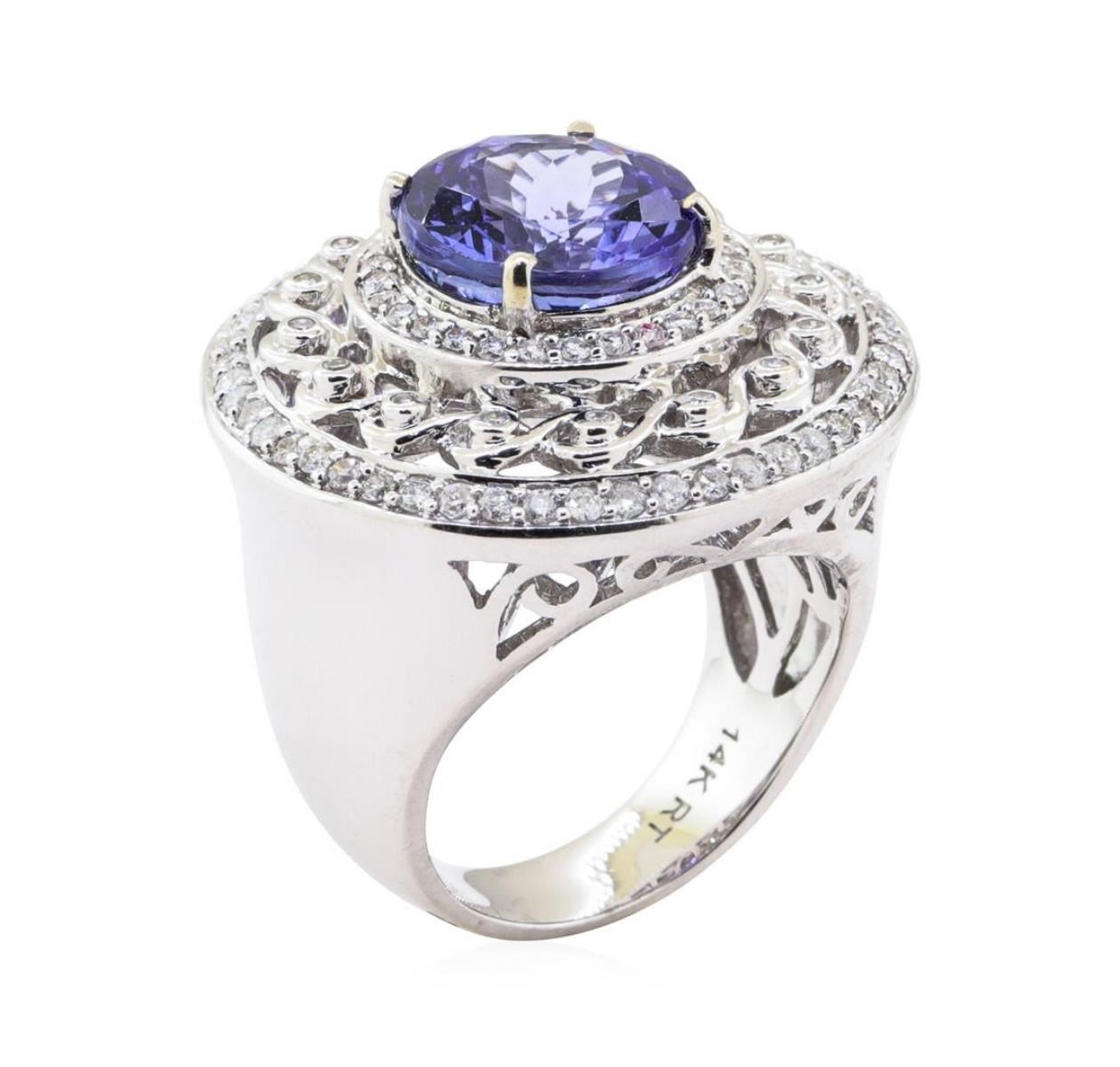 One electronically tested 14KT white gold ladies cast tanzanite & diamond ring with a bright finish. The featured tanzanite is set within three unique diamond bezels, supported by an elaborate white gold under gallery, and tapering shoulders, completed by a five millimeter wide band. Trademark is RT. Identified with markings of "14K". Condition is new, good workmanship. Containing: One prong set round mixed cut natural tanzanite, measuring 11.10 - 11.00 x 7.90 mm, approximate weight of 6.94ct., clarity is eye clean, type I, medium dark, slightly grayish, violet color, (GIA V 6/2) to medium dark, slightly grayish, bluish purple, (GIA bP 6/2), cut is good. Transmitting light with no distortion, transparent. Graded in the setting. Tanzanite is a very rare gemstone that is only found in the country of Tanzania. Originally discovered in 1967. Tiffany & Company, named the stone Tanzanite. It is found in the Usumburu Mountains that border the Umba Valley of northern Tanzania. Tanzanite occurs in gray, brown, violet, blue, reddish-purple, & green. The gem is interesting because of its exceptional pleochroism. Rotated in different directions a tanzanite will exhibit multiple changes of color. Tanzanite has a low tolerance to ultrasonic cleaning, and should not be cleaned using this method. Sixteen bezel set single cut diamonds, measuring 1.20 - 1.20 x 0.72mm (depth est.) approximate total weight of 16 Stones = 0.10ct. Set & graded in the central bezel. Clarity VS-2 to SI-2 Color H - I Seventy-Seven prong set round brilliant cut diamonds, measuring 1.60 - 1.40 x 0.90mm (depth est.) approximate total weight of 77 Stones = 0.86ct. Set & graded in the inner and the outer bezel. Clarity I-1 to I-2 Color G - I Total Weight of Colored Stones 6.94 ct. Estimated Retail Value $ 22,100.00 US
