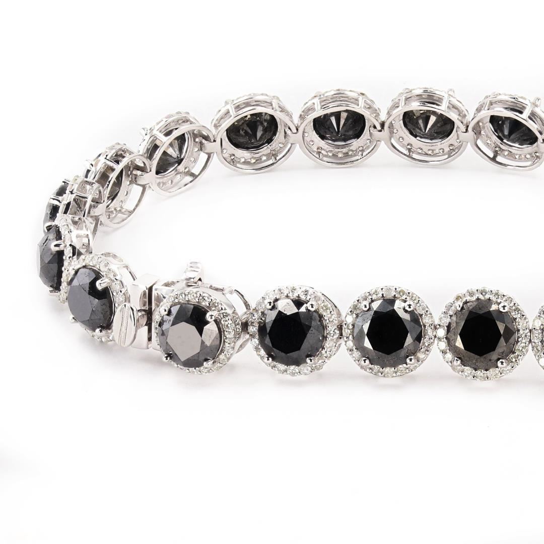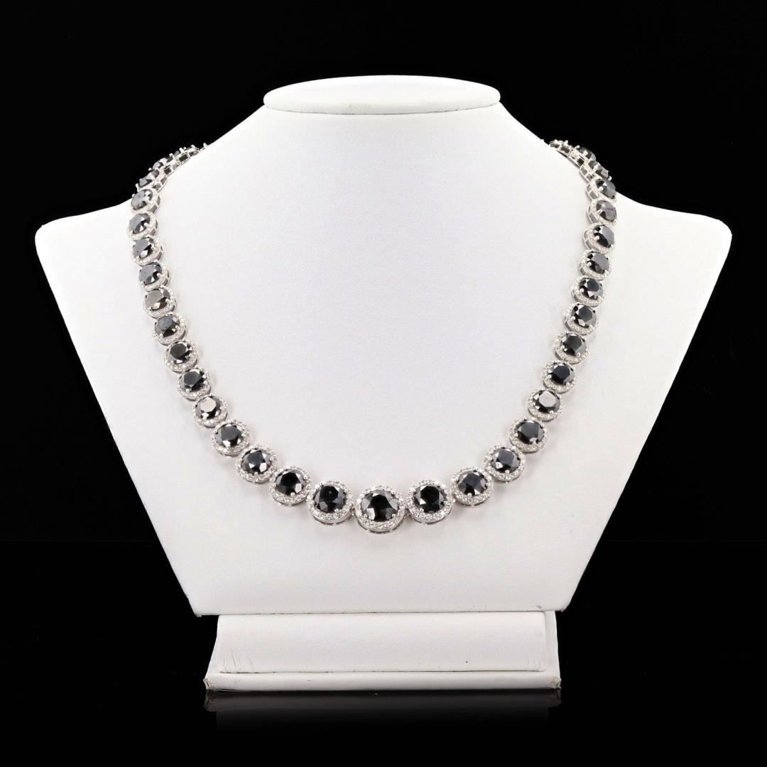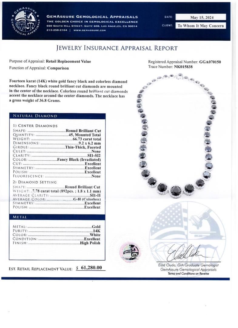 Fourteen karat (14K) white gold fancy black and colorless diamond necklace. Fancy black round brilliant cut diamonds are mounted in the center of the necklace. Colorless round brilliant cut diamonds accent the necklace around the center diamonds. The necklace has a gross weight of 36.8 Grams. #NATURAL DIAMONDS# 1) CENTER DIAMONDS SHAPE: Round Brilliant Cut QUANTITY: 43, Mounted Total WEIGHT: 66.73 carat total DIMENSIONS: 9.2 x 6.2mm GIRDLE: Thin-Thick, Faceted CULET: None CLATRITY: SI1-SI2 COLOR: Fancy Black (Irradiated) CUT: Excellent SYMMETRY: Excellent POLISH: Excellent FUORESCENCE: None 2) DIAMOND SETTING SHAPE: Round Brilliant Cut WEIGHT: 7.78 carat total (892pcs, 1.8 x 1.1mm) AVERAGE CLARITY: SI1-I1 AVERAGE COLOR: G-H (Colorless) SYMMETRY: Excellent POLISH: Excellent #METAL# METAL: Gold PURITY: 14K COLOR: White CONDITION: Excellent FINISH: High Polish Size: 17