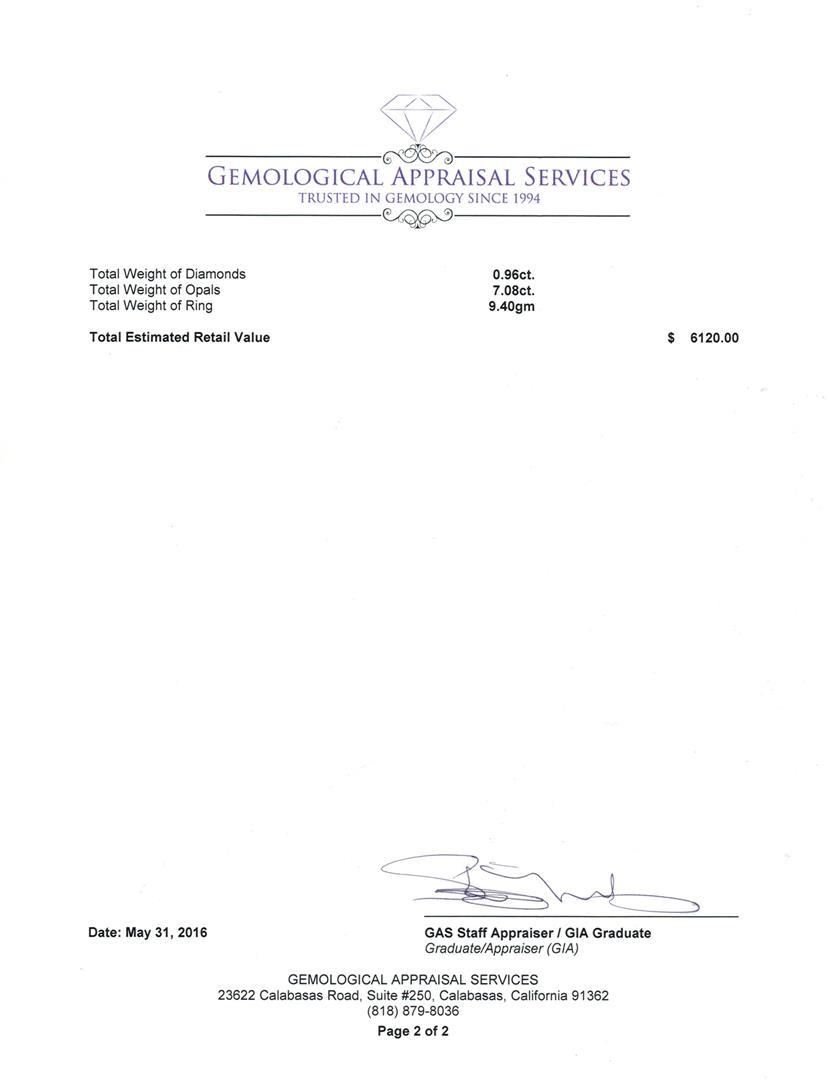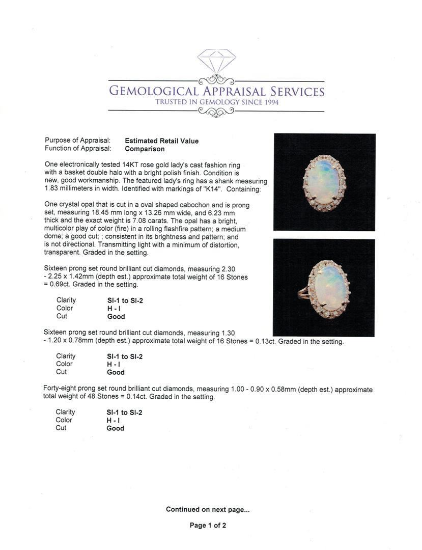 One electronically tested 14KT rose gold lady's cast fashion ring with a basket double halo with a bright polish finish. The featured lady's ring has a shank measuring 1.83 millimeters in width. Identified with markings of "K14". Condition is new, good workmanship. Containing: One crystal opal that is cut in a oval shaped cabochon and is prong set, measuring 18.45 mm long x 13.26 mm wide, and 6.23 mm thick and the exact weight is 7.08 carats. The opal has a bright, multicolor play of color (fire) in a rolling flashfire pattern; a medium dome; a good cut; ; consistent in its brightness and pattern; and is not directional. Transmitting light with a minimum of distortion, transparent. Graded in the setting. Sixteen prong set round brilliant cut diamonds, measuring 2.30 - 2.25 x 1.42mm (depth est.) approximate total weight of 16 Stones = 0.69ct. Graded in the setting. Clarity: SI-1 to SI-2. Color: H - I. Cut Good Sixteen prong set round brilliant cut diamonds, measuring 1.30 - 1.20 x 0.78mm (depth est.) approximate total weight of 16 Stones = 0.13ct. Graded in the setting. Clarity: SI-1 to SI-2. Color: H - I. Cut Good Forty-Eight prong set round brilliant cut diamonds, measuring 1.00 - 0.90 x 0.58mm (depth est.) approximate total weight of 48 Stones = 0.14ct. Graded in the setting. Clarity: SI-1 to SI-2. Color: H - I. Cut Good. Total Weight of Diamonds 0.96ct. Total Weight of Opals 7.08ct. Total Weight of Ring 9.40gm. GAS Appraised.