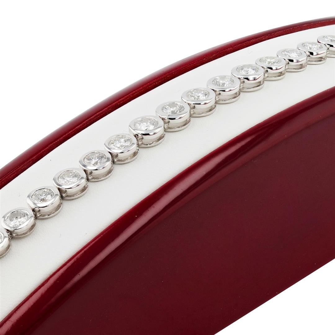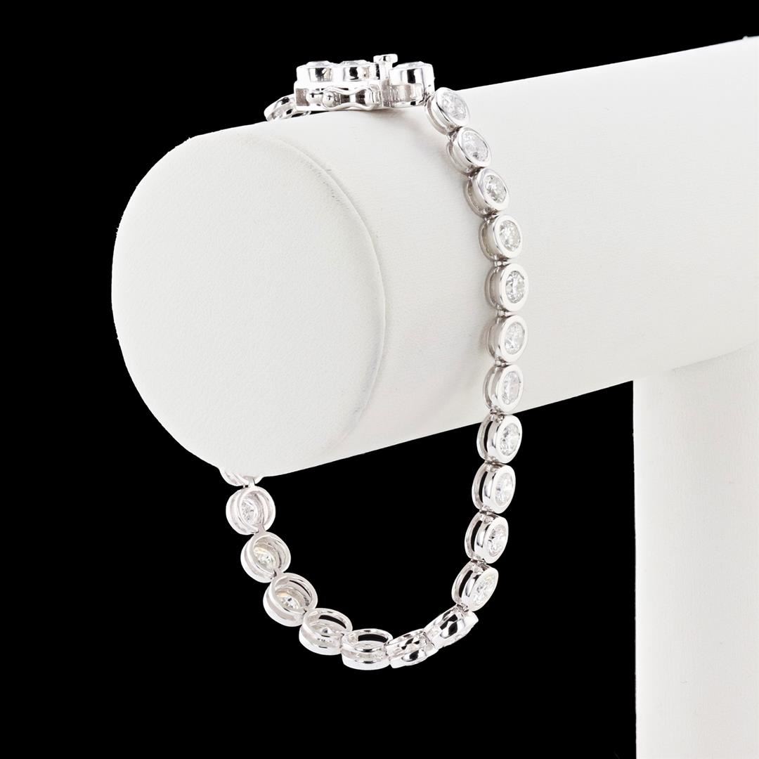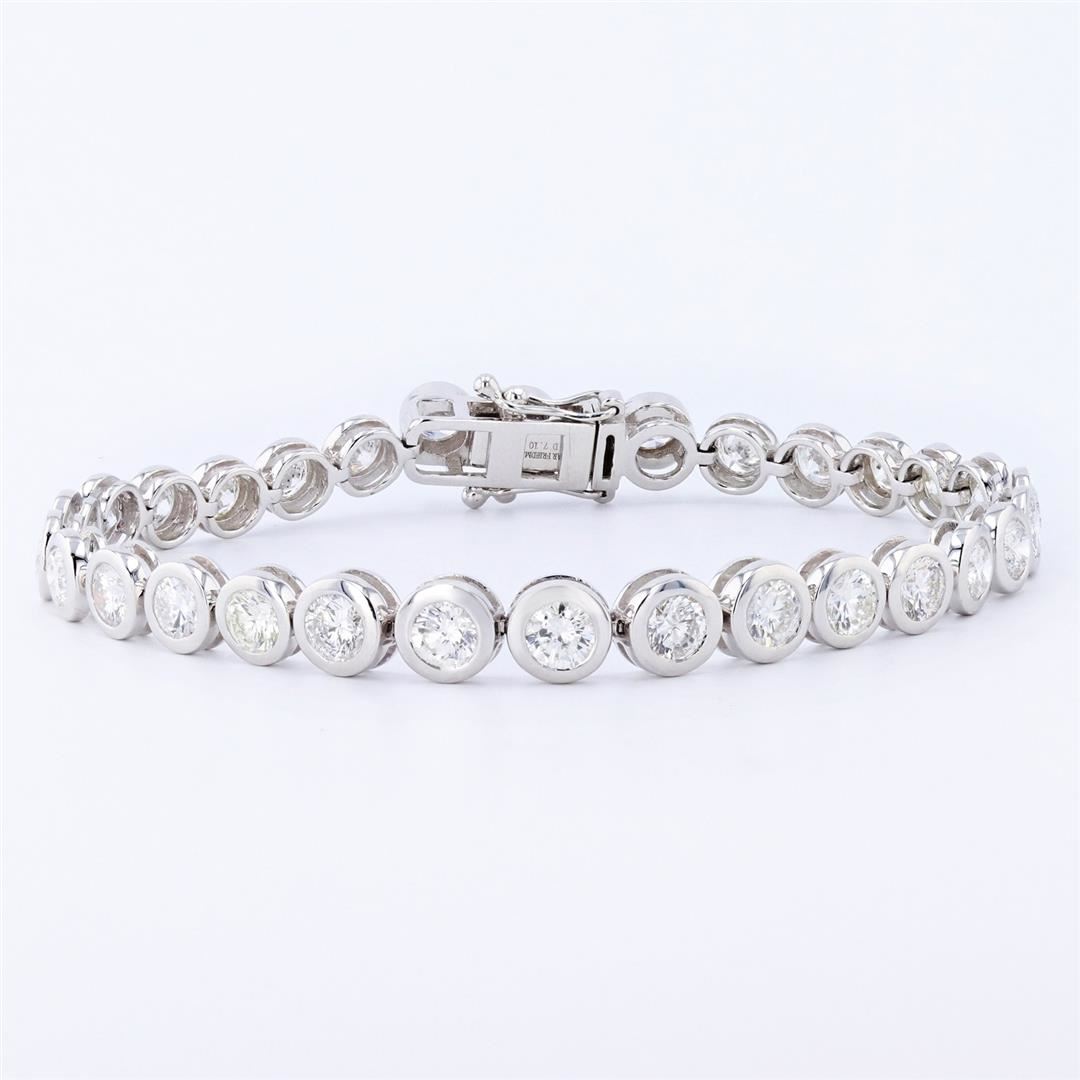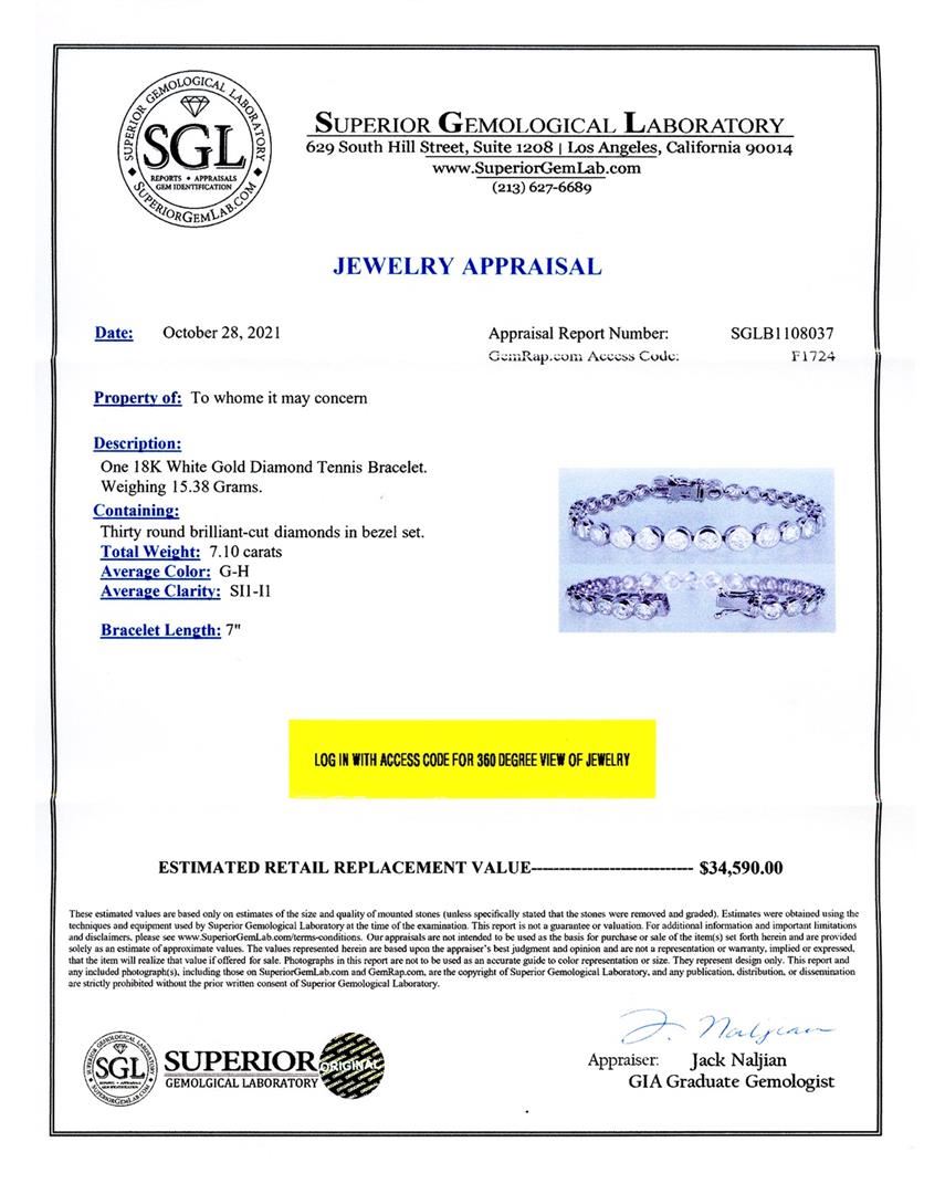 One 18K White Gold Diamond Tennis Bracelet. Weighing 15.38 Grams. Containing: Thirty round brilliant-cut diamonds in bezel set. Total Weight: 7.10 carats Average Color: G - H Average Clarity: SI1 to I1 Bracelet Length: 7"