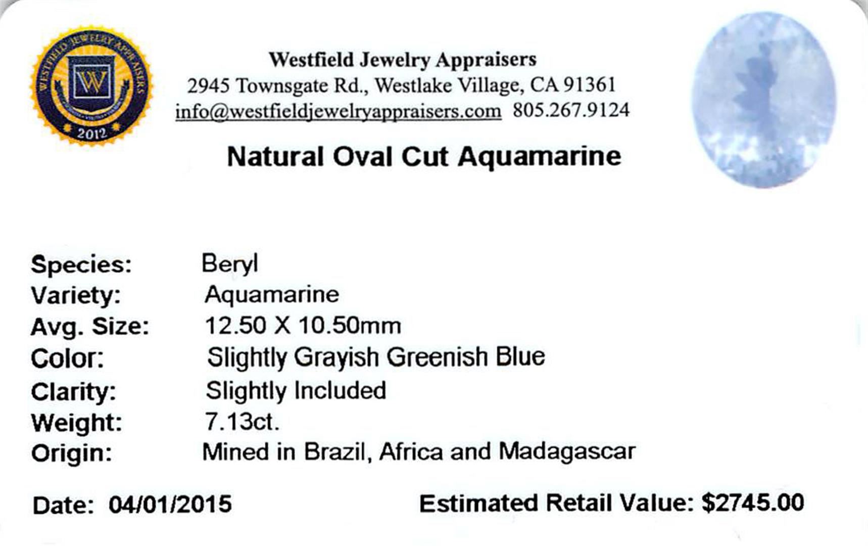 _x000D_One oval cut natural aquamarine exact weight 7.13ct., clarity is slightly included, type I, medium light, very slightly grayish, very slightly greenish blue color, (GIA vslgB 4/3), cut is good. Westfield Appraised.