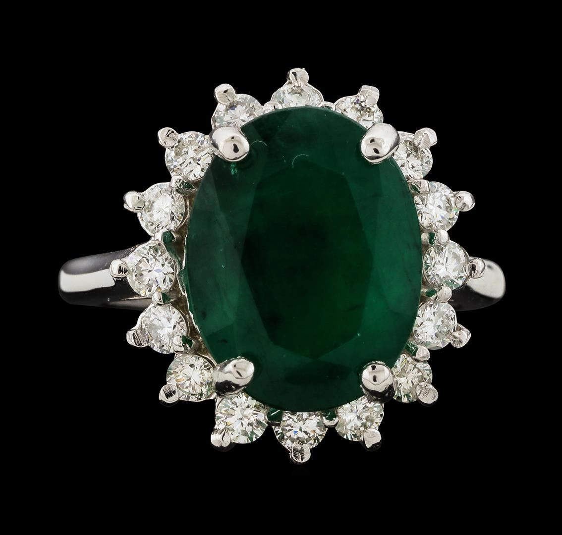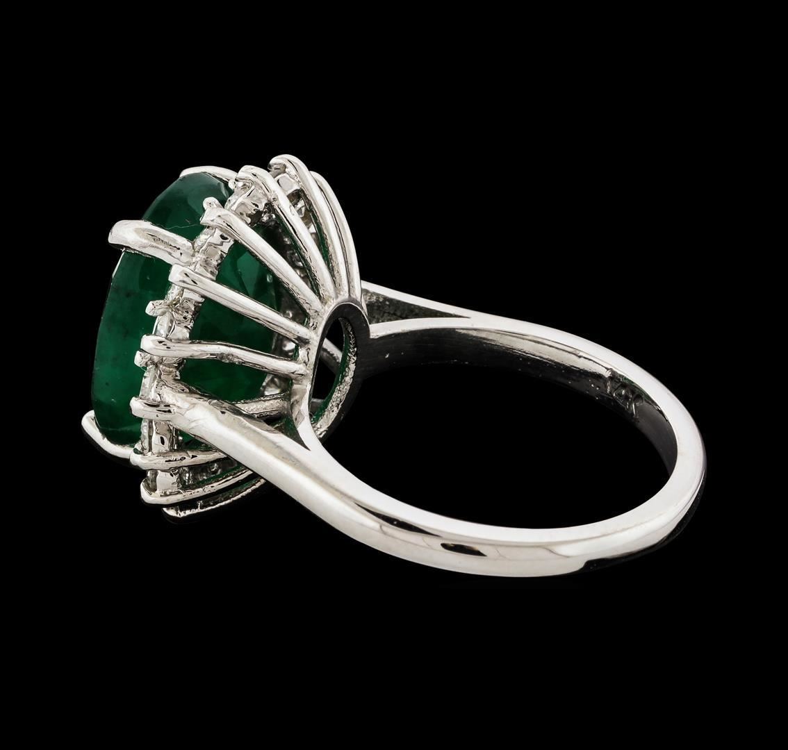 One electronically tested 14KT white gold lady's cast fashion ring with a basket halo with a bright polish finish. The featured lady's ring has a shank measuring 2.05 millimeters wide. Identified with markings of '14K'. Condition is new, good workmanship. Containing: One prong set oval modified mixed cut natural emerald, measuring 13.89 x 10.73 x 7.41mm, (depth est.) 14%. bulge factor, approximate weight of 7.18ct., clarity is heavily included, medium dark, moderately strong, green color, (GIA G 6/4), cut is good. Transmitting light somewhat diffusely, semi-transparent to translucent. Naturally occurring internal & external characteristics are present. Indications of oil residue. Colored gemstones are presumed to have been subjected to commonly used enhancement processes. Graded in the setting. Sixteen prong set round brilliant cut diamonds, measuring 2.40 - 2.30 x 1.41mm (depth est.) approximate total weight of 16 Stones = 0.76ct. Graded in the setting. Clarity SI-1 to SI-2. Color: G - H Cut Good. Total Weight of Colored Stones 7.18ct.. Total Weight of Diamonds 0.76ct.. Total Weight of Ring 7.00gm GAS Appraised.