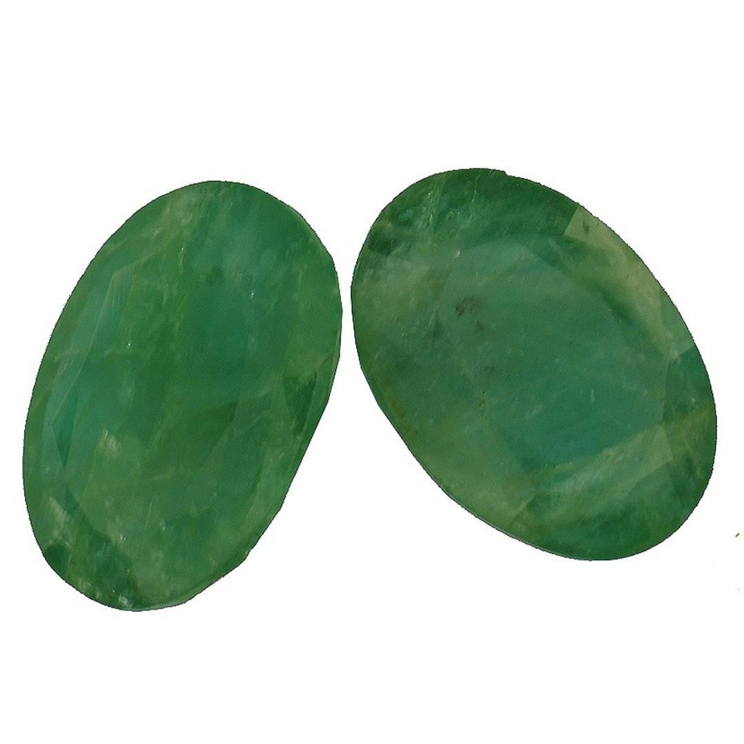 Two oval mixed cut natural emeralds, measuring 12.10 x 8.50 x 5.00mm, exact total weight 7.22ct., clarity is heavily included, medium dark, very slightly grayish, very slightly bluish green color, (GIA vslbG 6/3), cut is good. Transmitting light somewhat diffusely, translucent, Naturally occurring internal & external characteristics are present, Indications of multiple laboratory enhancements, including high temperature heat treatment. Westfield Appraised.