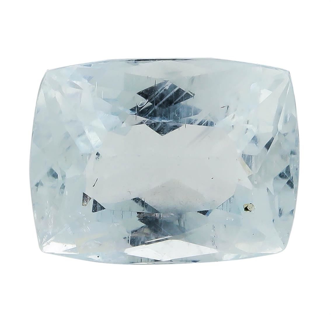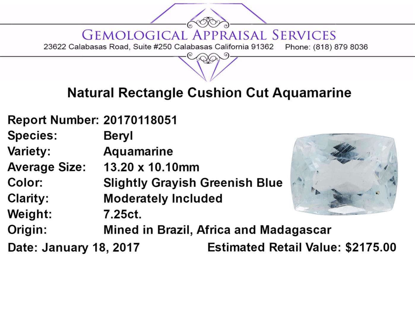 One natural rectangle cushion cut aquamarine with an exact weight of 7.25ct., clarity is moderately included, slightly grayish greenish blue. Gemological Appraisals Services estimates the retail value at $2175 GAS Appraised.