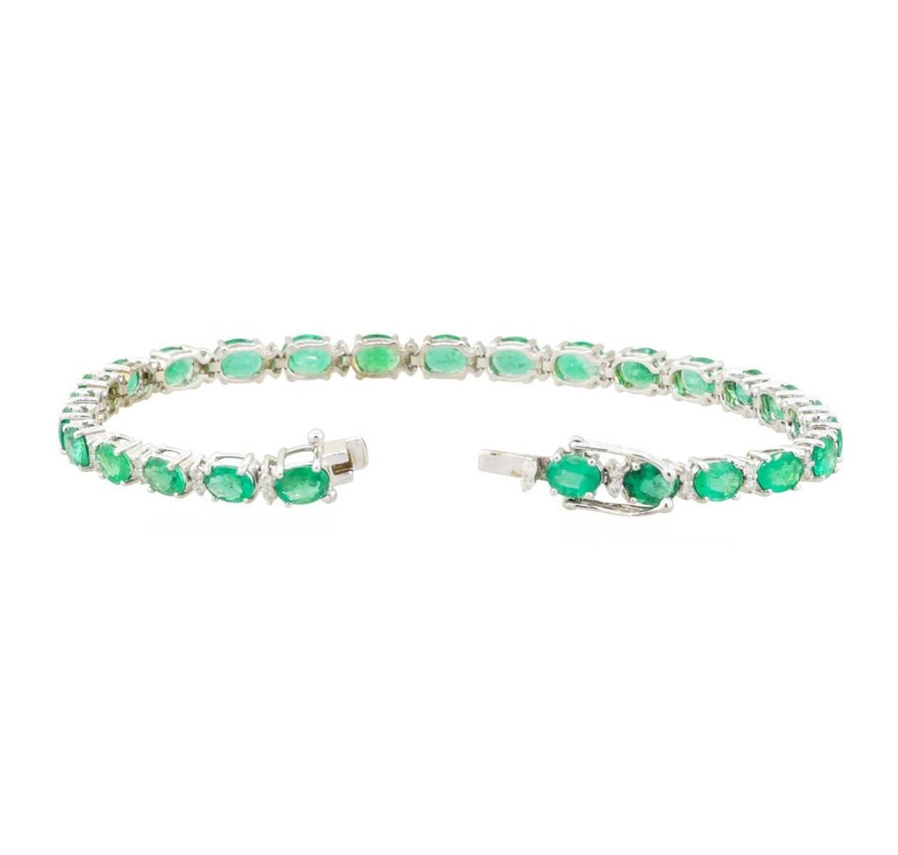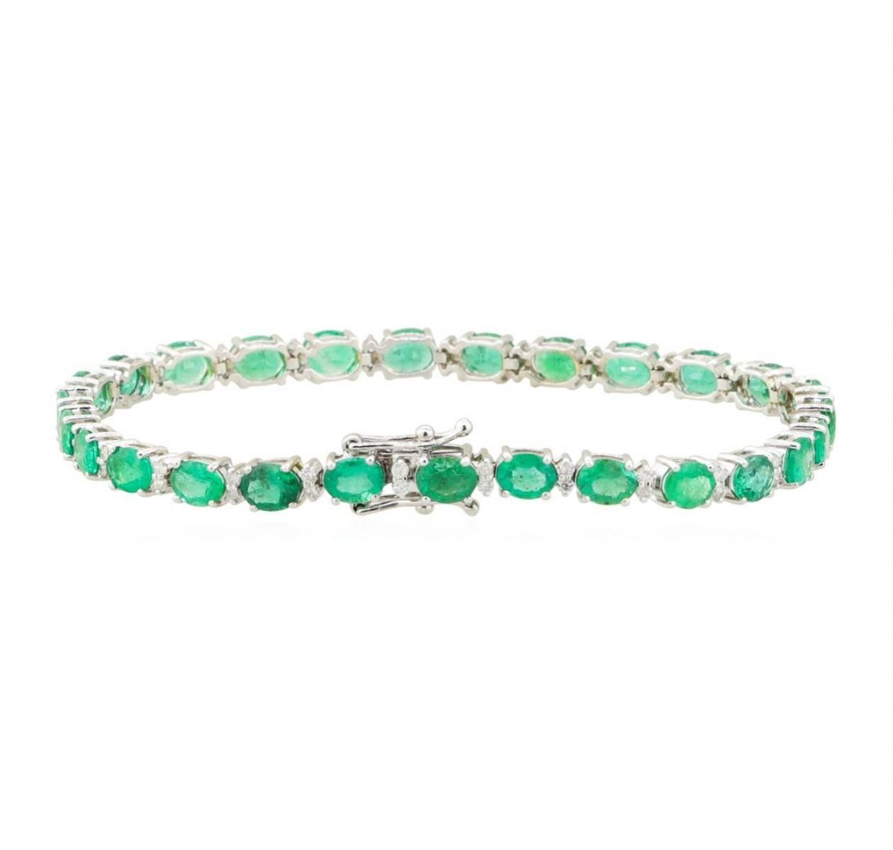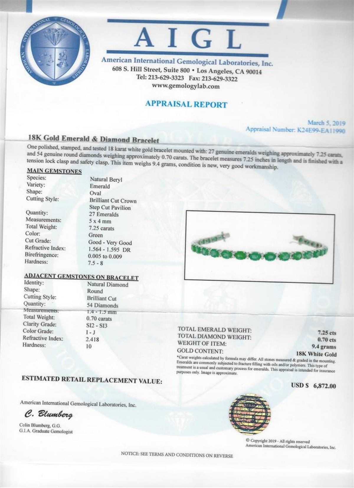One polished, stamped, and tested 18 karat white gold bracelet mounted with: 27 genuine anemlds weighing ' 7.25 mi; and 54 genuine round diamonds weighing approximately 0.70 carats. The bracelet measures 7_25 inches in length and is ?nished Wih a tension lock clasp and safety clasp. This item weighs 9.4 grams, condition is new, very good workmanship. Species: Natural Beryl Variety: Emerald Shape: Oval Cutting Style Brilliant Cut Crown Step Cut Pavilion Quantity: 27 Emeralds Total Weight: 7.25 carats Color: Green Cut Grade: Good - Very Good Refractive Index: 1.564 - 1.595 DR Birefringence: 0.005 to 0.009 Hardness: 7.5 -8 ADJACENT GEMSTONES ON BRACELET Identity: Natural Diamond Shape: Round Cutting Style: Brilliant Cut Quantity: 54 Diamonds Measurements: 1.4-1.5mm. Total Weight: 0.70 carats Clarity Grade: SI2-SI3 Color Grade: I-J Refreactive Index 2.418 Hardness: 10 TOTAL EMERALD WEIGHT: 7.25 cts TOTAL DIAMOND WEIGHT 0.7cts WEIGHT OF ITEM: 9.4 grams GOLD CONTENT: 18K White Gold Estimated RETAIL REPLACEMENT VALUE $6,872.00 US.