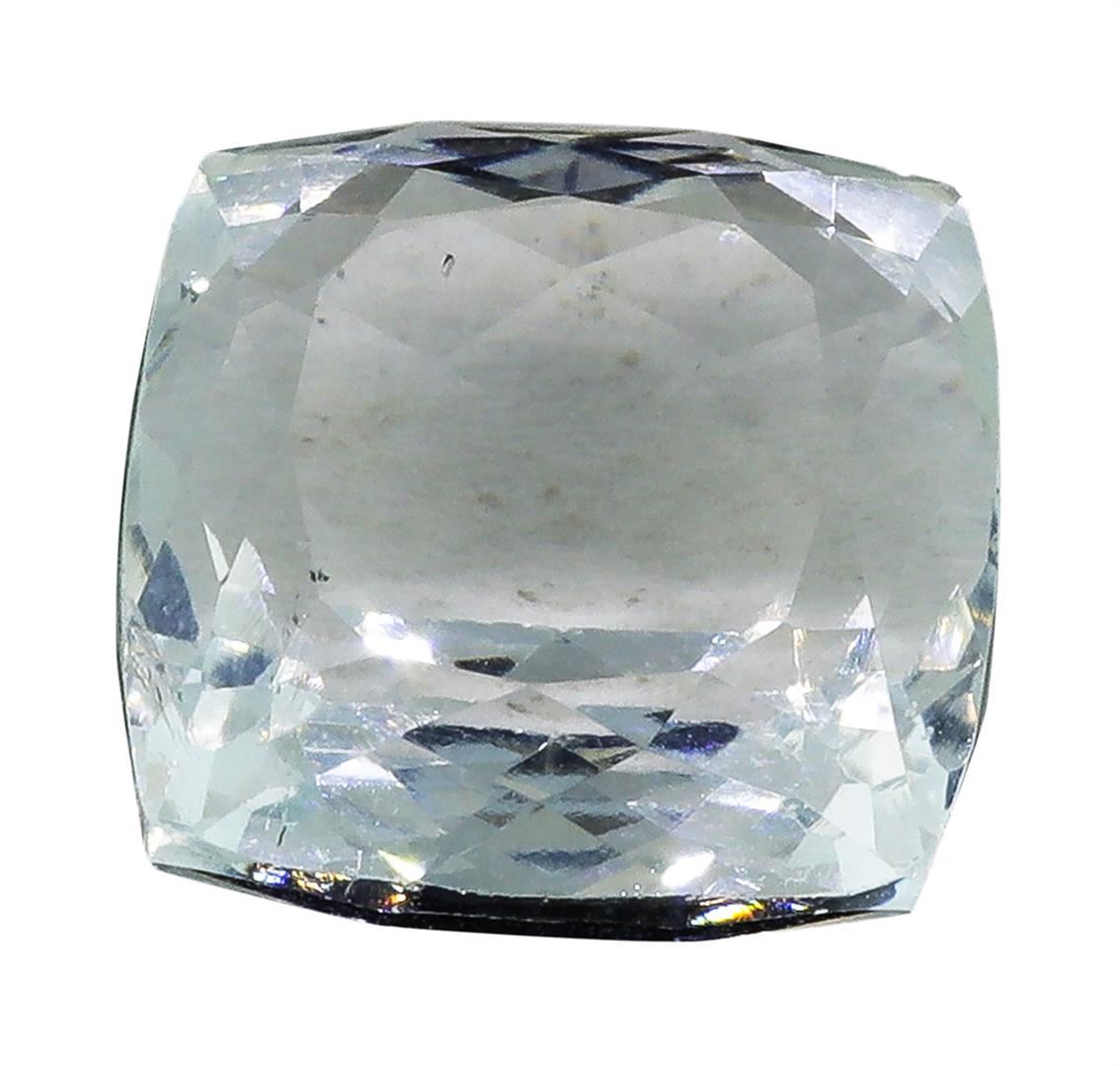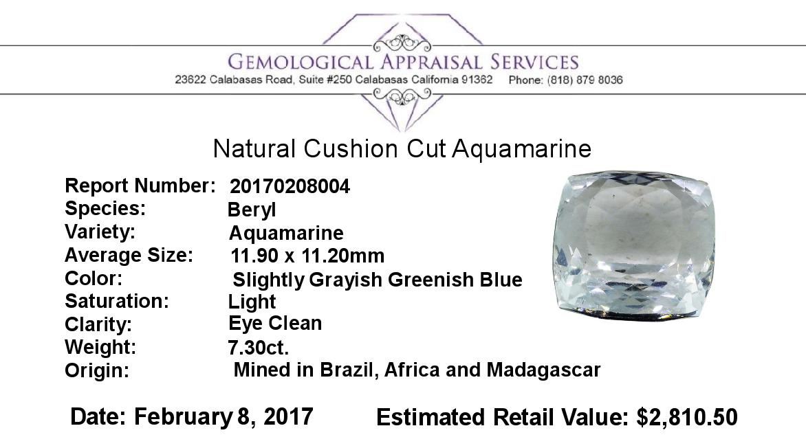 One natural cushion cut aquamarine with an exact weight of 7.30ct., clarity is eye clean, slightly grayish greenish blue, light. Gemological Appraisals Services estimates the retail value at $2810.5 GAS Appraised.