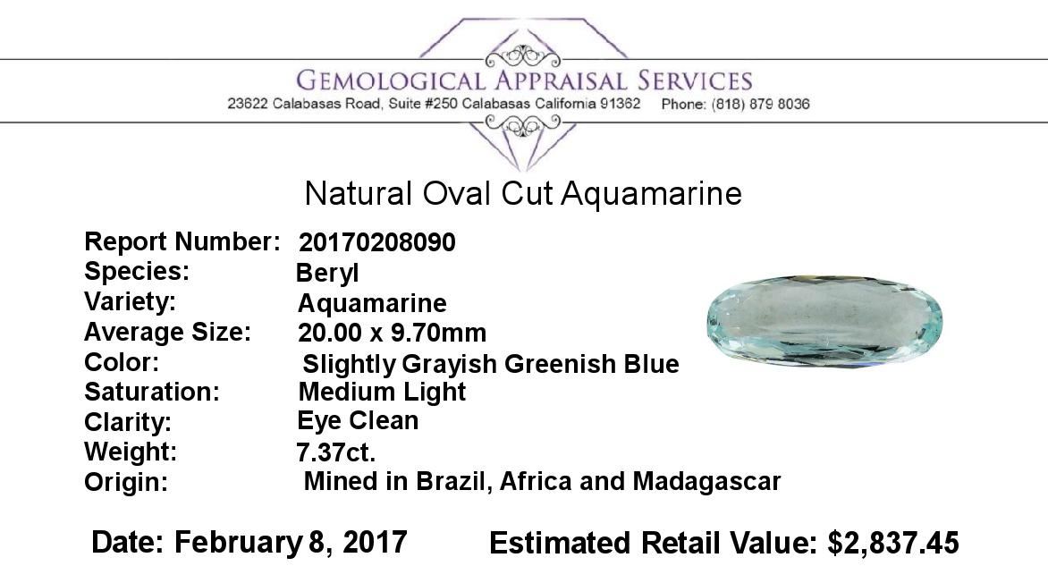 One natural oval cut aquamarine with an exact weight of 7.37ct., clarity is eye clean, slightly grayish greenish blue, medium light. Gemological Appraisals Services estimates the retail value at $2837.45 GAS Appraised.