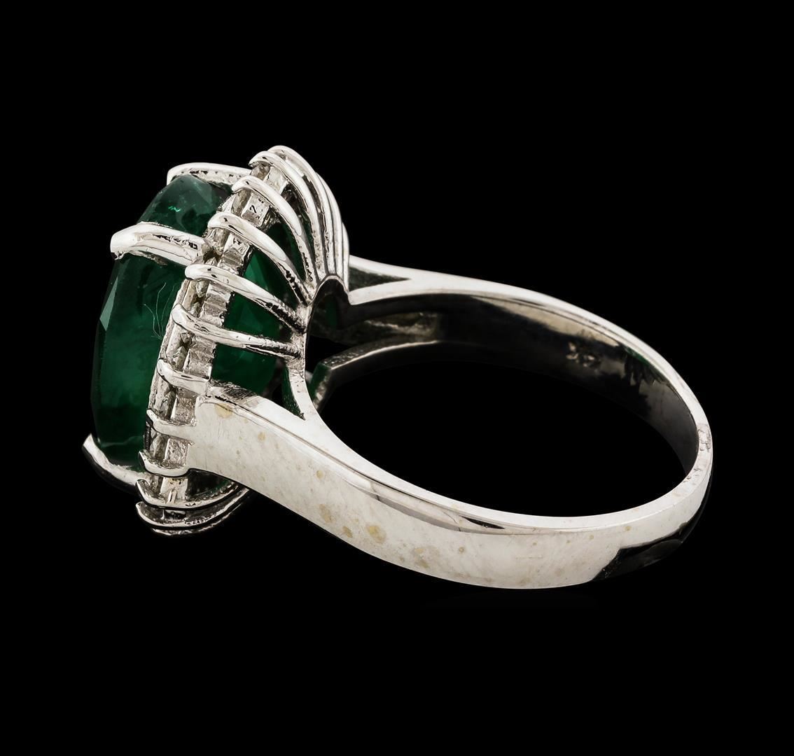 One electronically tested 14KT white gold lady's cast fashion ring with a basket halo with a bright polish finish. The featured lady's ring has a shank measuring 2.80 millimeters wide. Identified with markings of '14K'. Condition is new, good workmanship. Containing: One prong set oval modified mixed cut natural emerald, measuring 14.15 x 11.14 x 7.28mm, (depth est.) 13%. bulge factor, approximate weight of 7.42ct., clarity is heavily included, medium dark, moderately strong, green color, (GIA G 6/4), cut is good. Transmitting light somewhat diffusely, semi-transparent to translucent. Naturally occurring internal & external characteristics are present. Indications of oil residue. Colored gemstones are presumed to have been subjected to commonly used enhancement processes. Graded in the setting. Twenty-Two prong set round brilliant cut diamonds, measuring 1.95 - 1.85 x 1.16mm (depth est.) approximate total weight of 22 Stones = 0.56ct. Graded in the setting. Clarity VS-2 to SI-2. Color: G - H Cut Good. Total Weight of Colored Stones 7.42ct.. Total Weight of Diamonds 0.56ct.. Total Weight of Ring 7.50gm GAS Appraised.