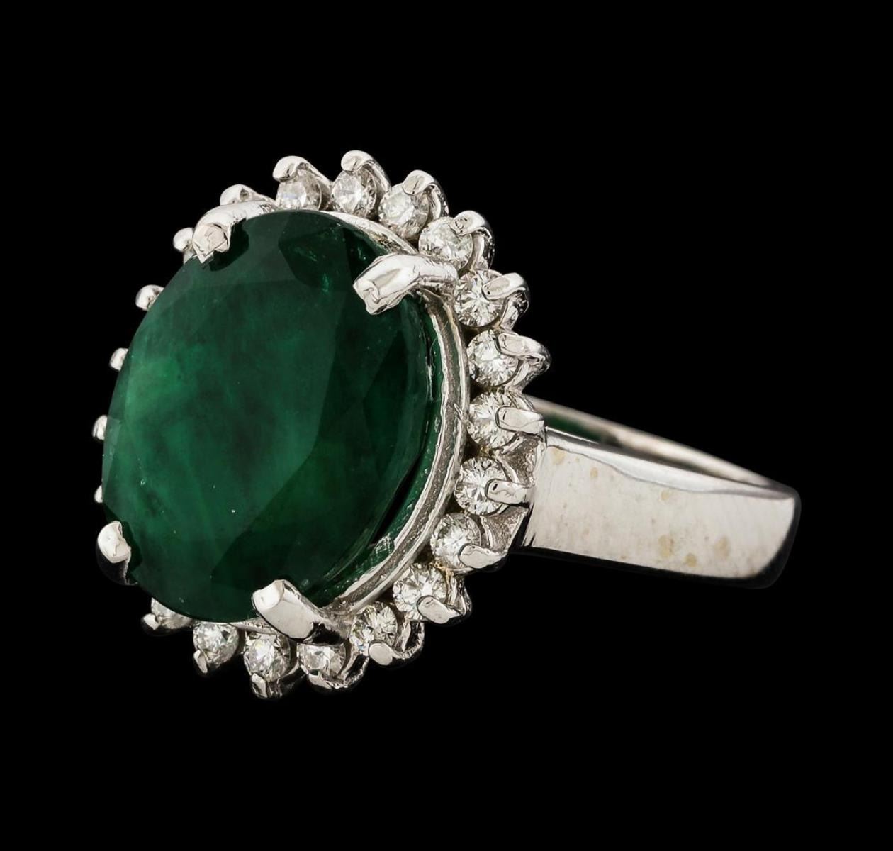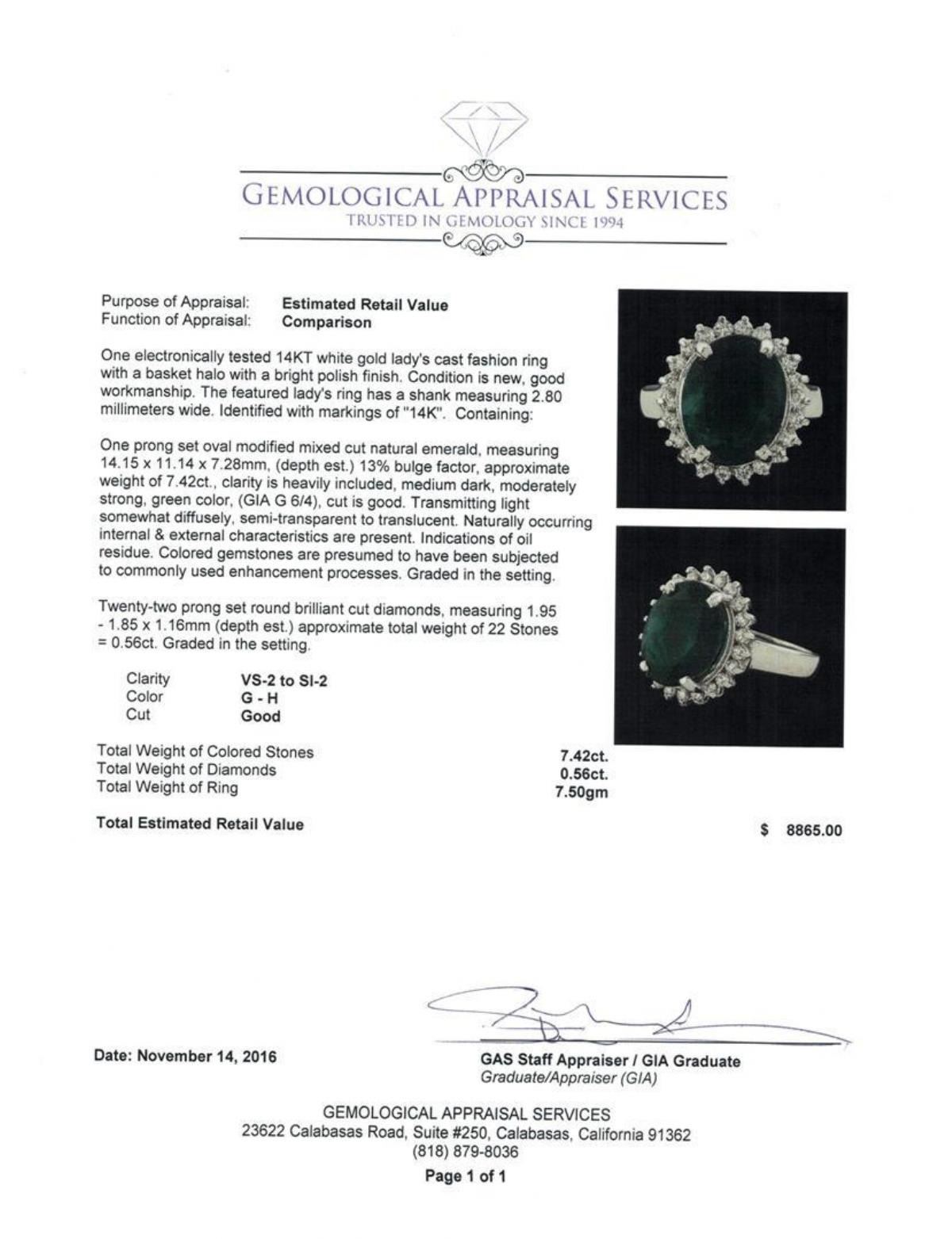 One electronically tested 14KT white gold lady's cast fashion ring with a basket halo with a bright polish finish. The featured lady's ring has a shank measuring 2.80 millimeters wide. Identified with markings of '14K'. Condition is new, good workmanship. Containing: One prong set oval modified mixed cut natural emerald, measuring 14.15 x 11.14 x 7.28mm, (depth est.) 13%. bulge factor, approximate weight of 7.42ct., clarity is heavily included, medium dark, moderately strong, green color, (GIA G 6/4), cut is good. Transmitting light somewhat diffusely, semi-transparent to translucent. Naturally occurring internal & external characteristics are present. Indications of oil residue. Colored gemstones are presumed to have been subjected to commonly used enhancement processes. Graded in the setting. Twenty-Two prong set round brilliant cut diamonds, measuring 1.95 - 1.85 x 1.16mm (depth est.) approximate total weight of 22 Stones = 0.56ct. Graded in the setting. Clarity VS-2 to SI-2. Color: G - H Cut Good. Total Weight of Colored Stones 7.42ct.. Total Weight of Diamonds 0.56ct.. Total Weight of Ring 7.50gm GAS Appraised.