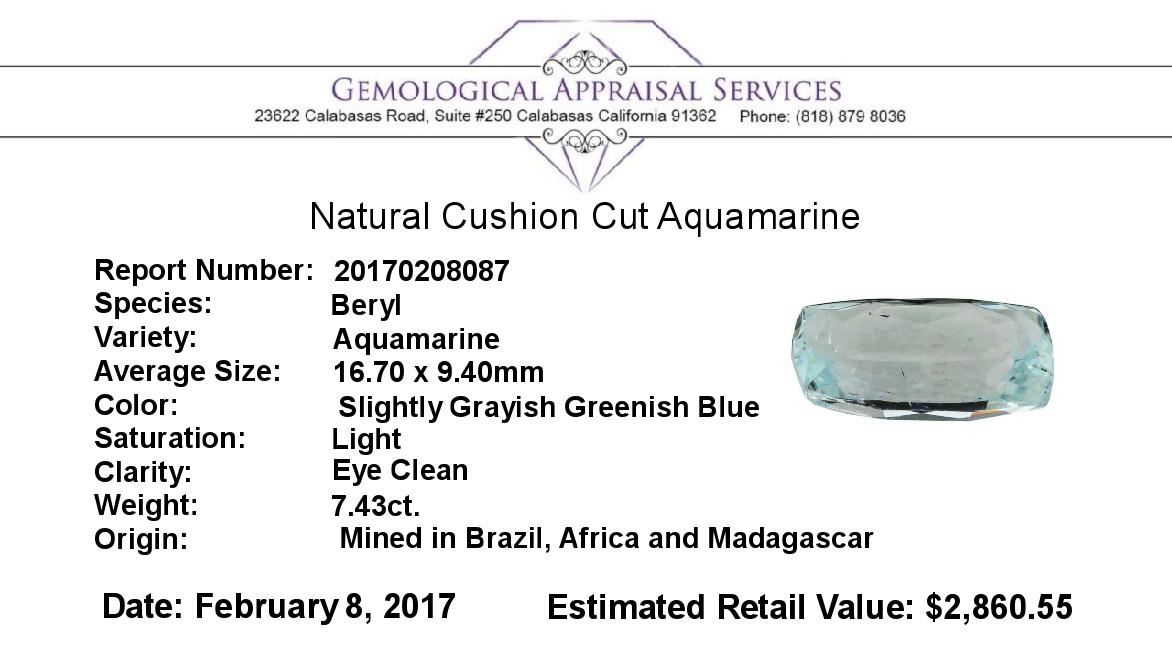 One natural cushion cut aquamarine with an exact weight of 7.43ct., clarity is eye clean, slightly grayish greenish blue, light. Gemological Appraisals Services estimates the retail value at $2860.55 GAS Appraised.