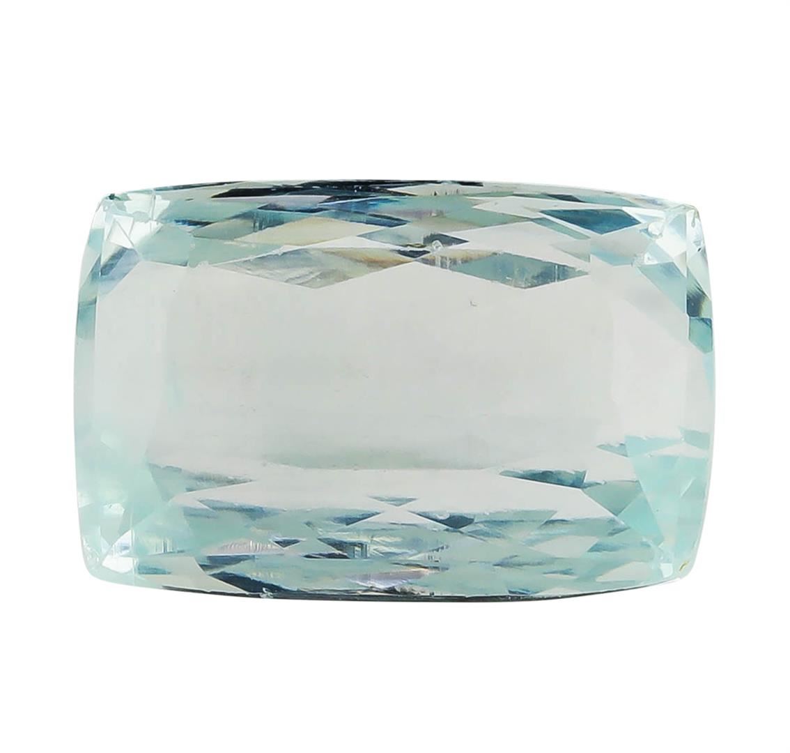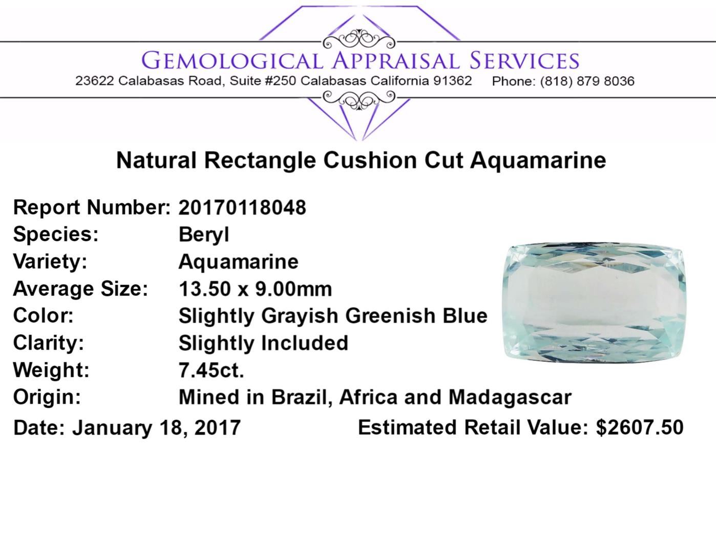 One natural rectangle cushion cut aquamarine with an exact weight of 7.45ct., clarity is slightly included, slightly grayish greenish blue. Gemological Appraisals Services estimates the retail value at $2607.5 GAS Appraised.